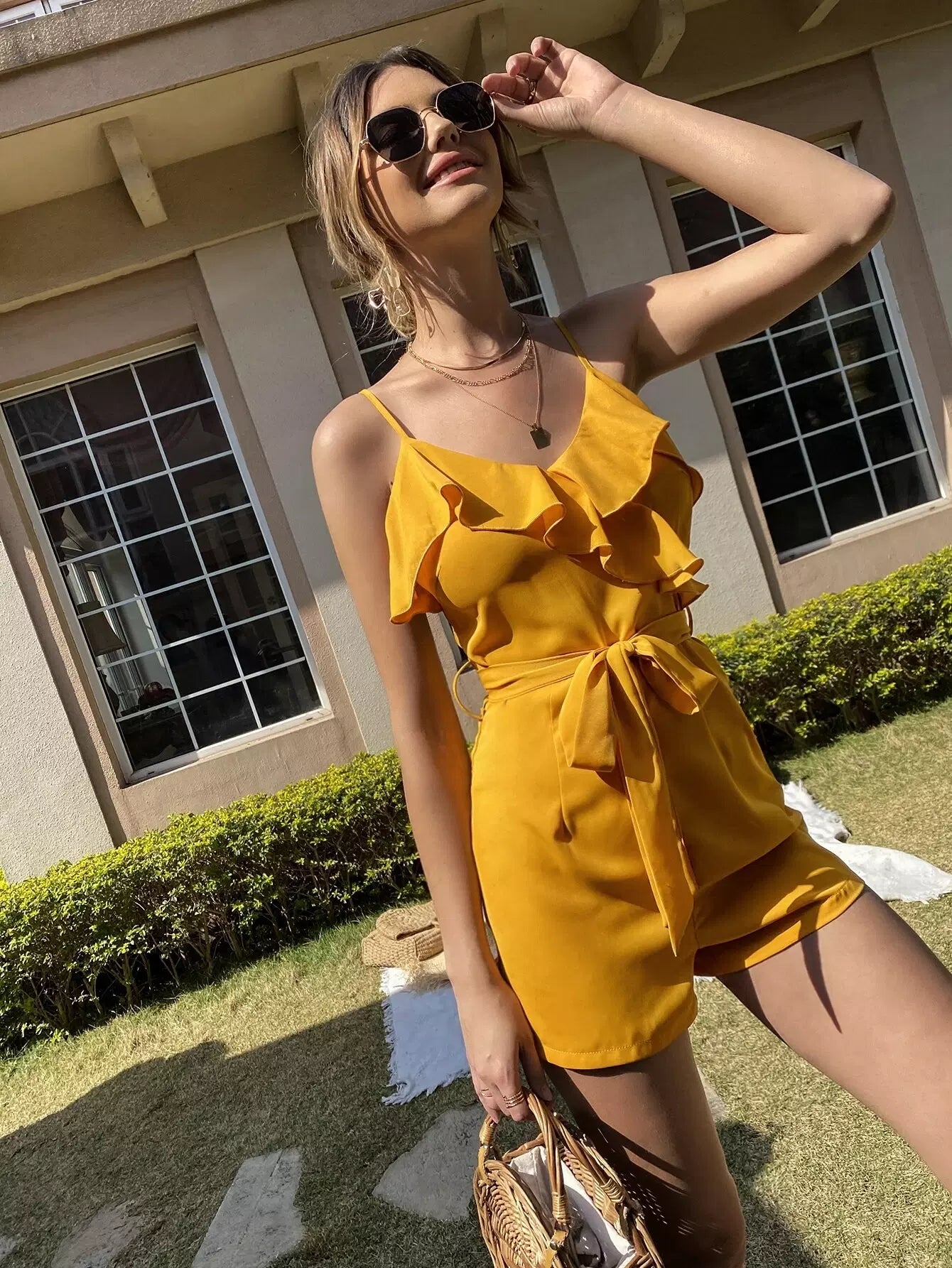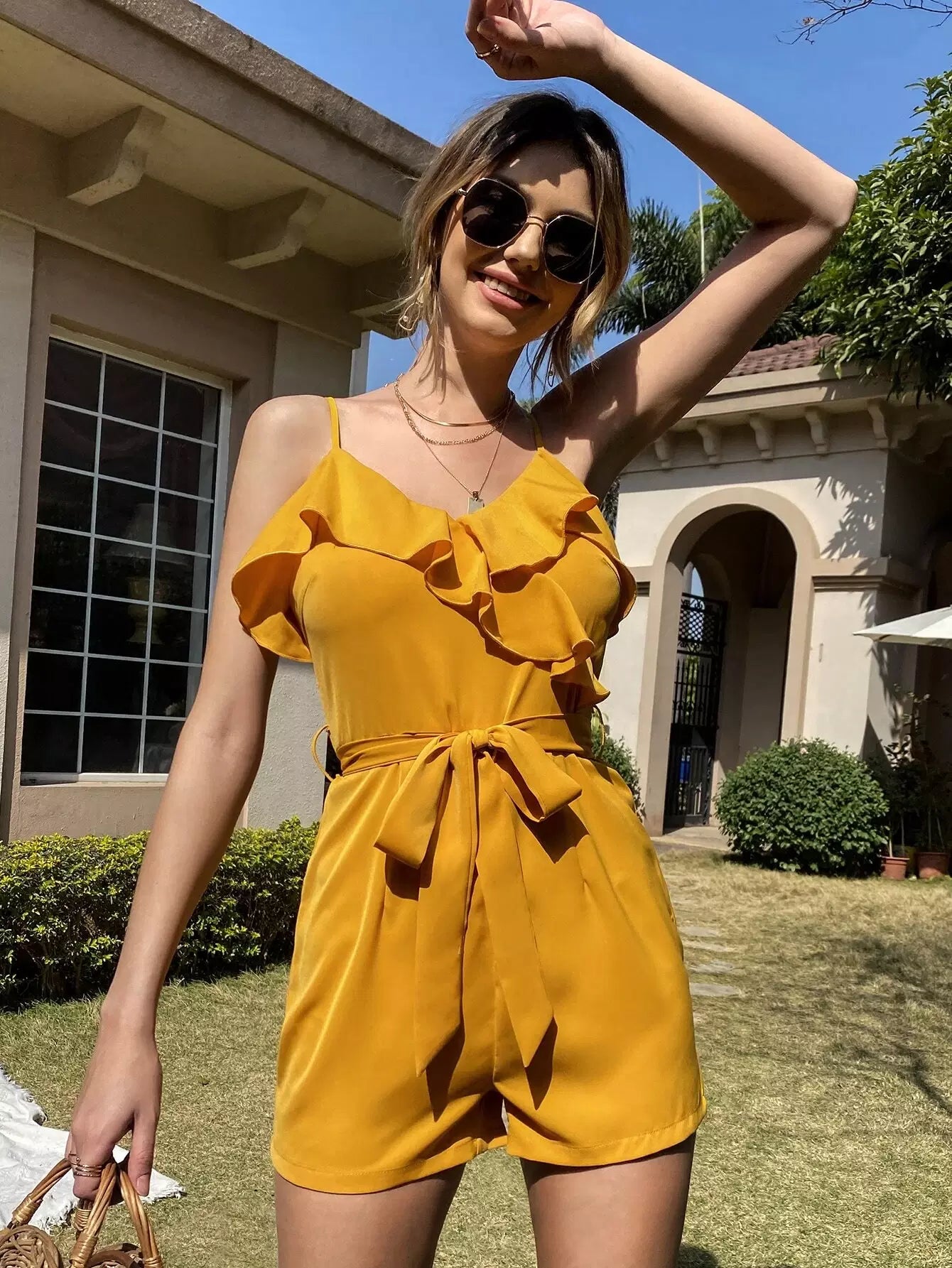 Solid Ruffle Trim Cami Romper Without Belt