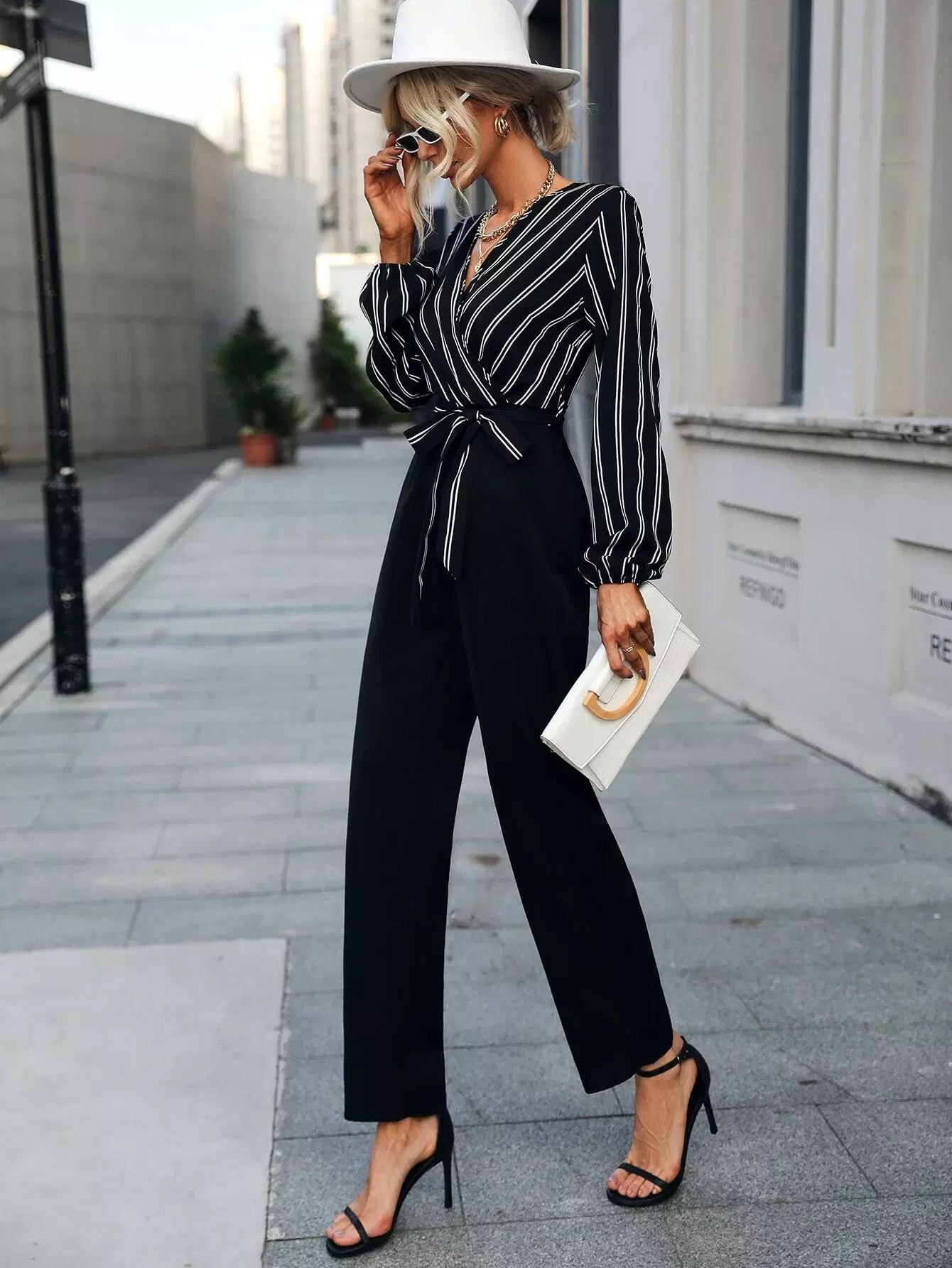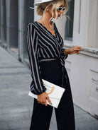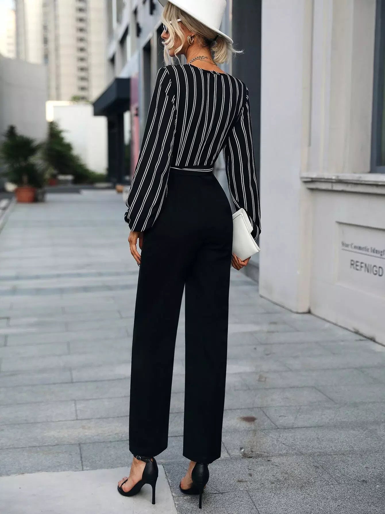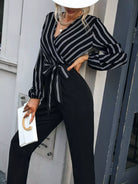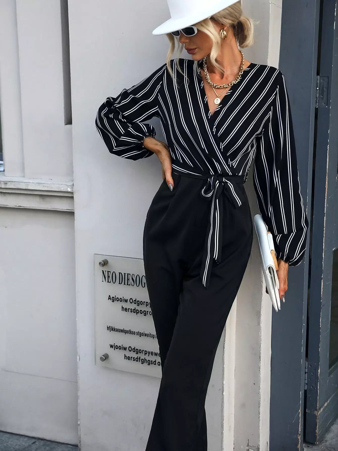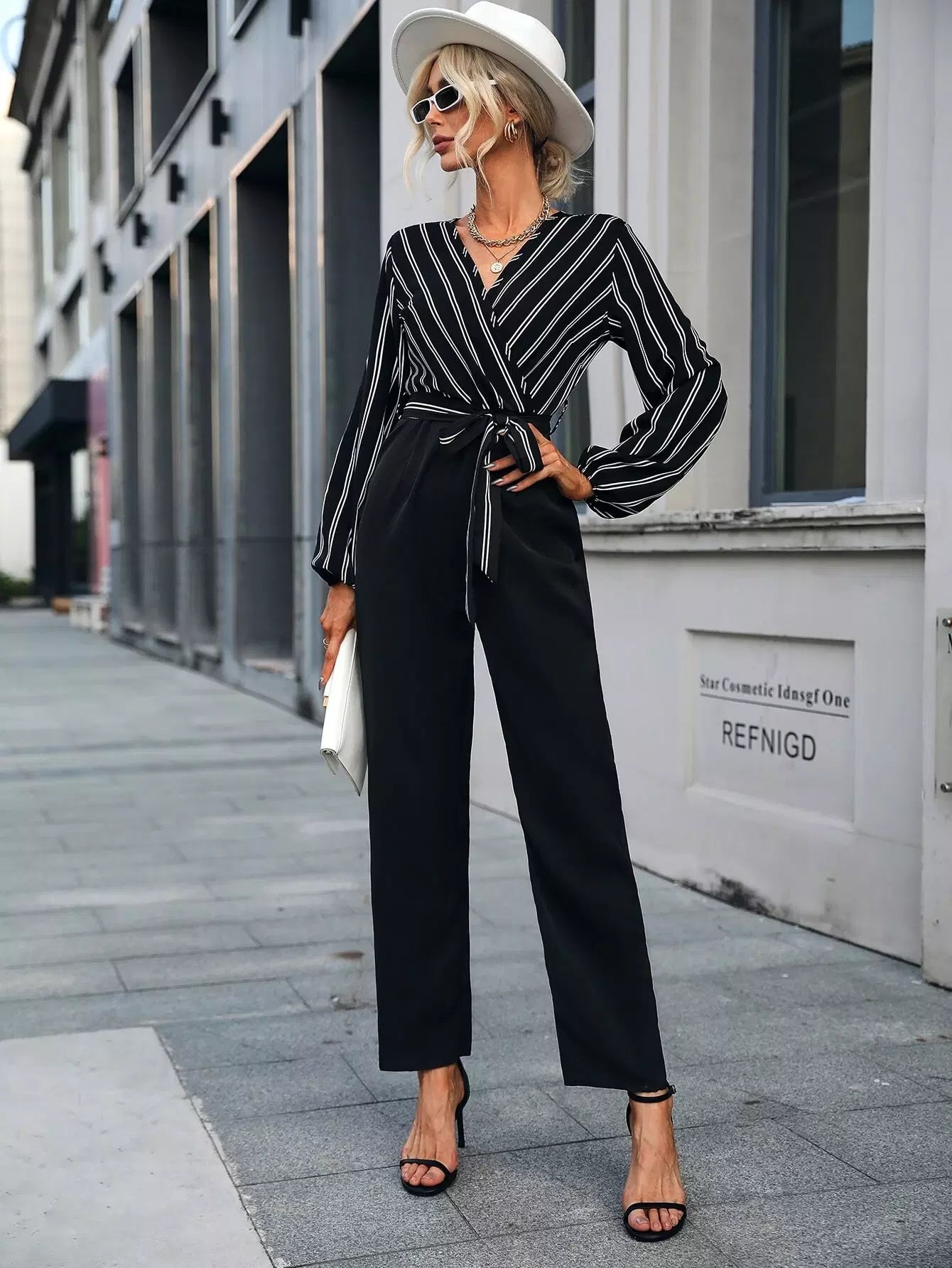 Striped Print Lantern Sleeve Jumpsuit Without Belt