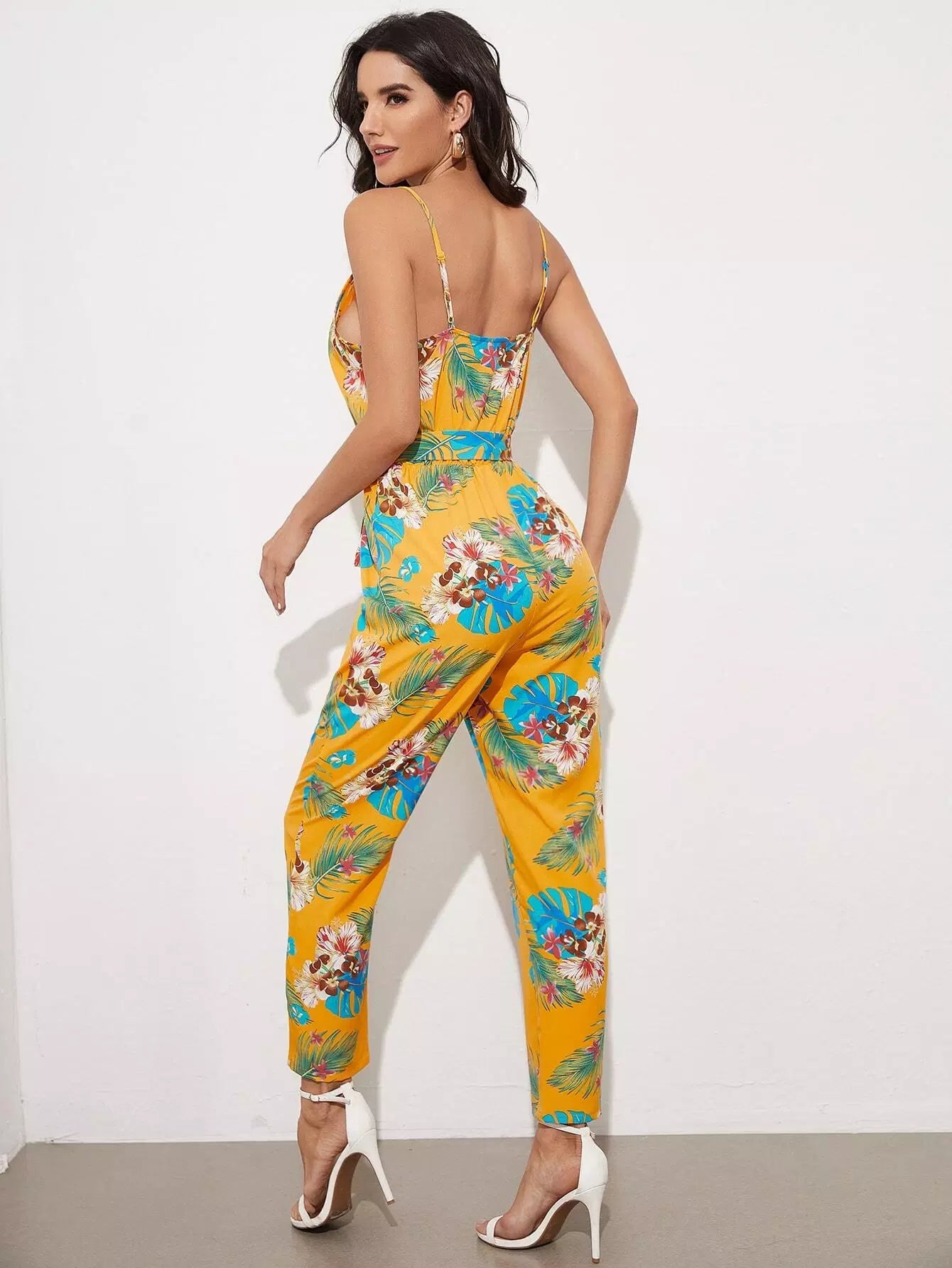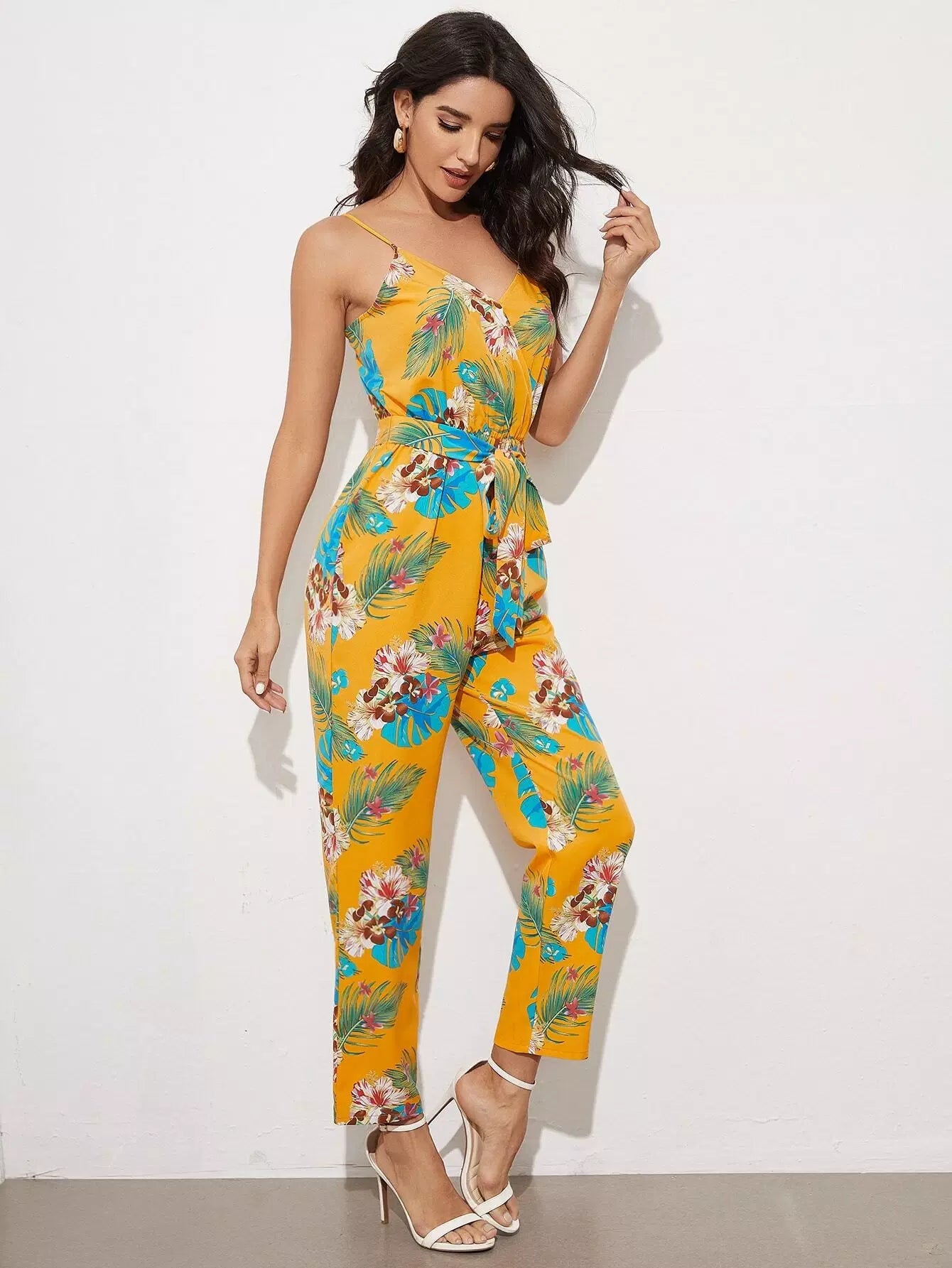 Women - Surplice Neck Self Belted Tropical Cami Jumpsuit