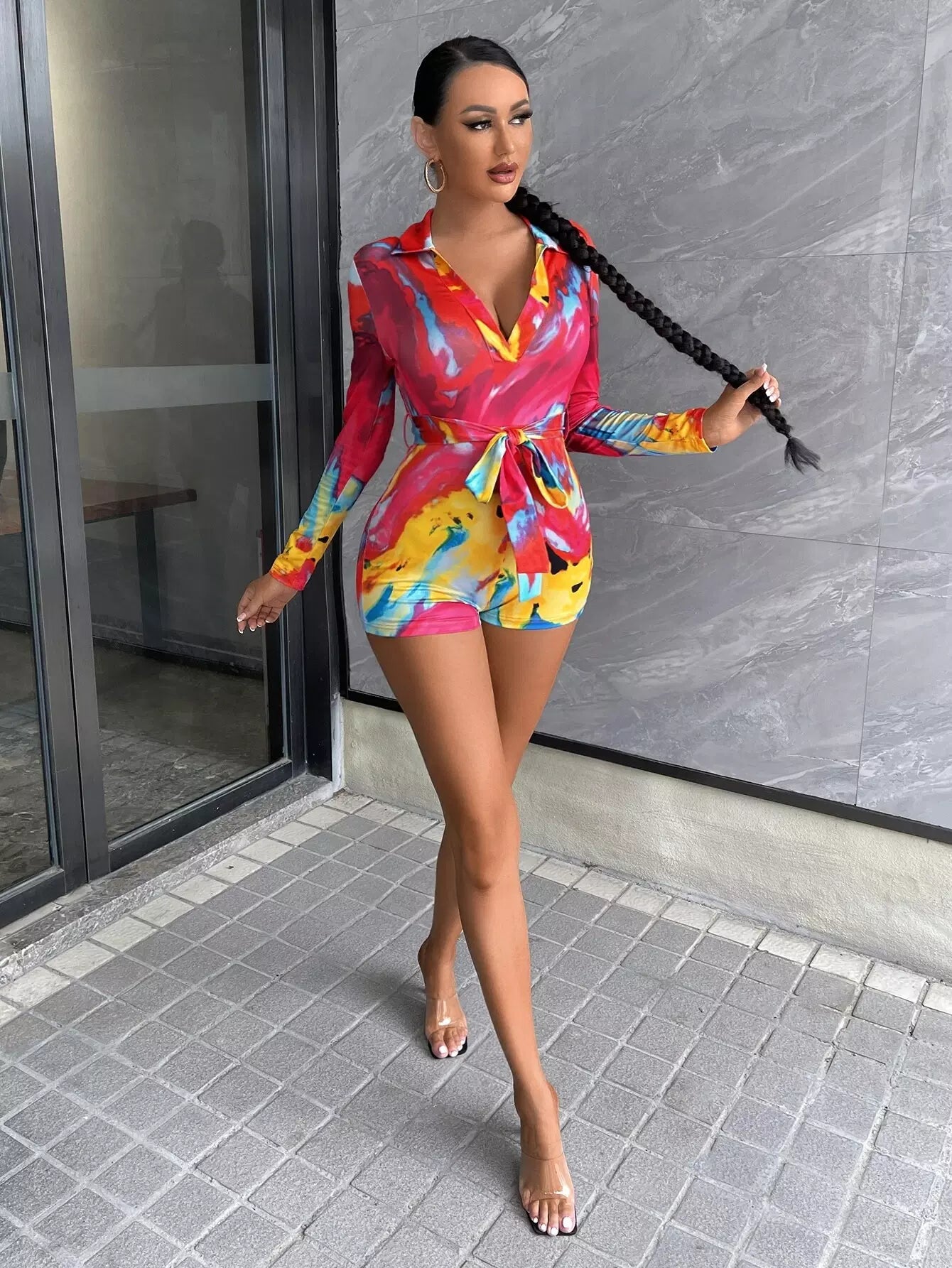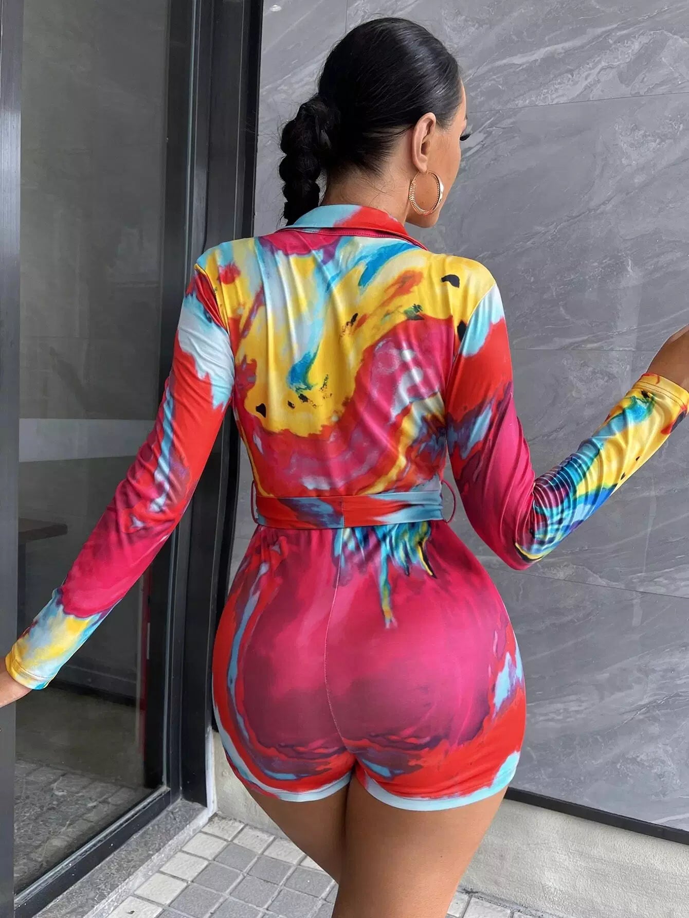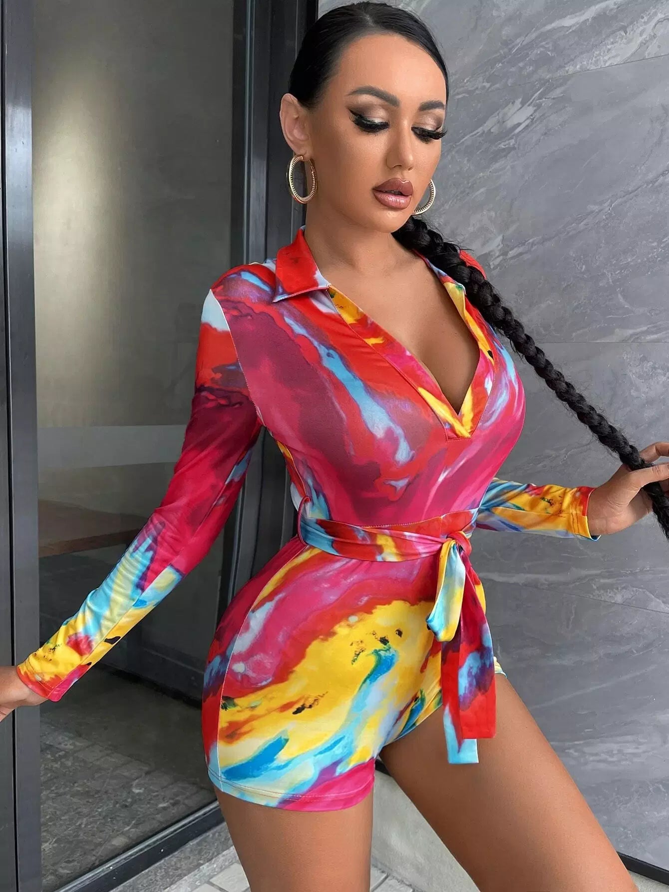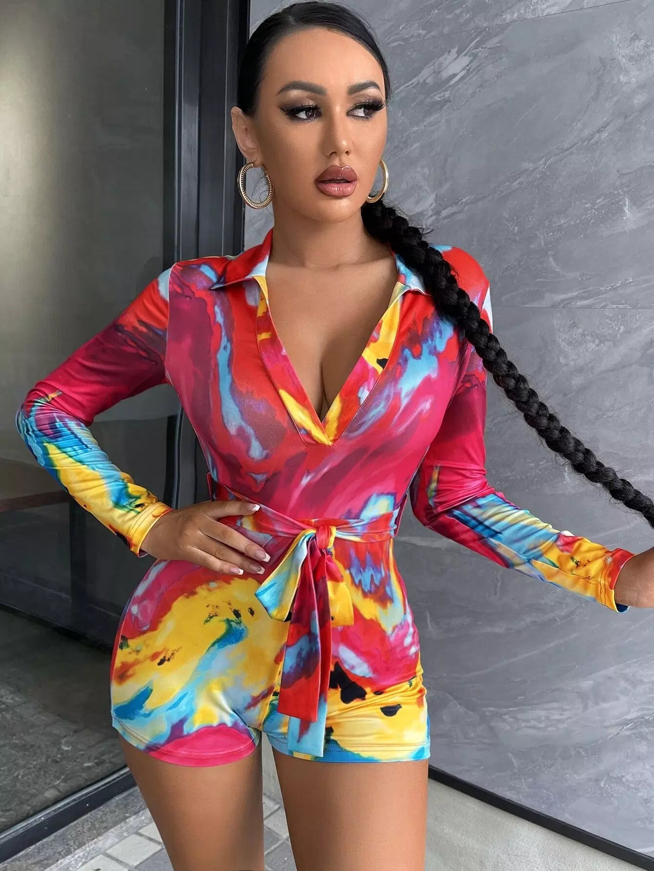 Tie Dye Plunging Neck Romper Without Belt