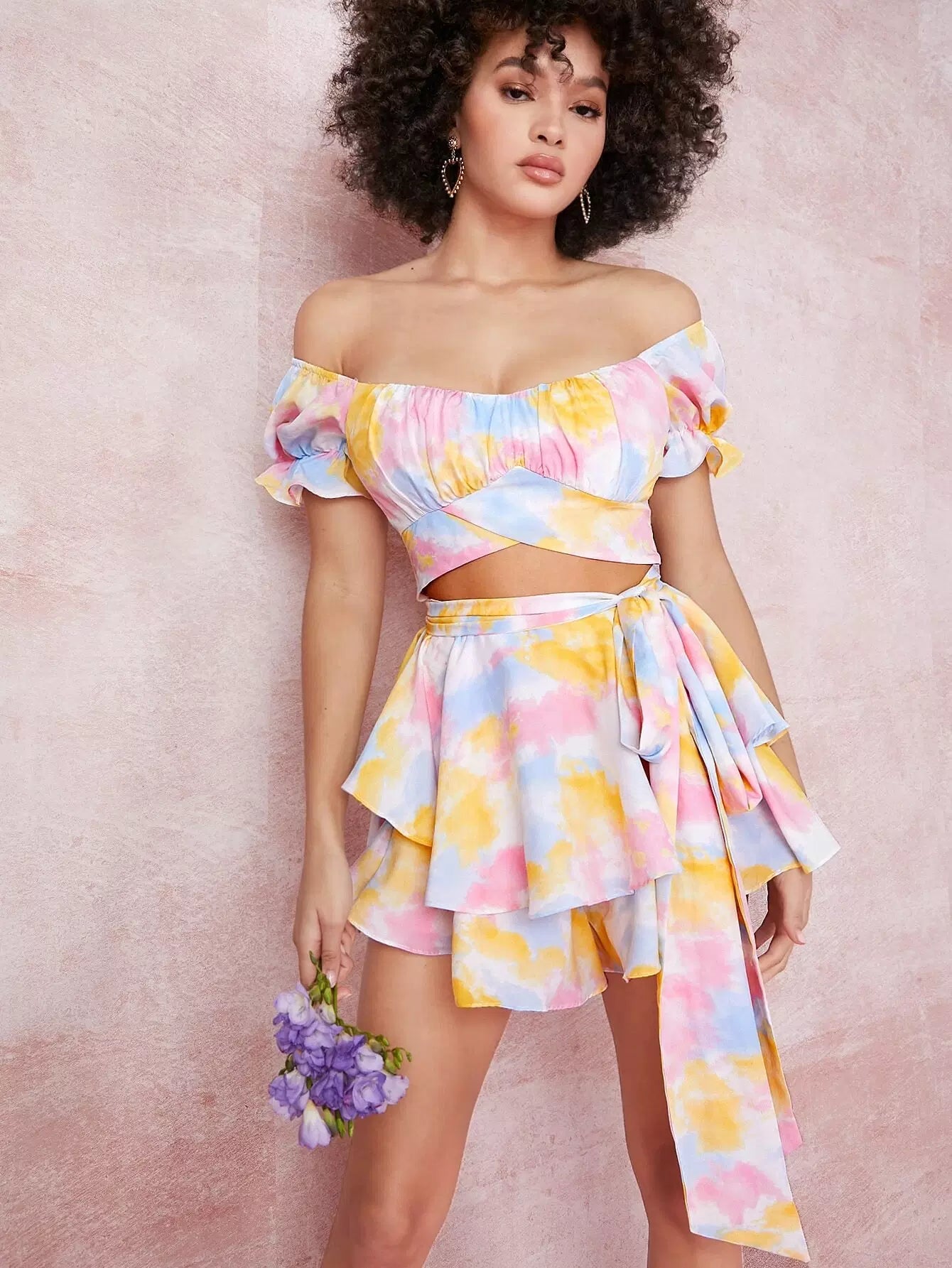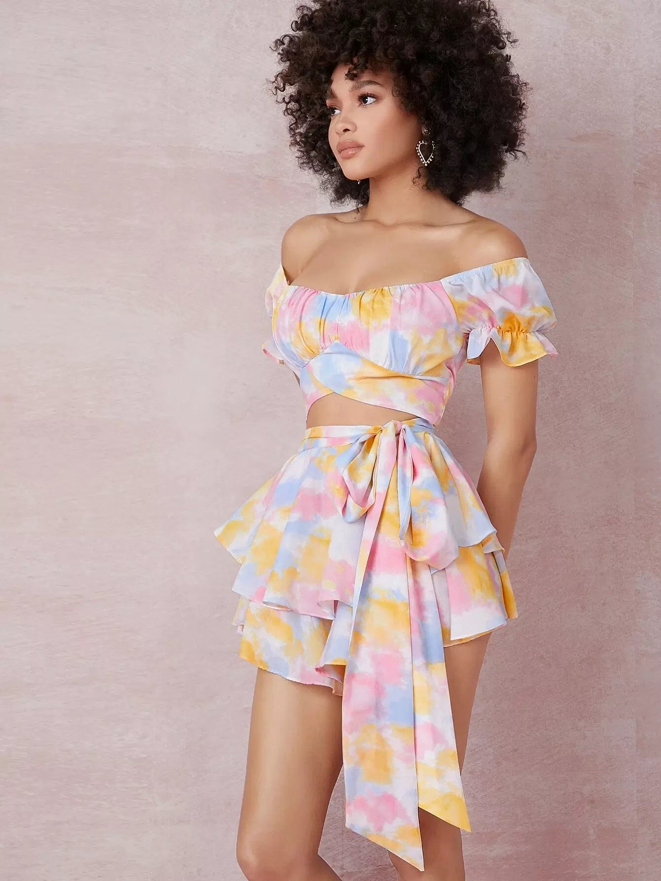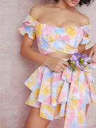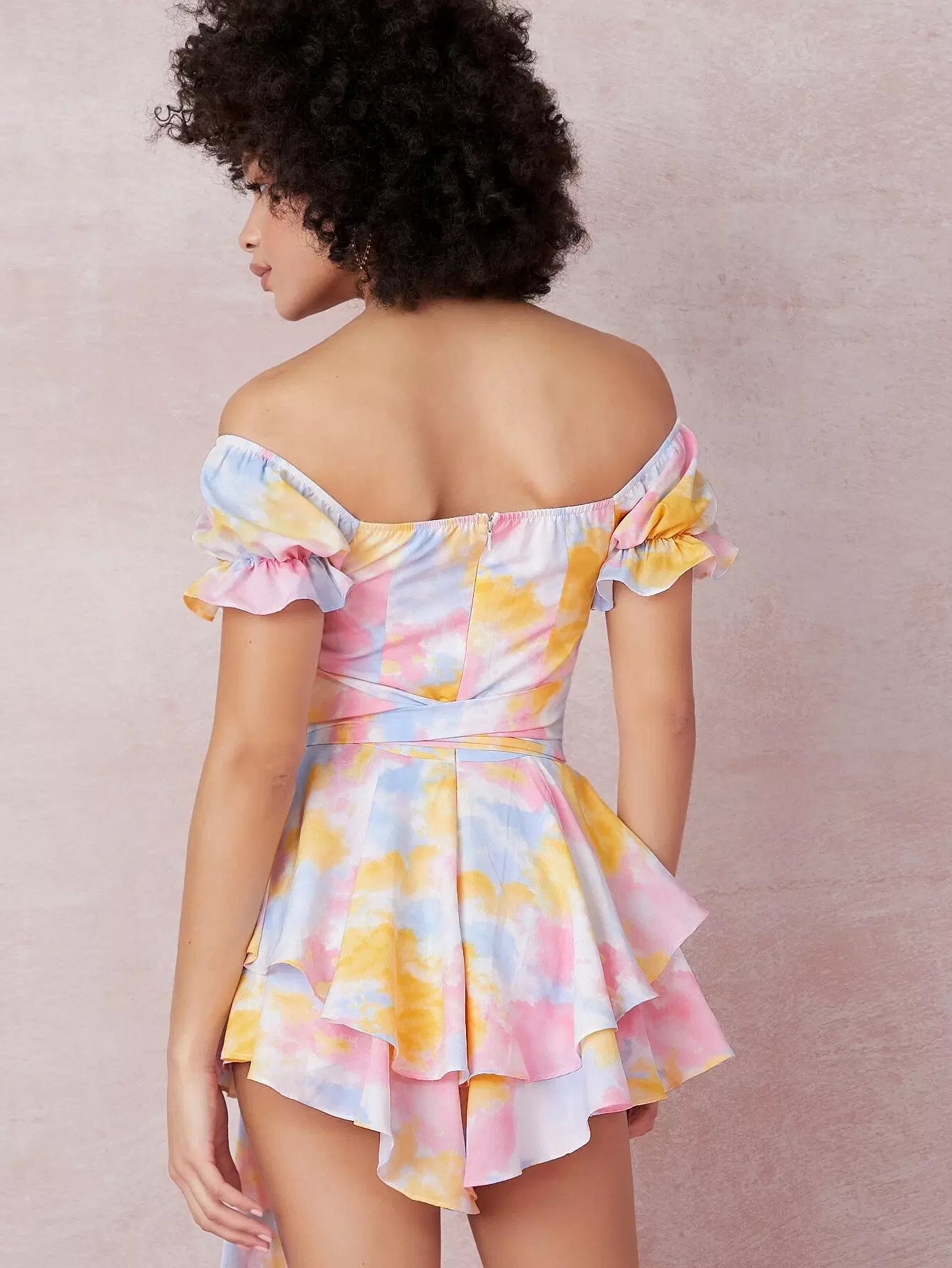 Tie-Dye Wash Cutout Ruffled Off-the-Shoulder Romper