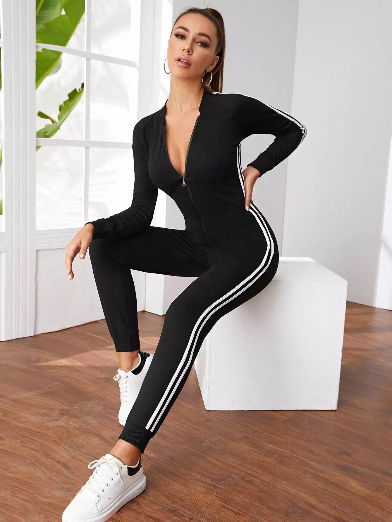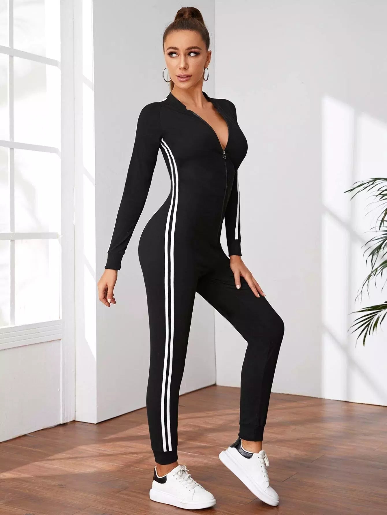 Zip Front Side Striped Jumpsuit