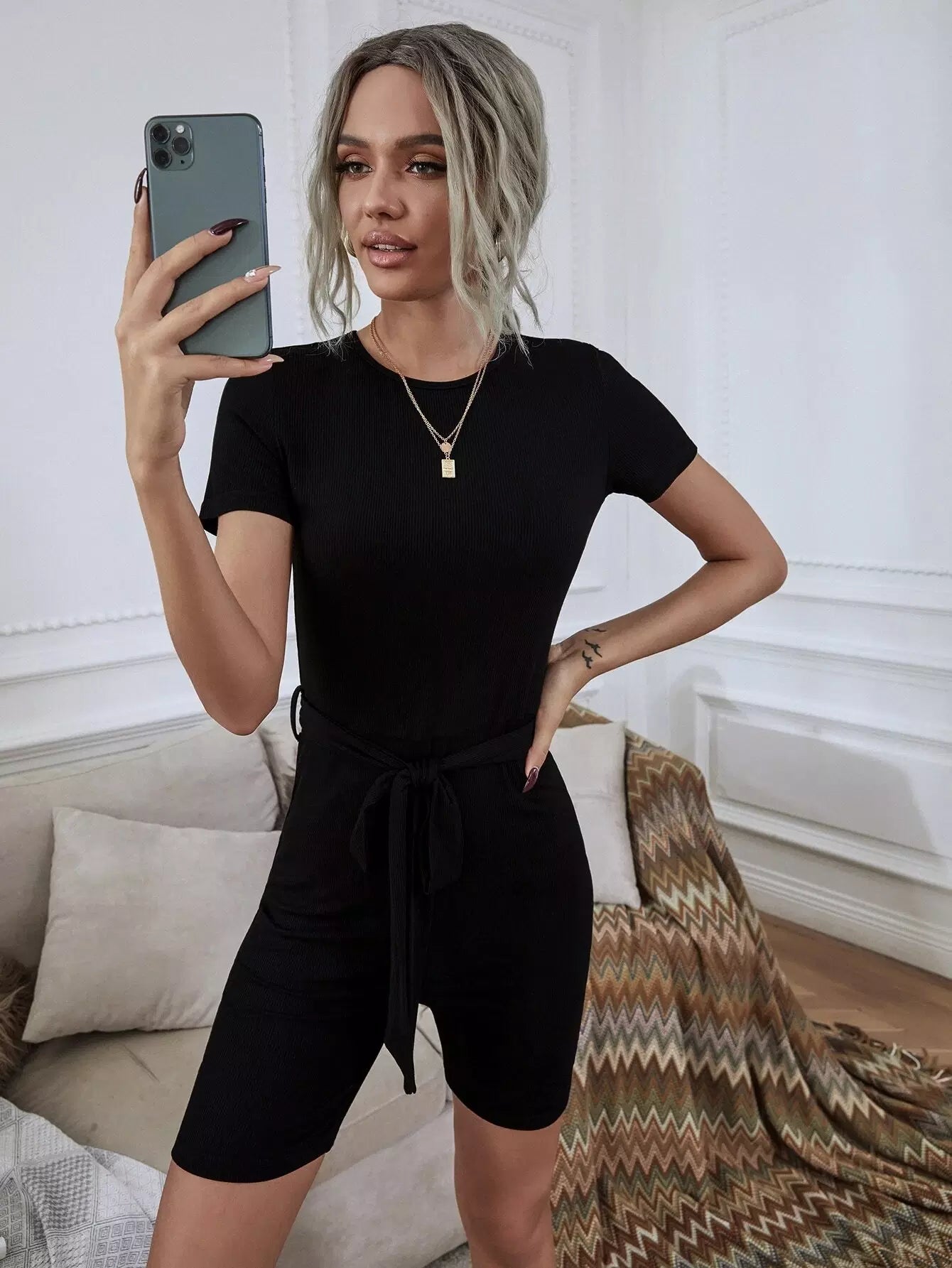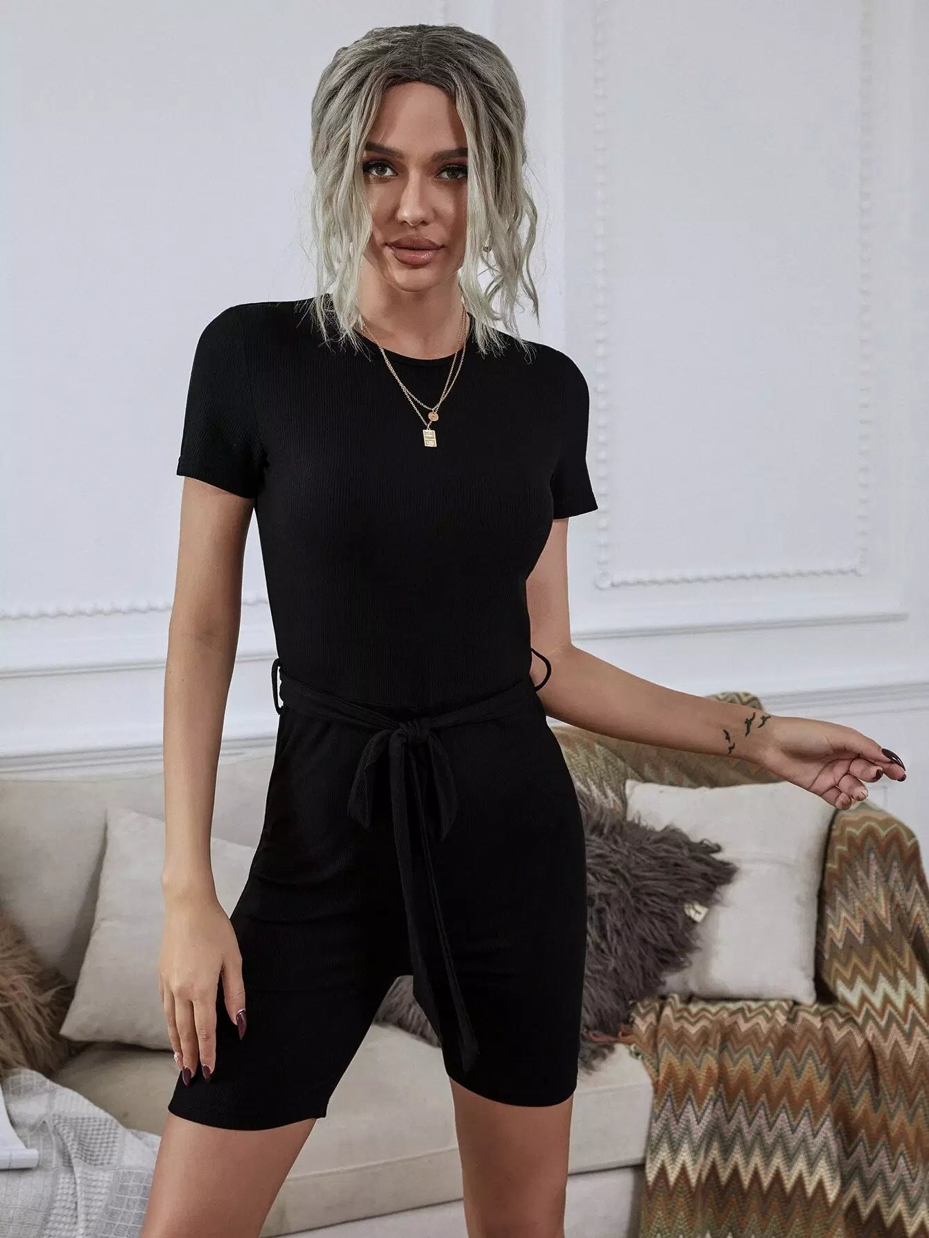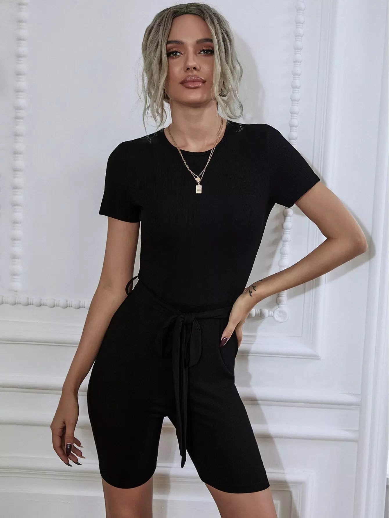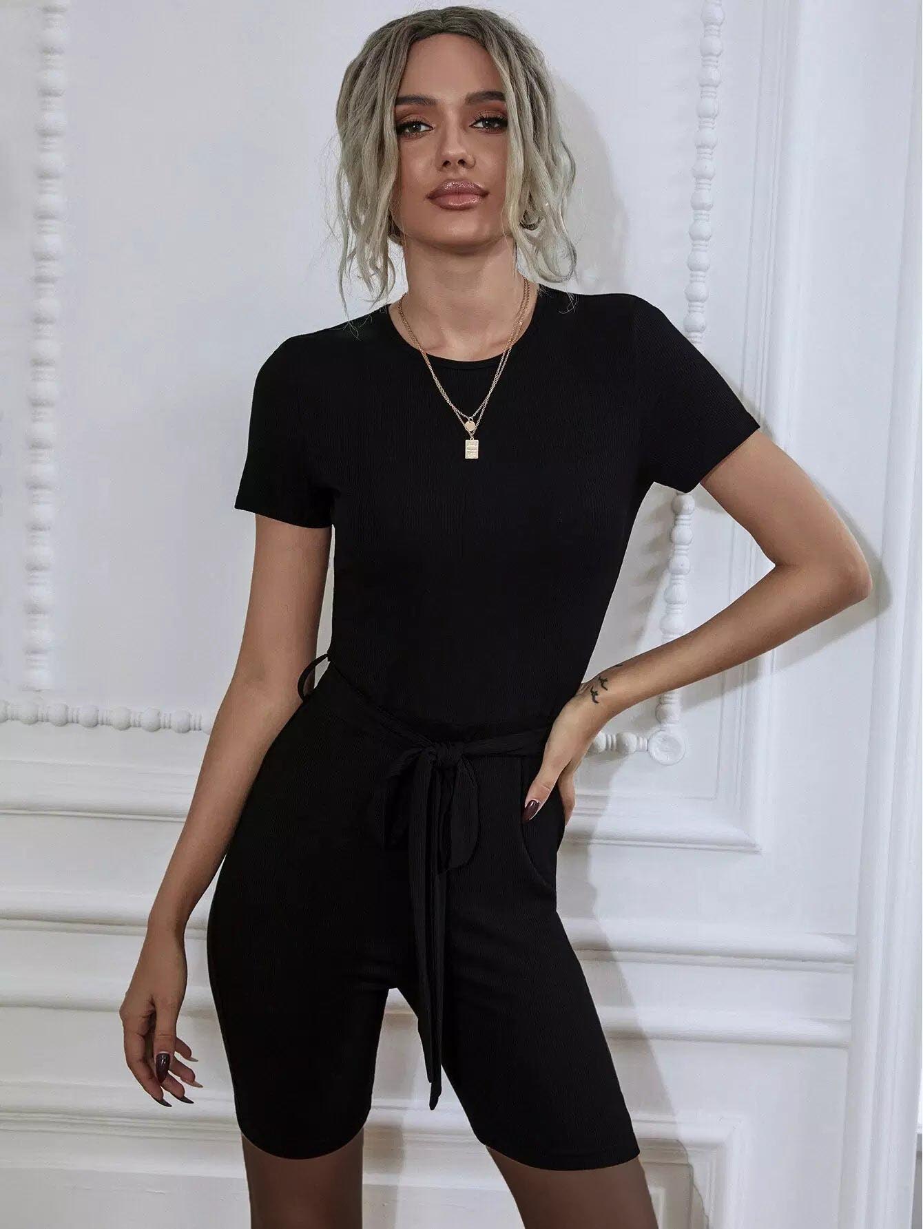 Women - Solid Round Neck Keyhole Back Belted Tee Romper
