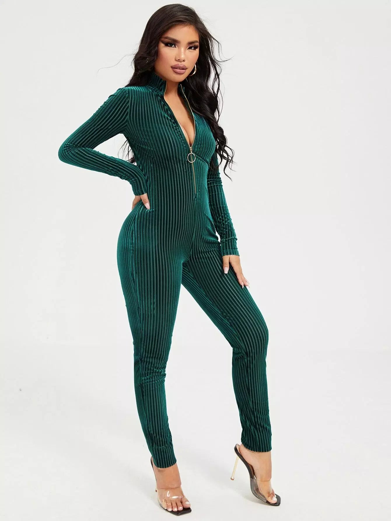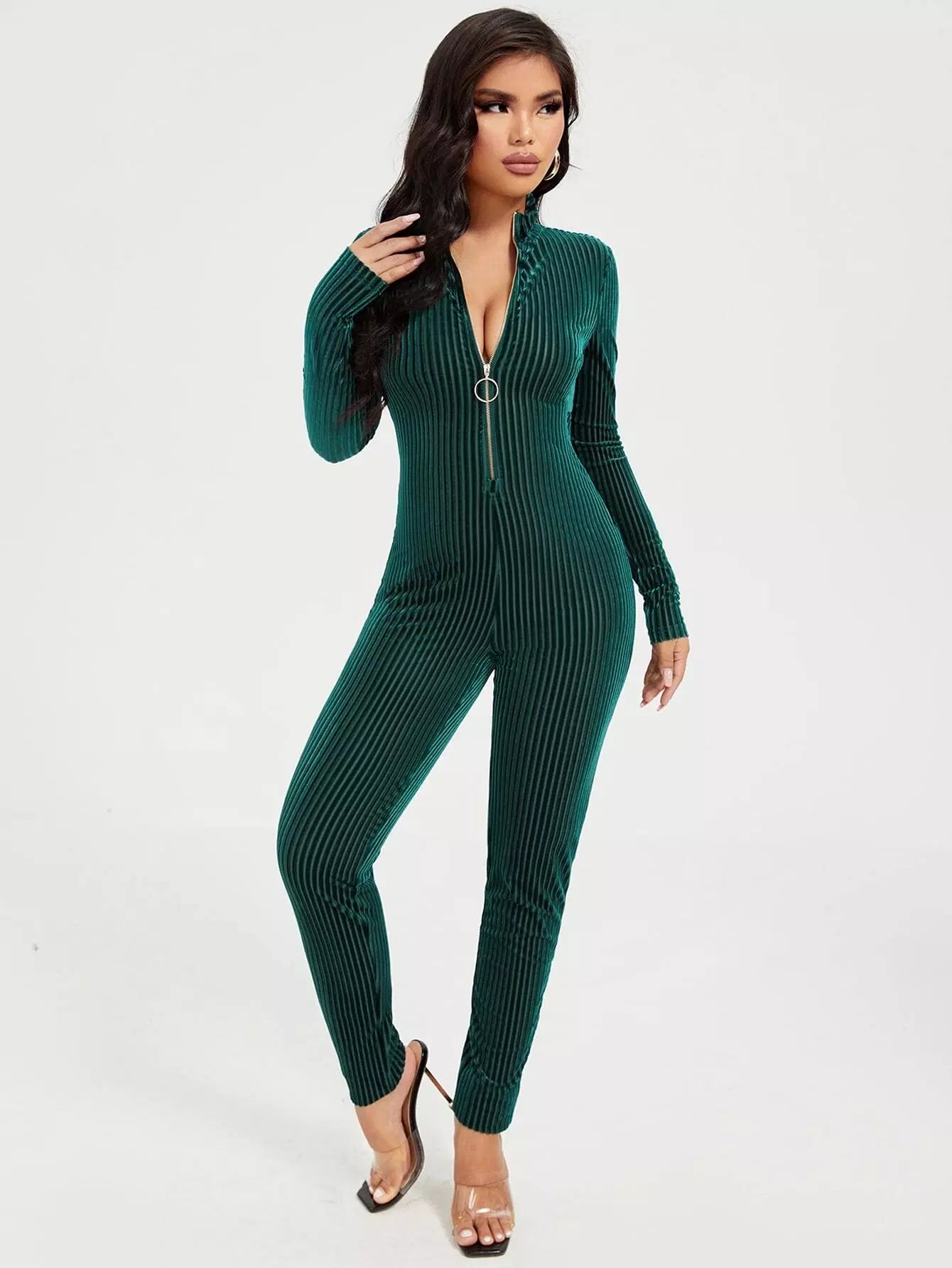 Solid Zip Placket Front Velvet Jumpsuit