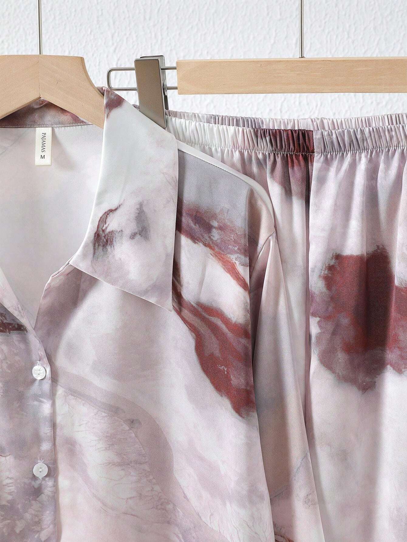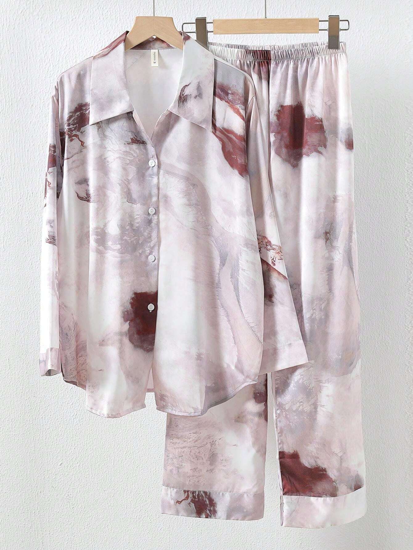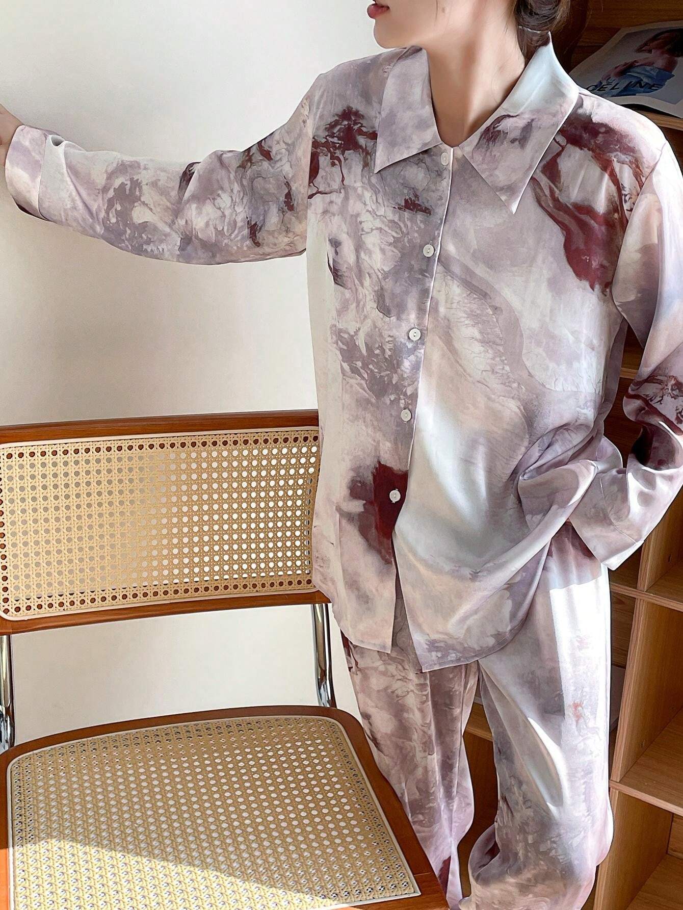 2pcs/Set Women's Long Sleeve Turn-Down Collar Pajamas Set With Sunset Pattern