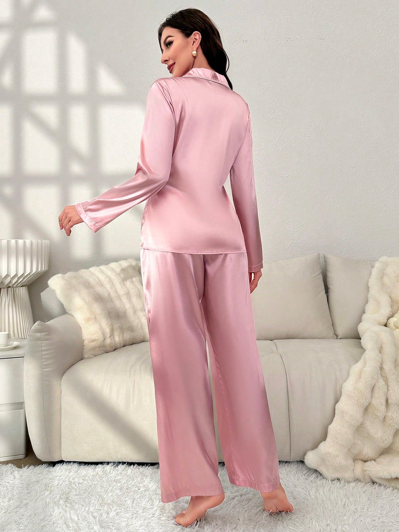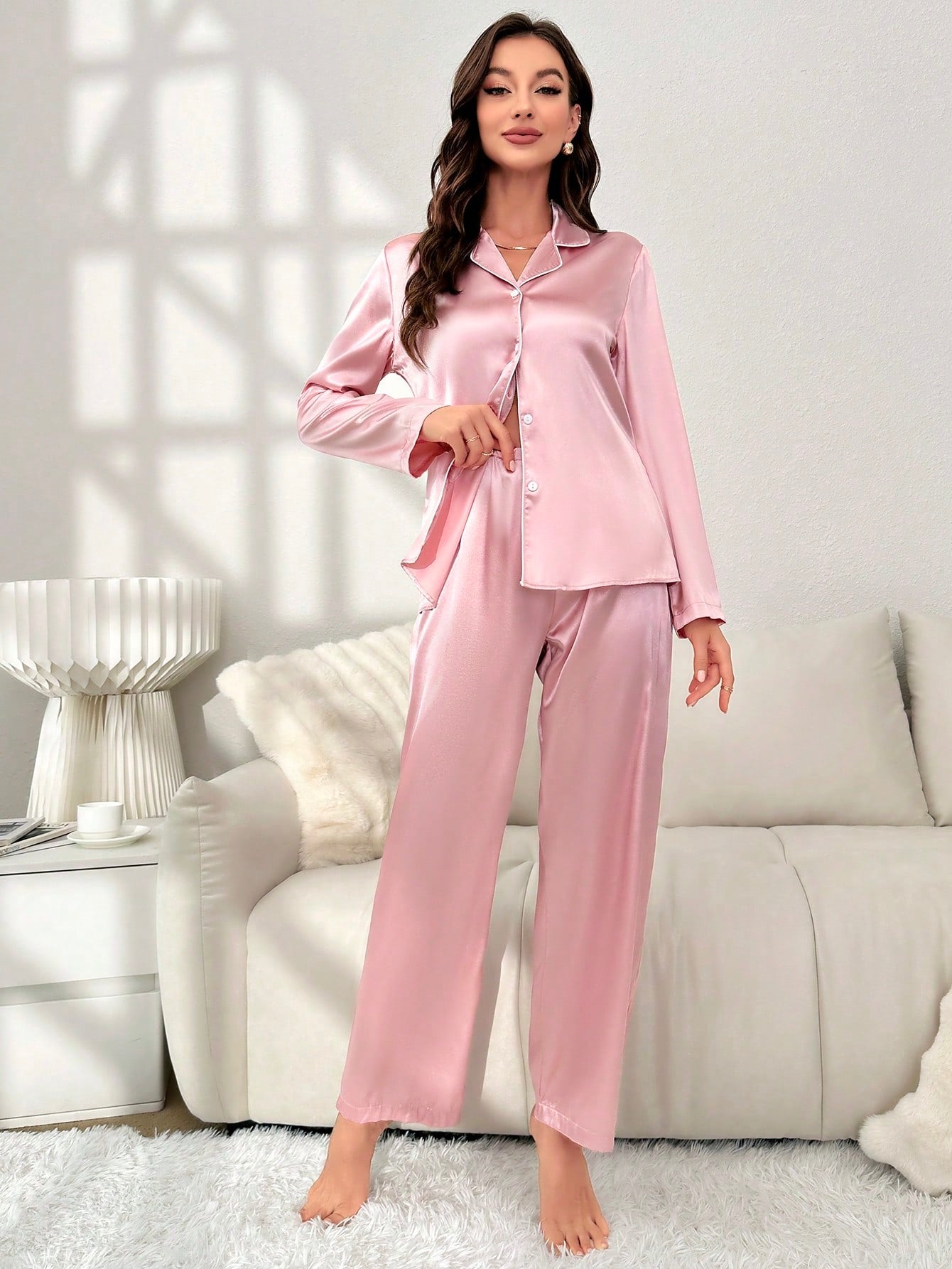Nina Bonheur 2pcs Women Satin Open Front Button Down Shirt & Elastic Waist Pajama Pants Set Two Pieces