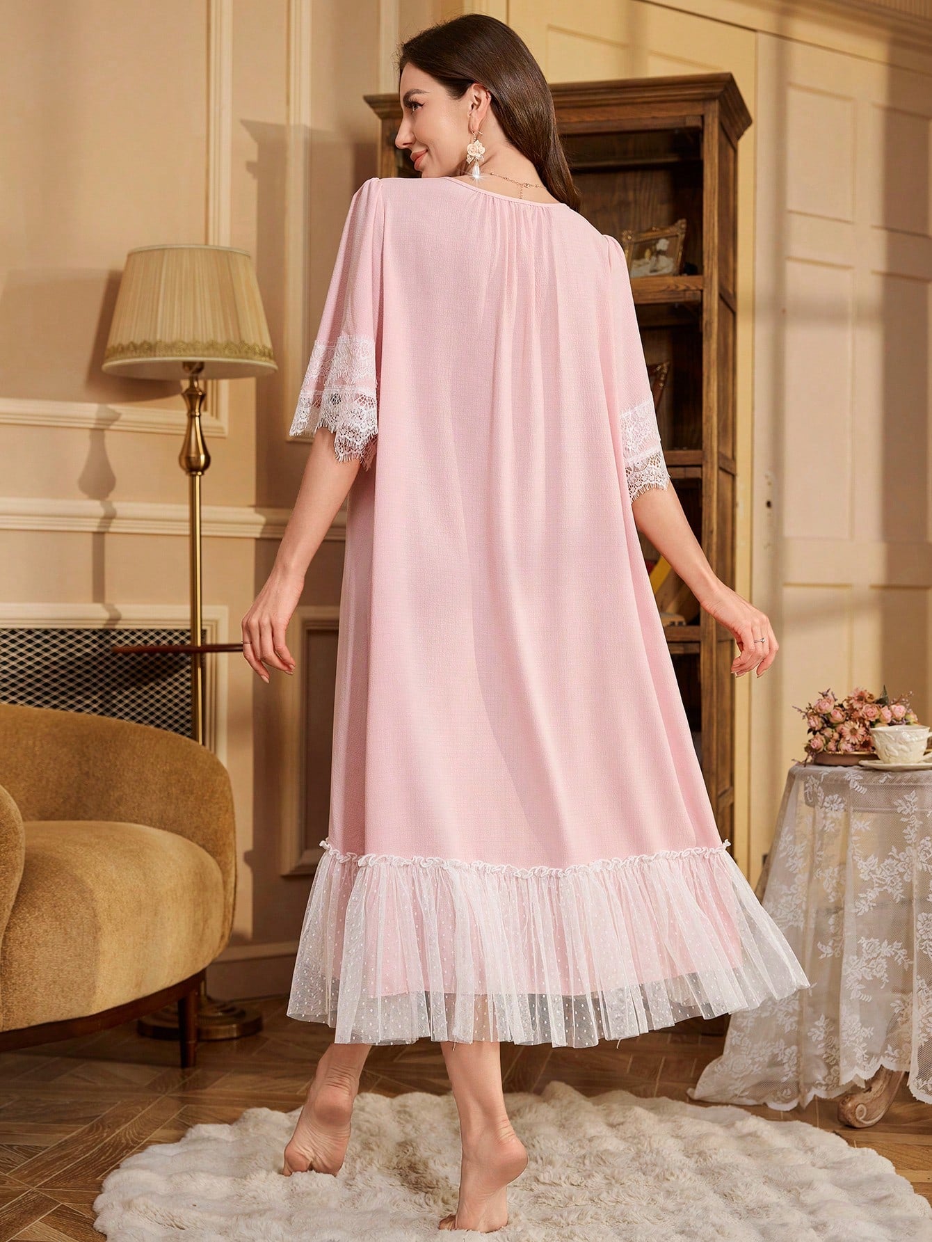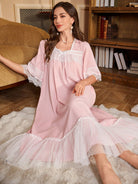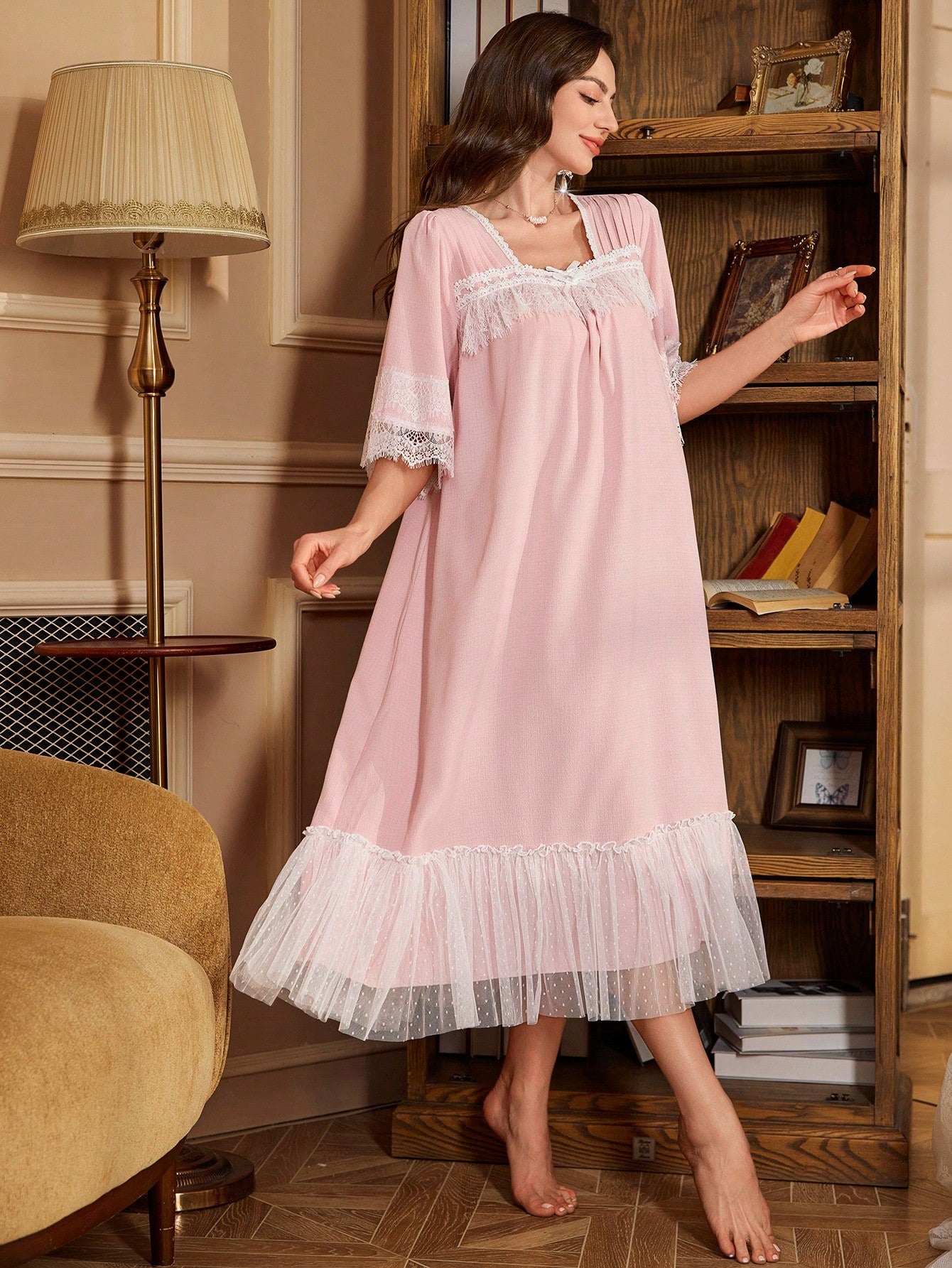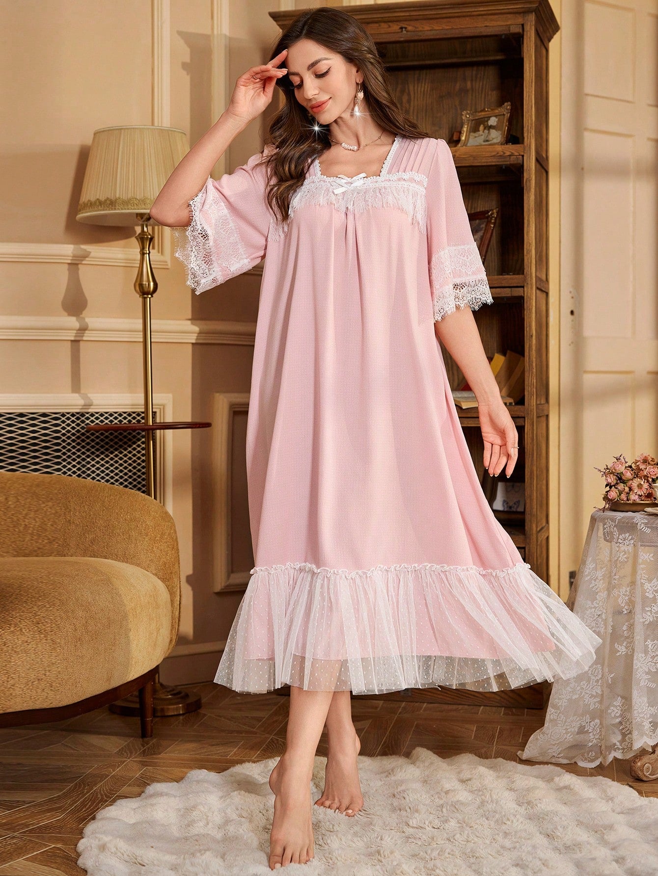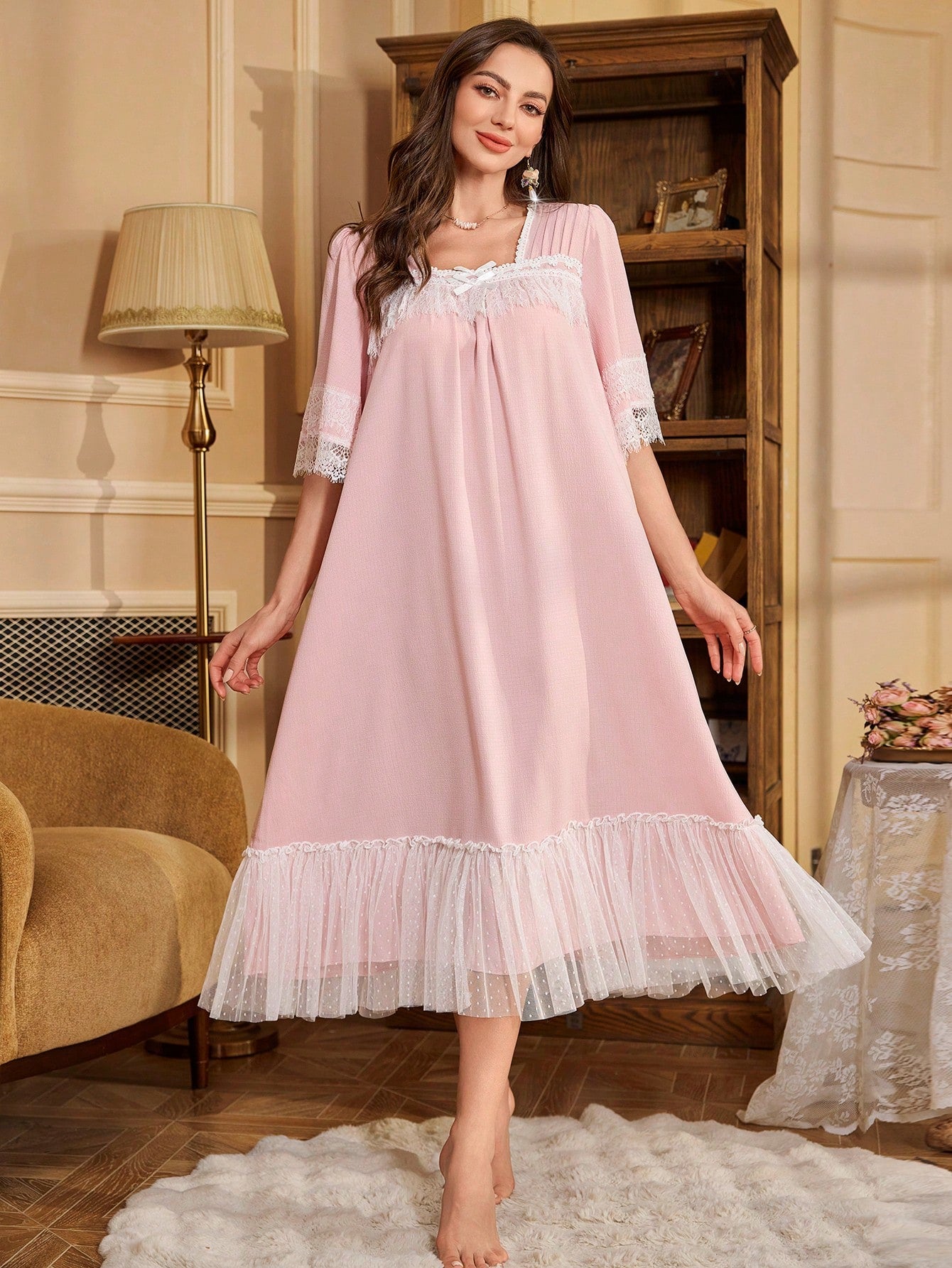 PalaceNights Women Lace Patchwork Bow Decor Simple Casual Sleep Dress Luxe Loungewear, Vacation