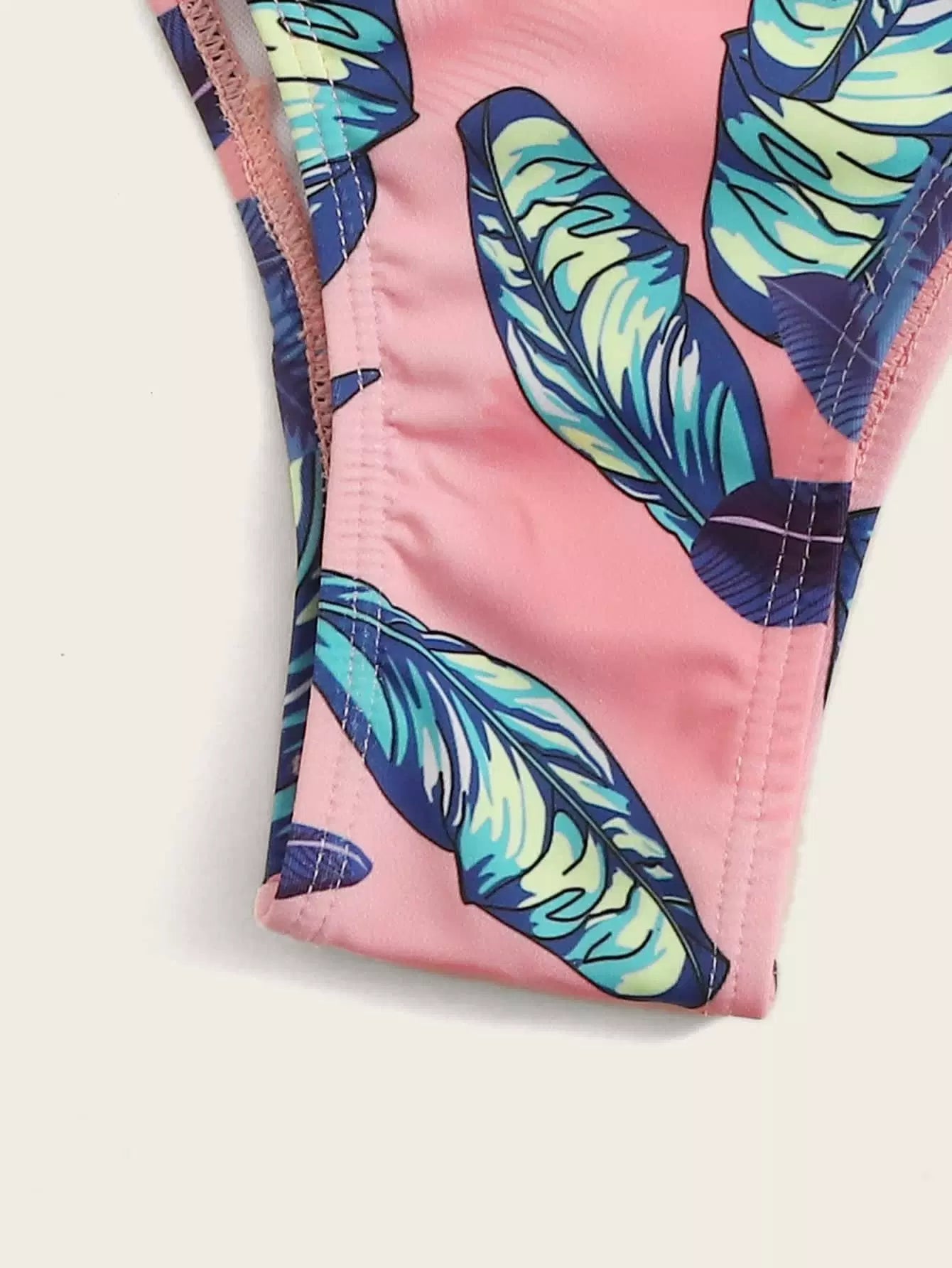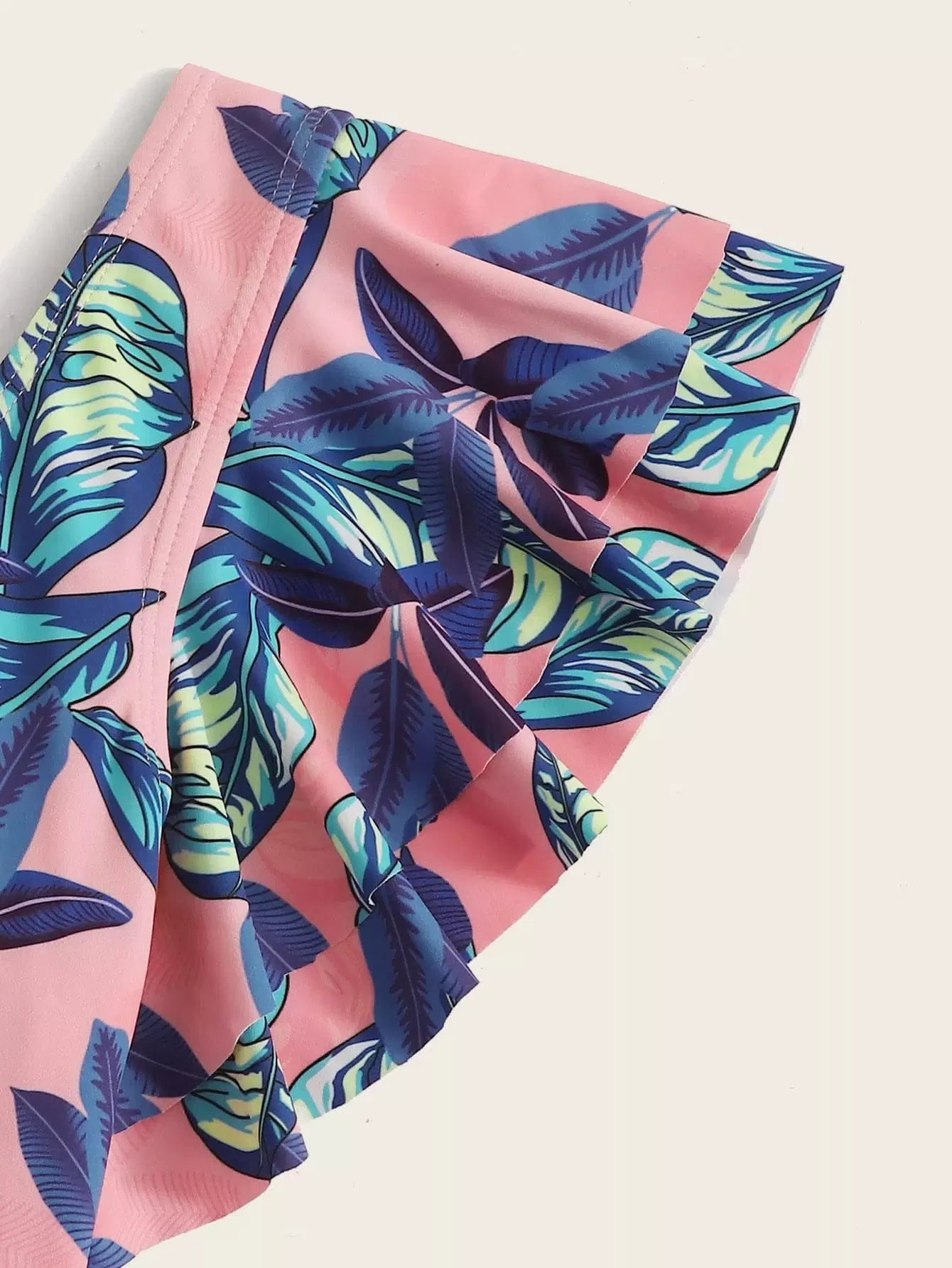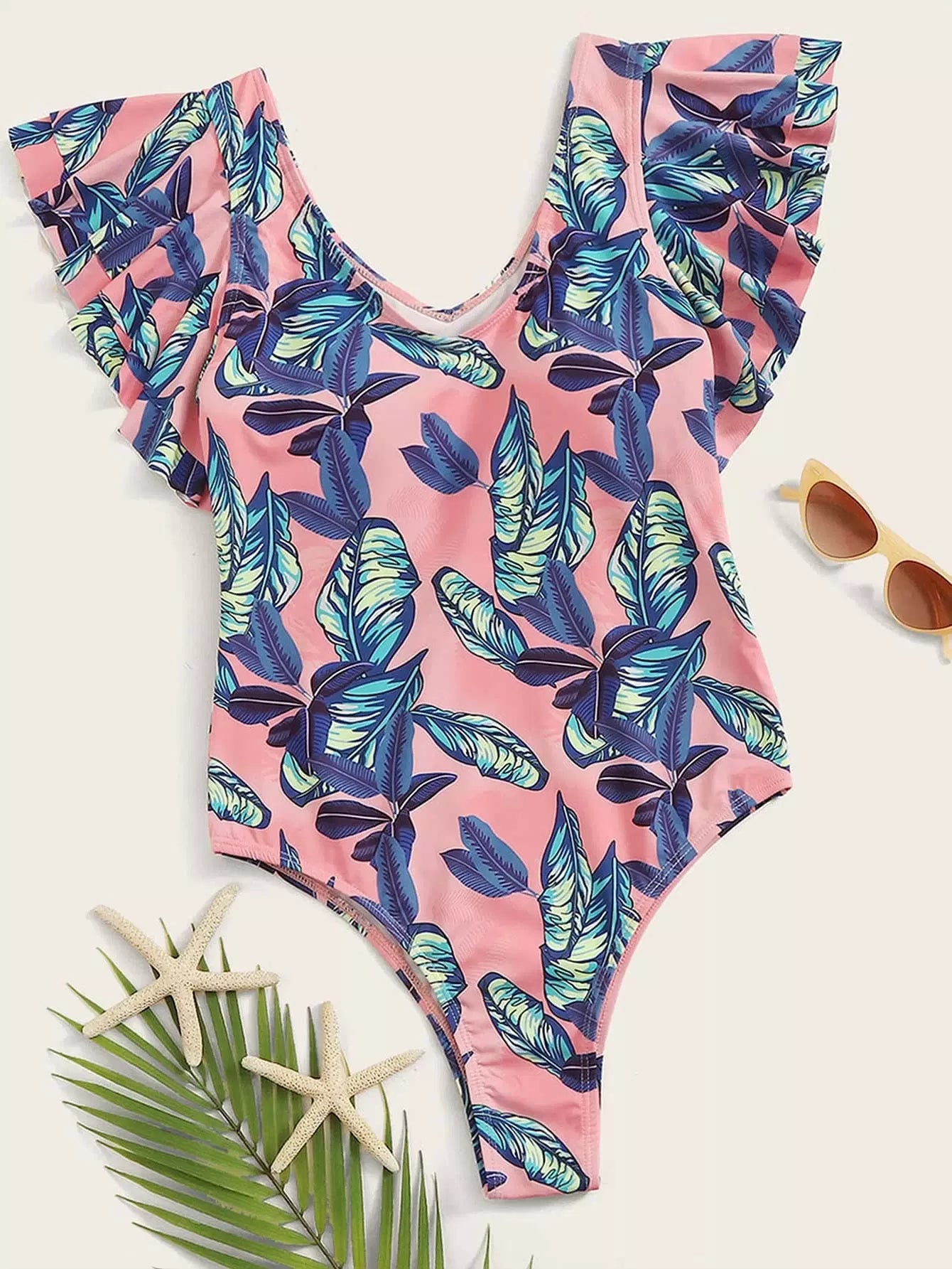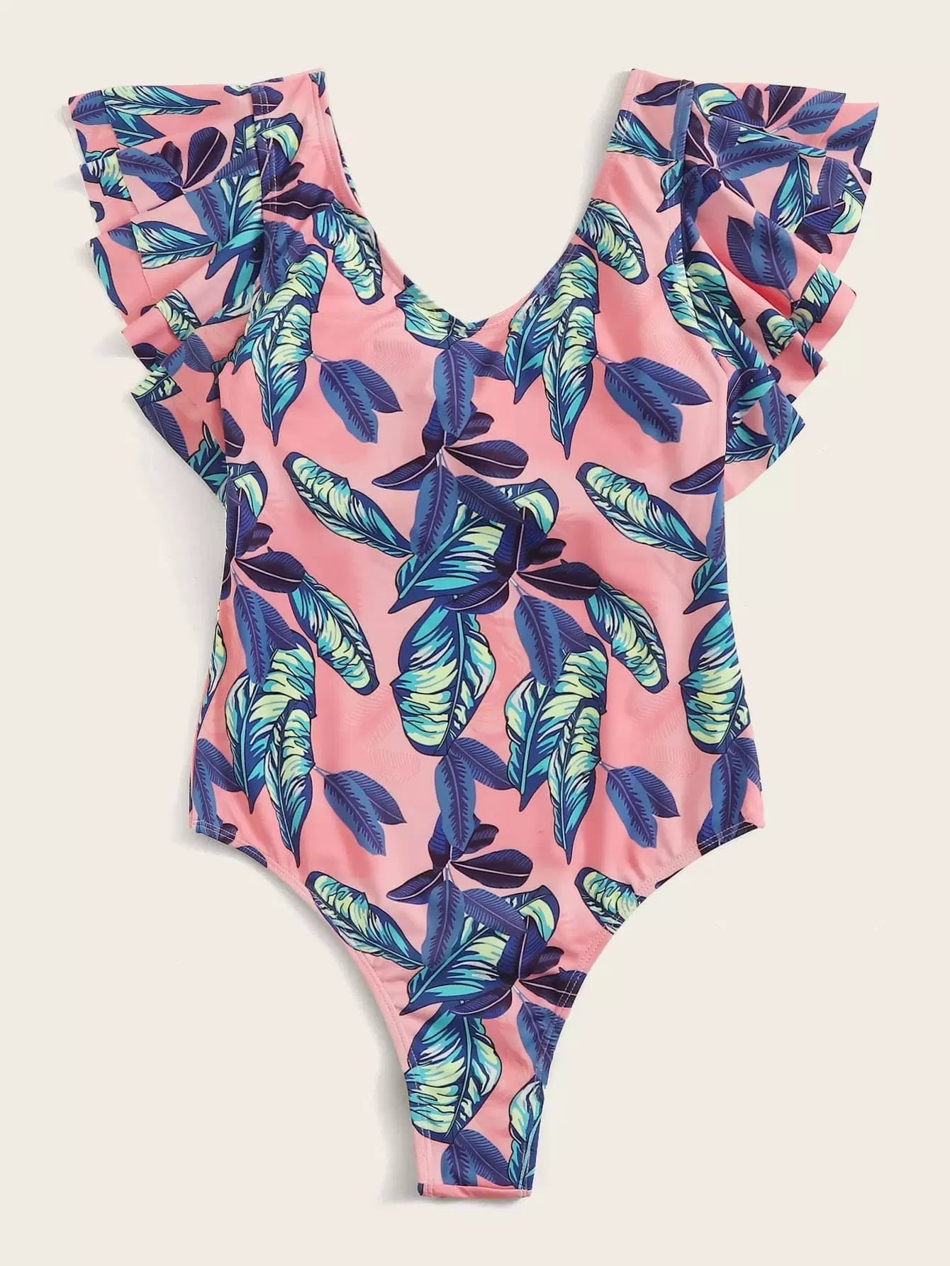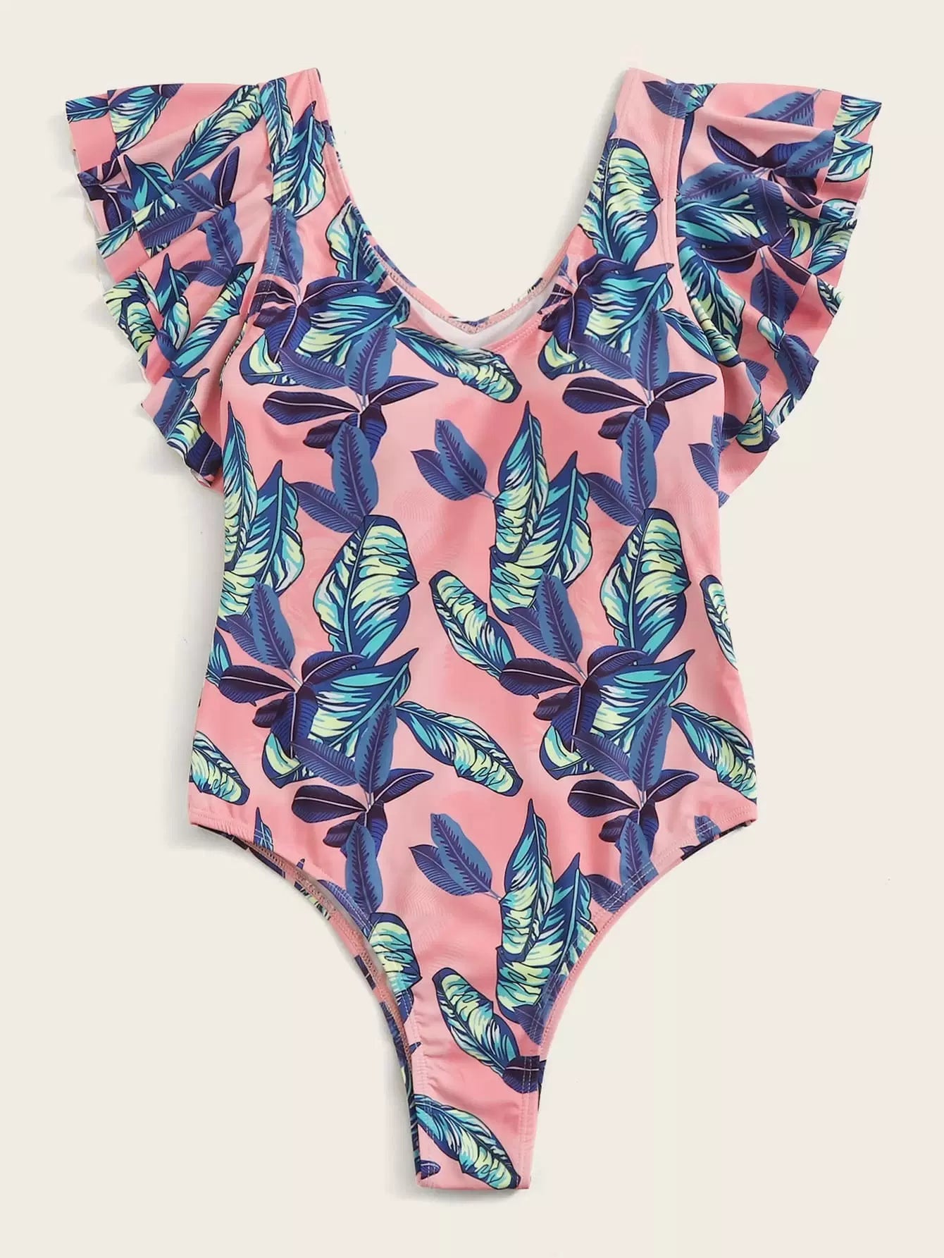 Women - Palm Print Ruffle Trim One Piece Swimsuit