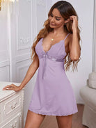 Plunging Neck Bow Detail Lace Trim Backless Night Dress