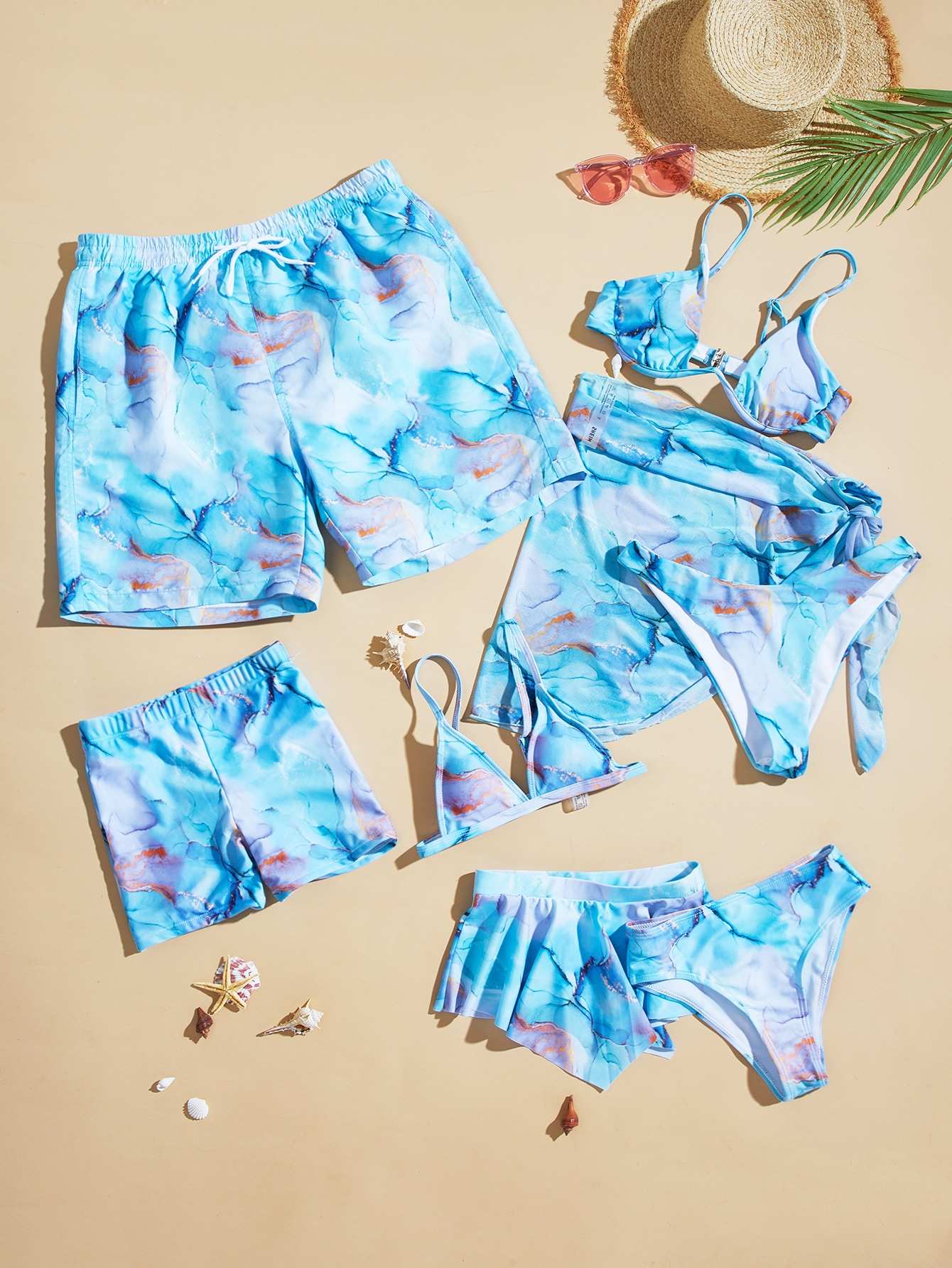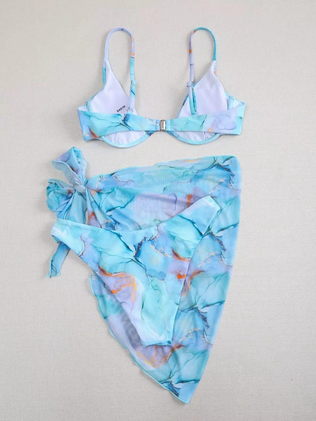 3pack Marble Print Underwire Bikini Swimsuit & Beach Skirt
