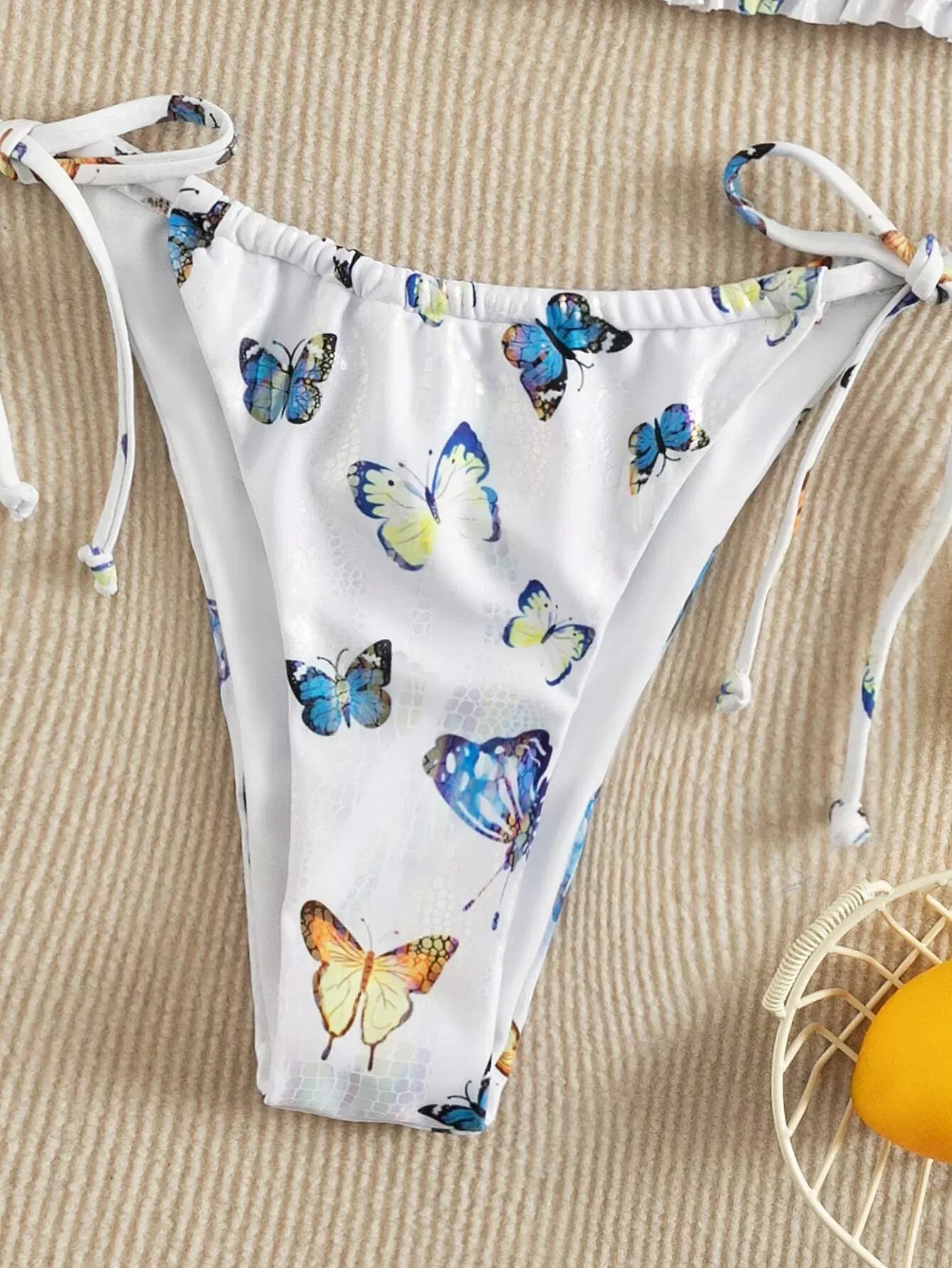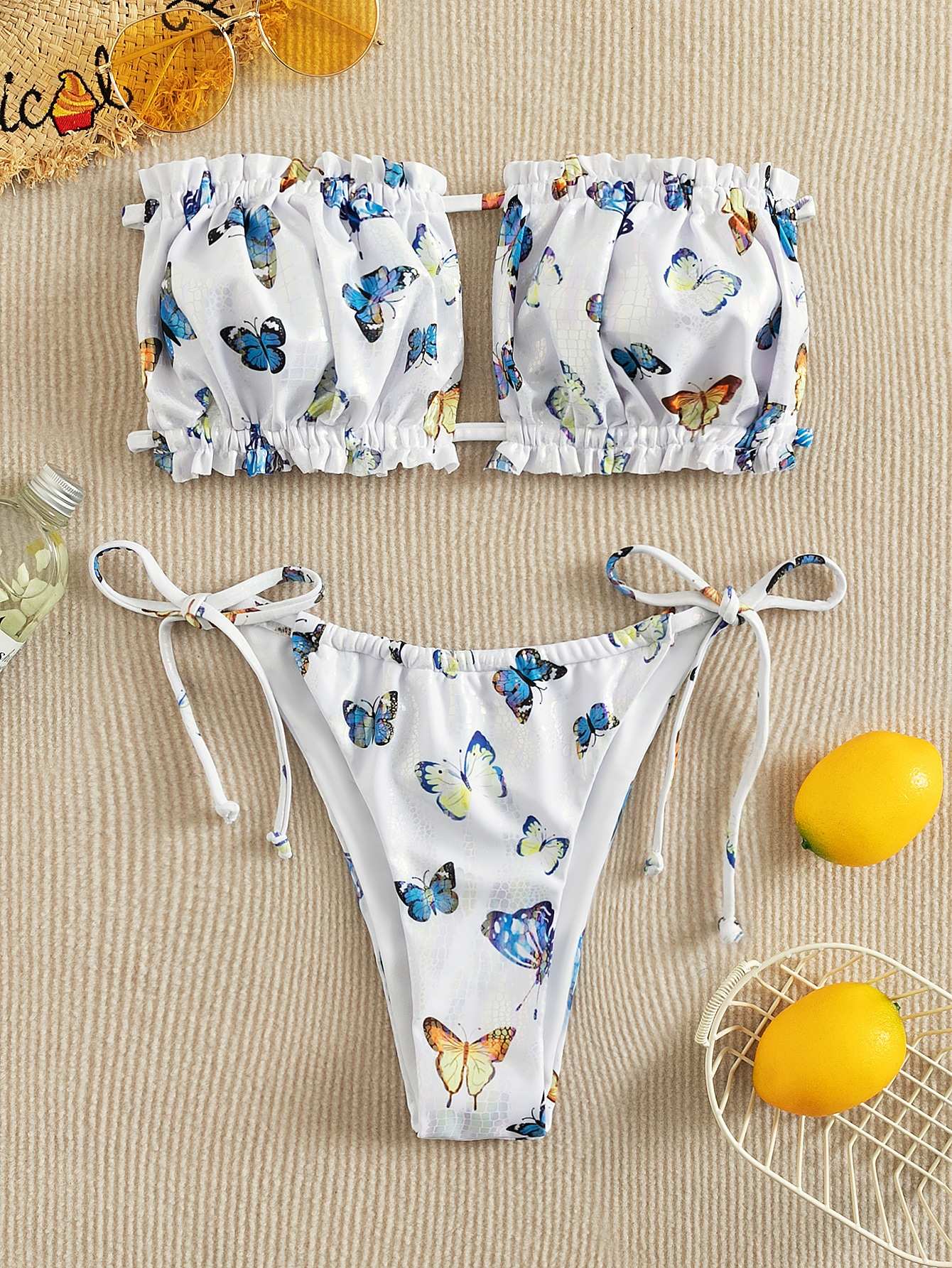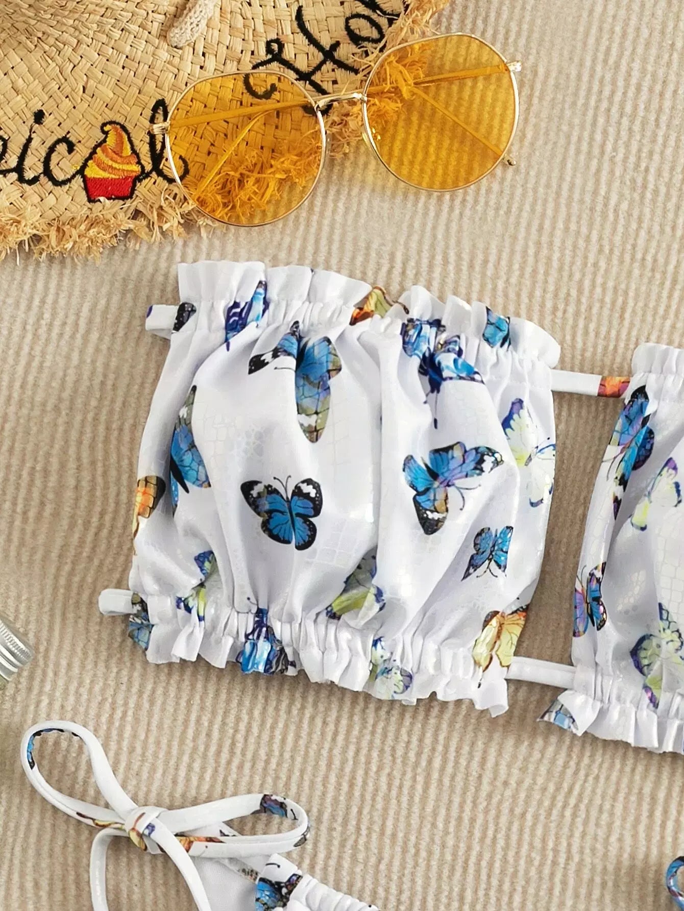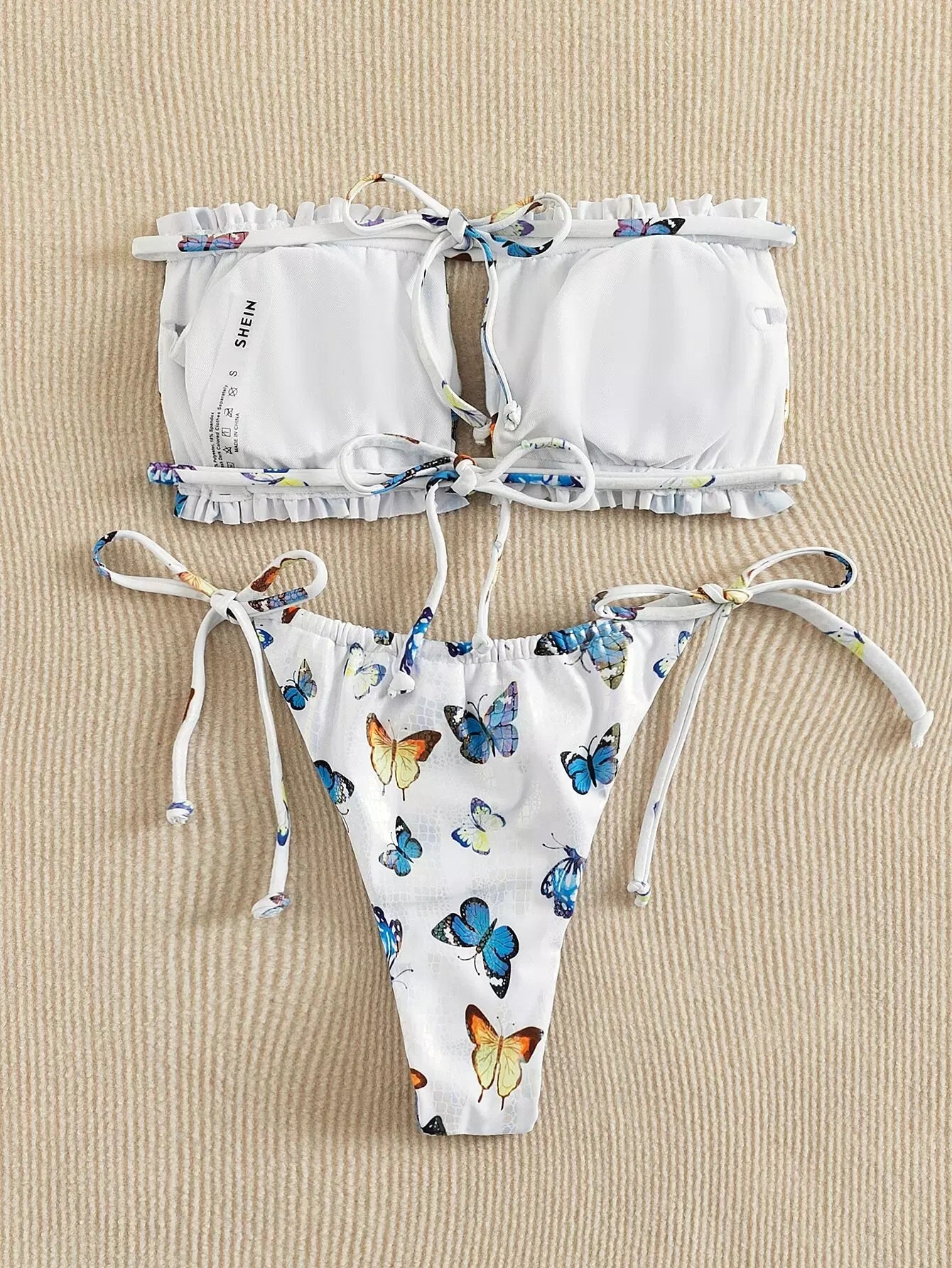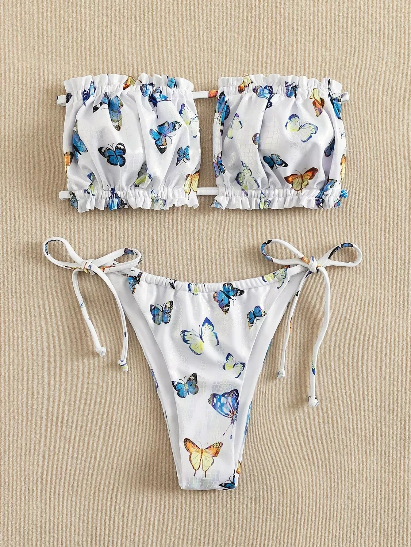 Women - Butterfly Print Metallic Bandeau Tie Side Bikini Swimsuit