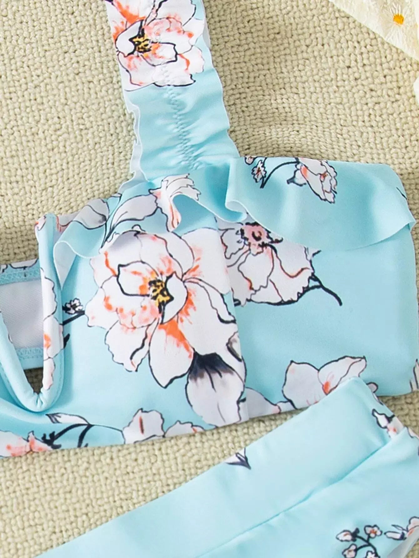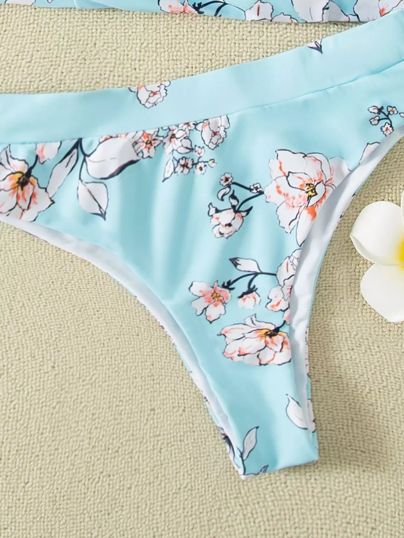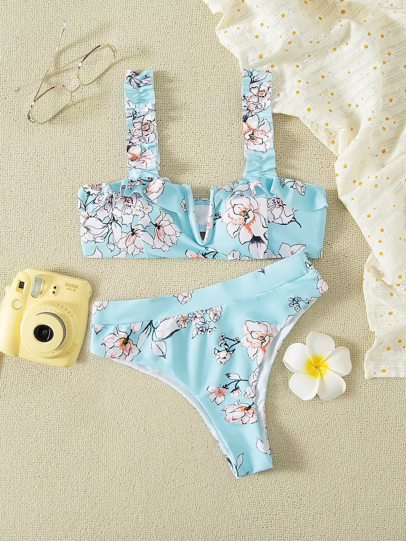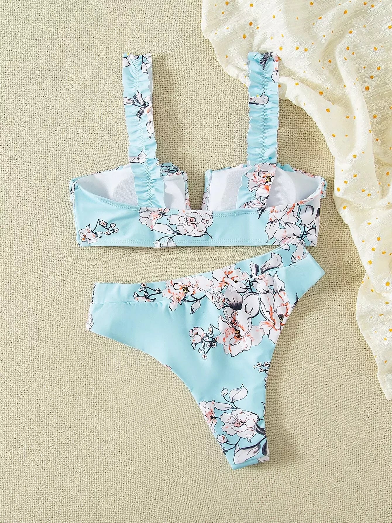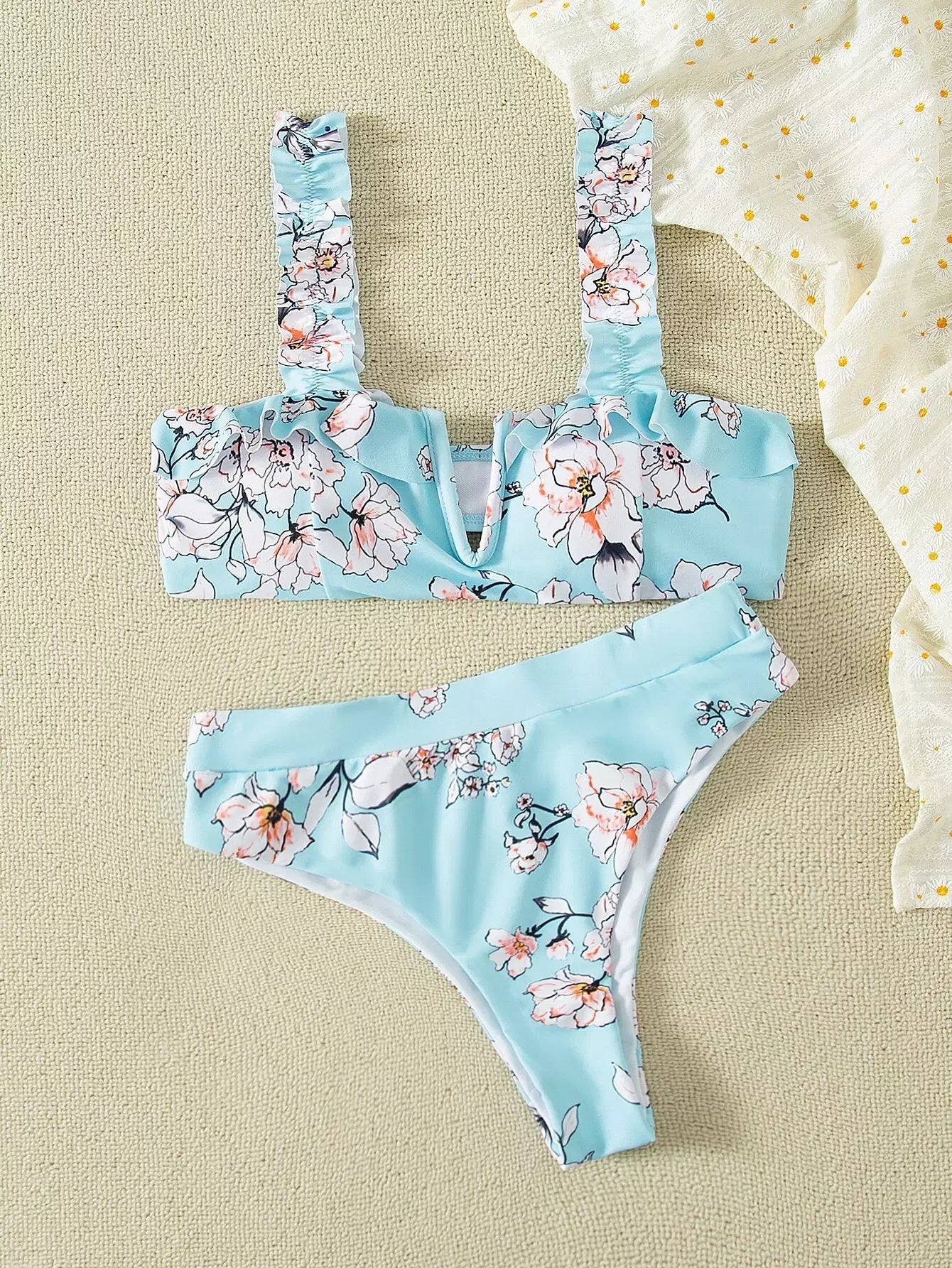 Floral Pattern Ruffle Trim V Wired Bikini Swimsuit