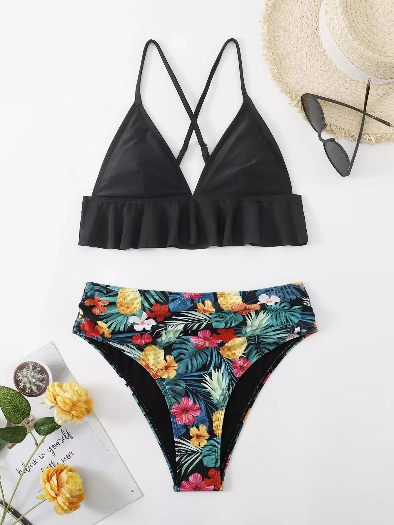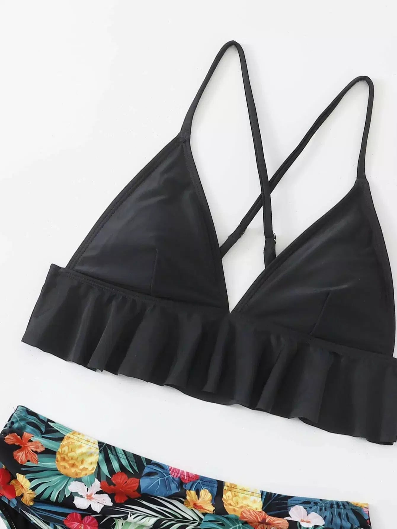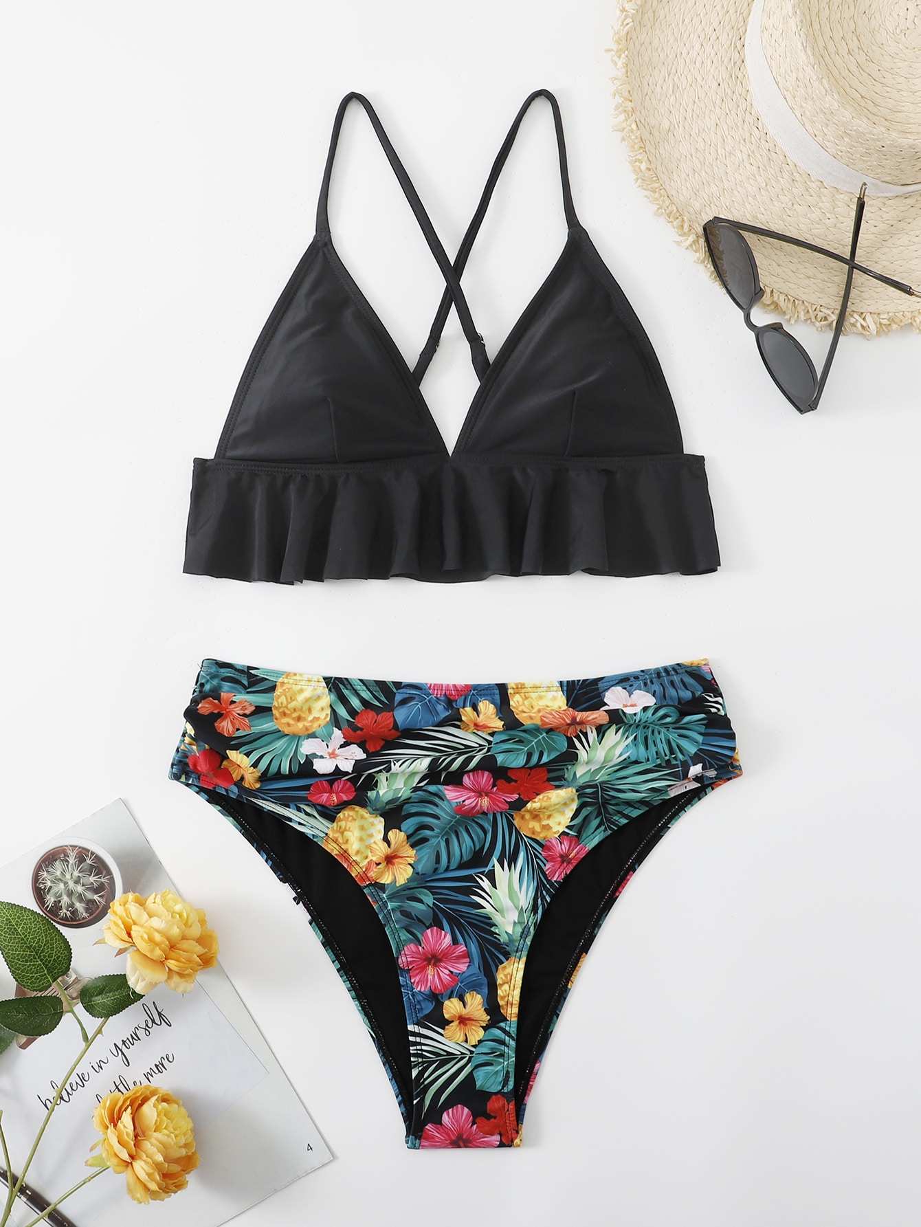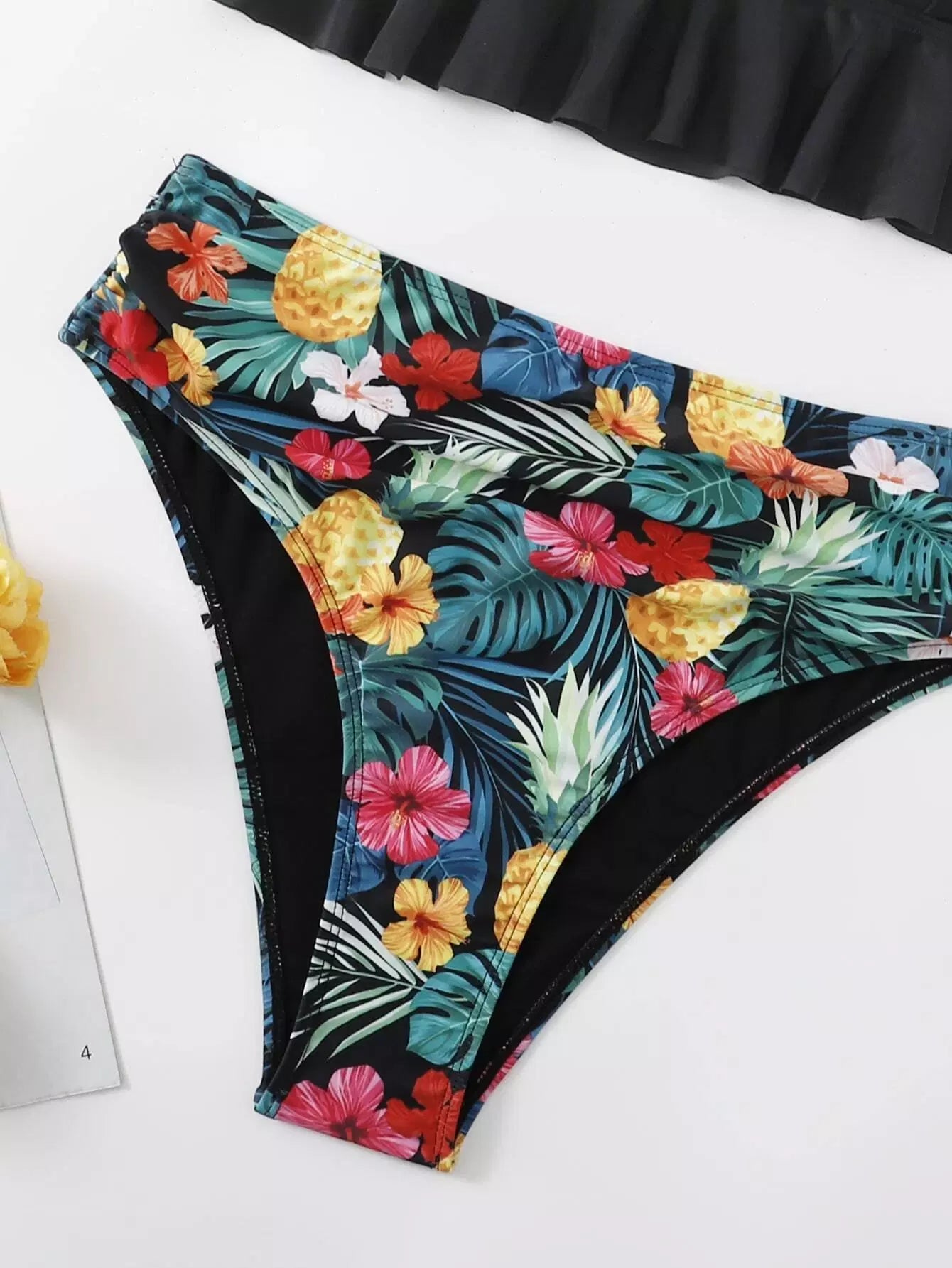 Tropical Print Ruffle Trim Bikini Swimsuit