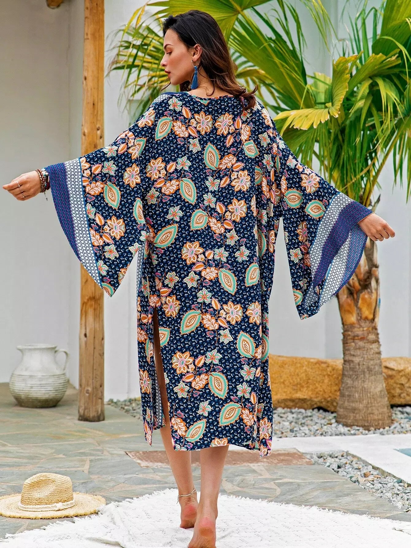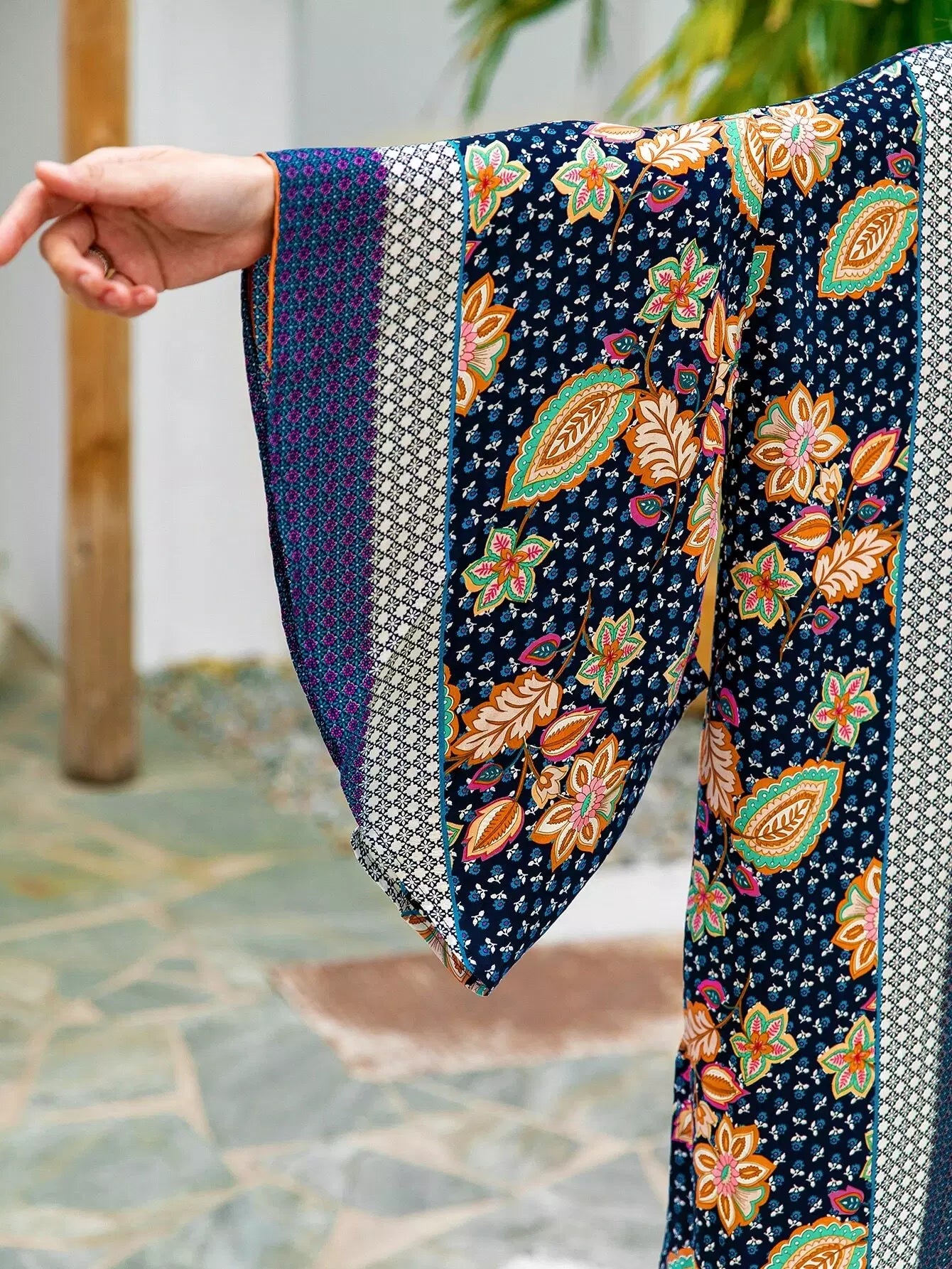 Open Front Slit Hem Floral & Geo Print Kimono