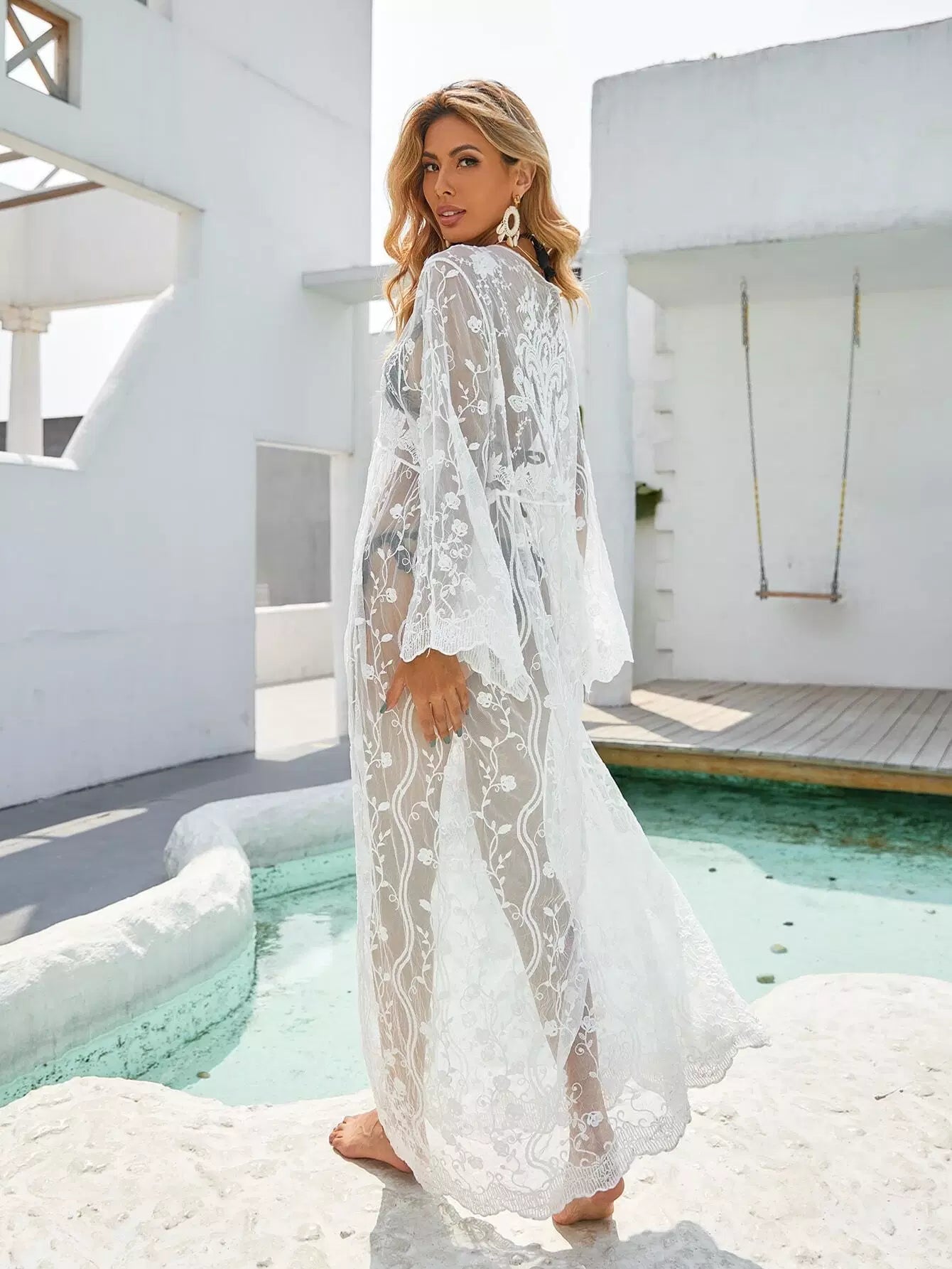 Women - Scallop Hem Embroidered Mesh Cover Up Dress Without Bikini Set