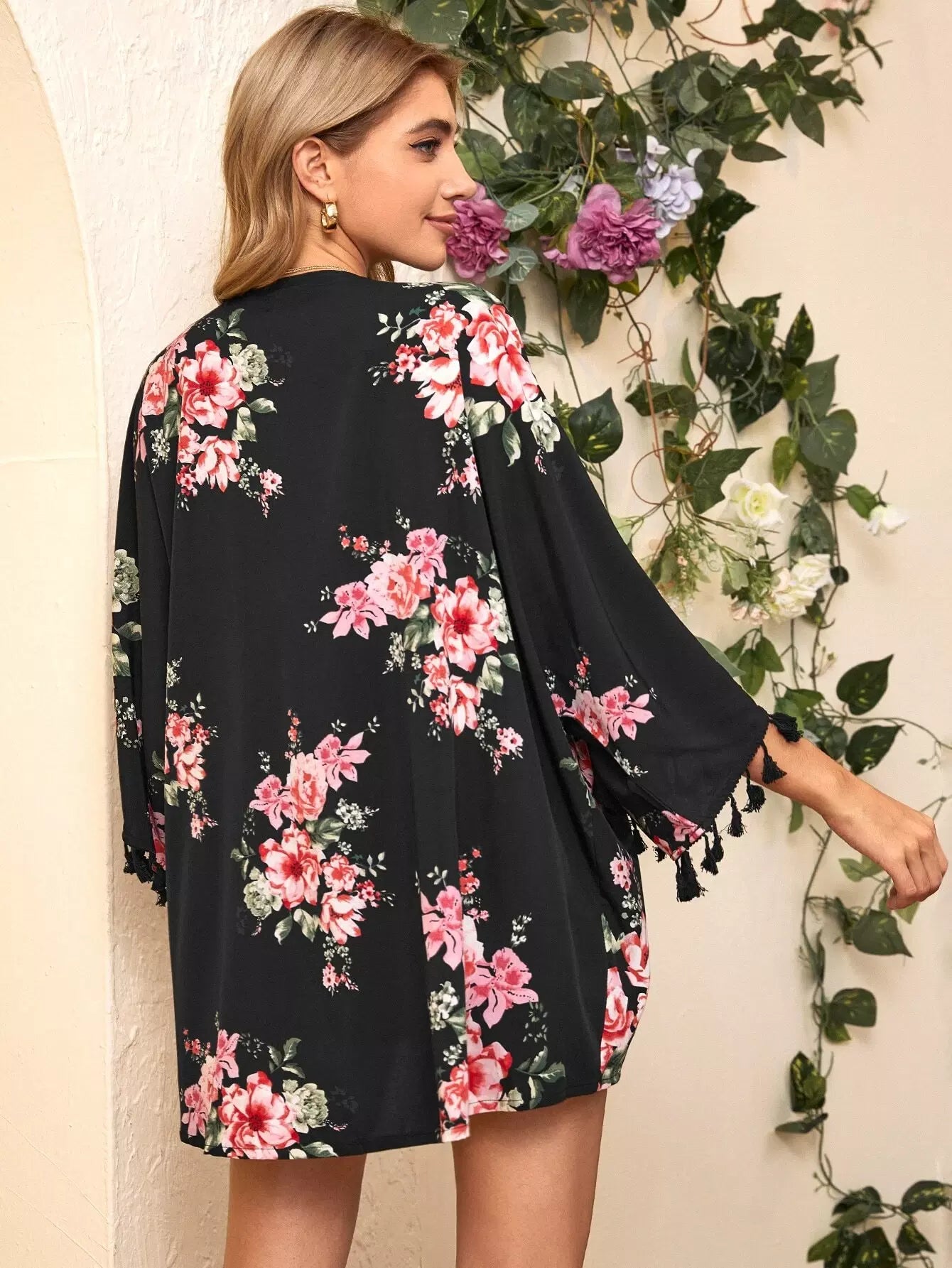 Tassel Trim Floral Print Kimono