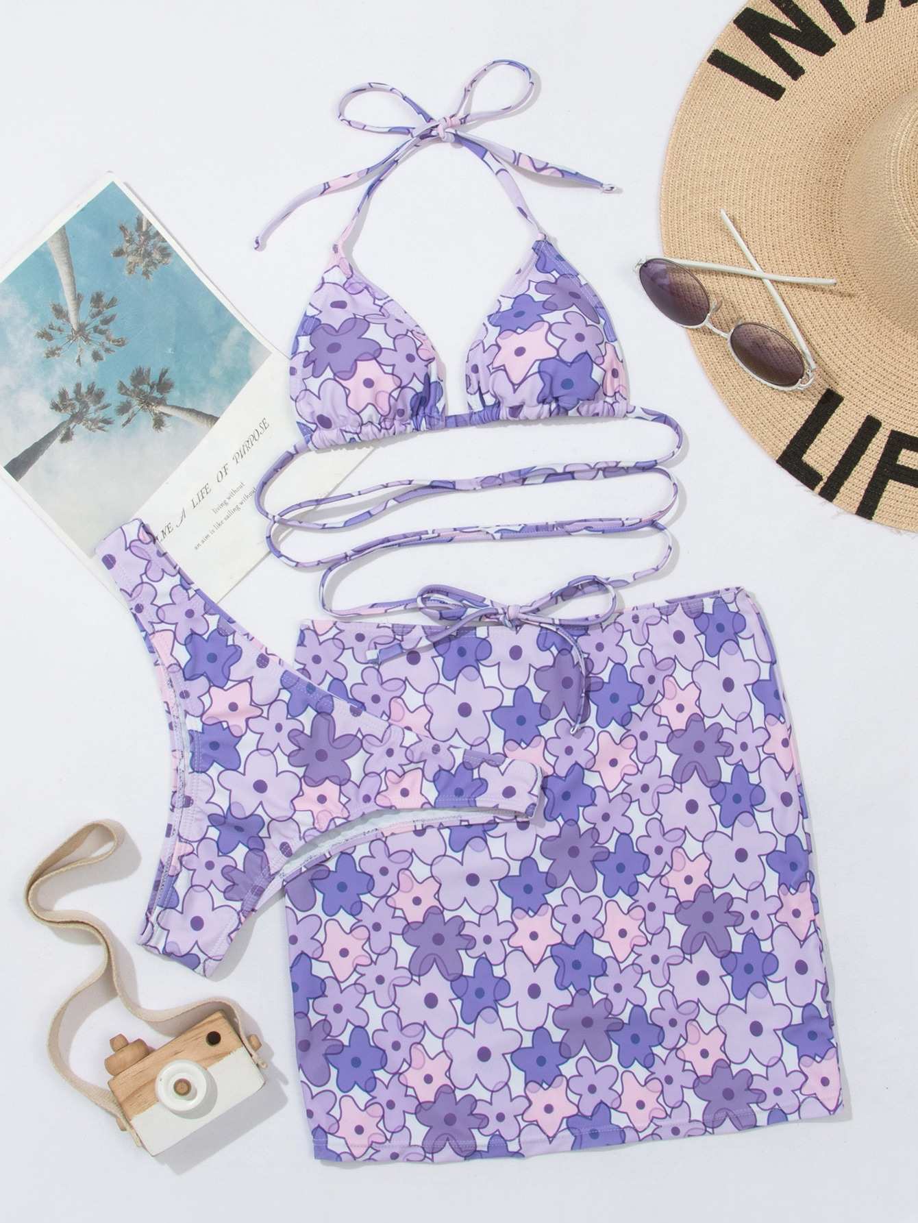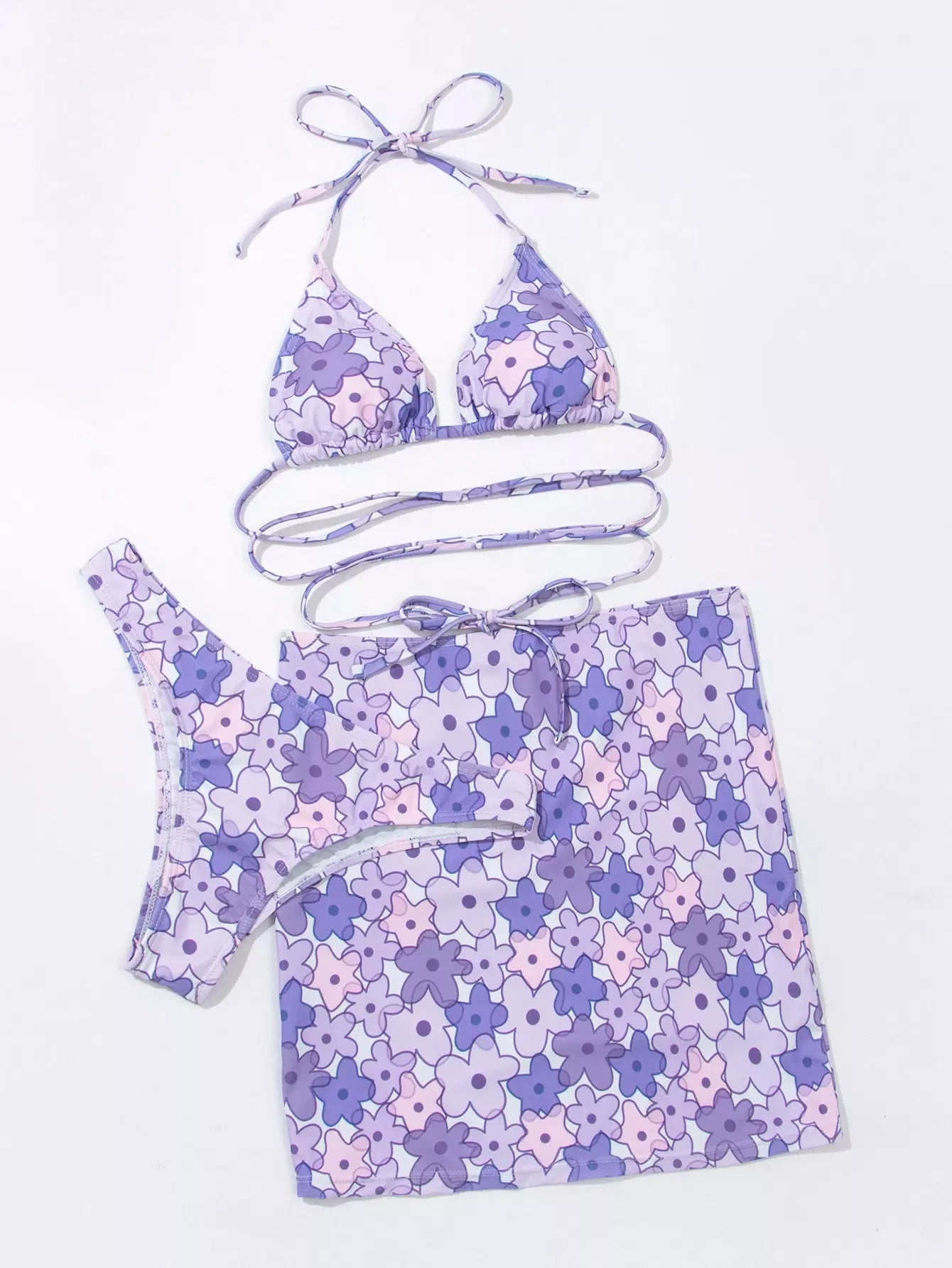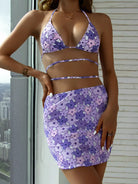 3pack Floral Triangle Bikini Swimsuit & Beach Skirt