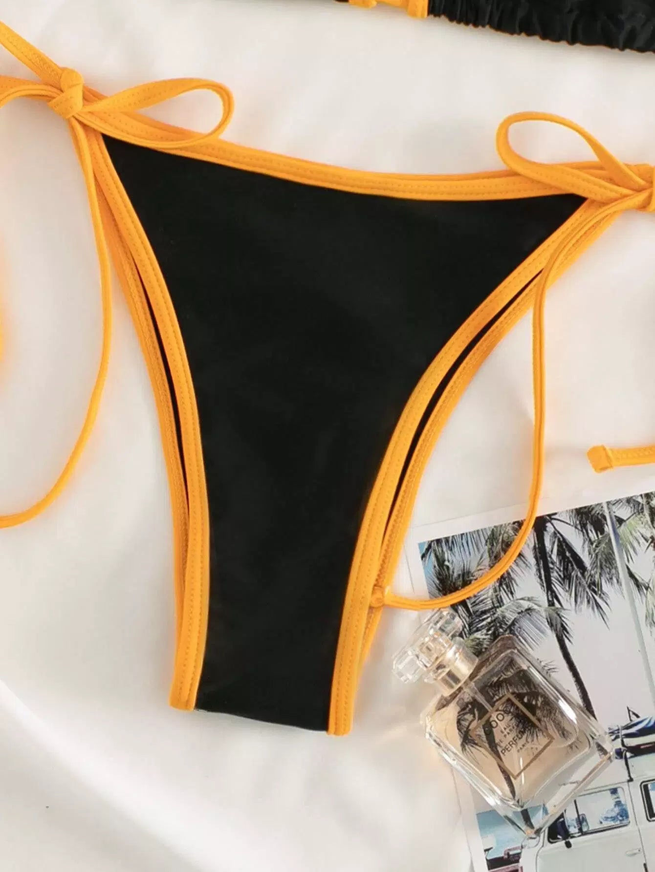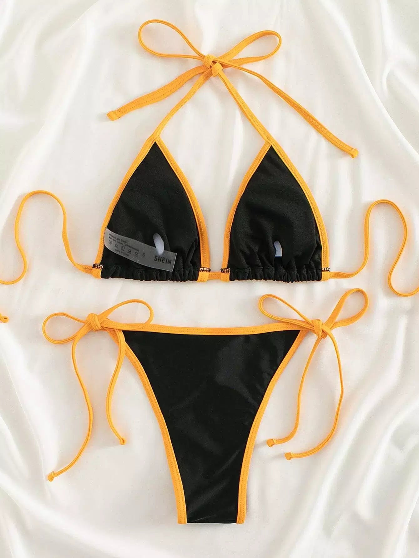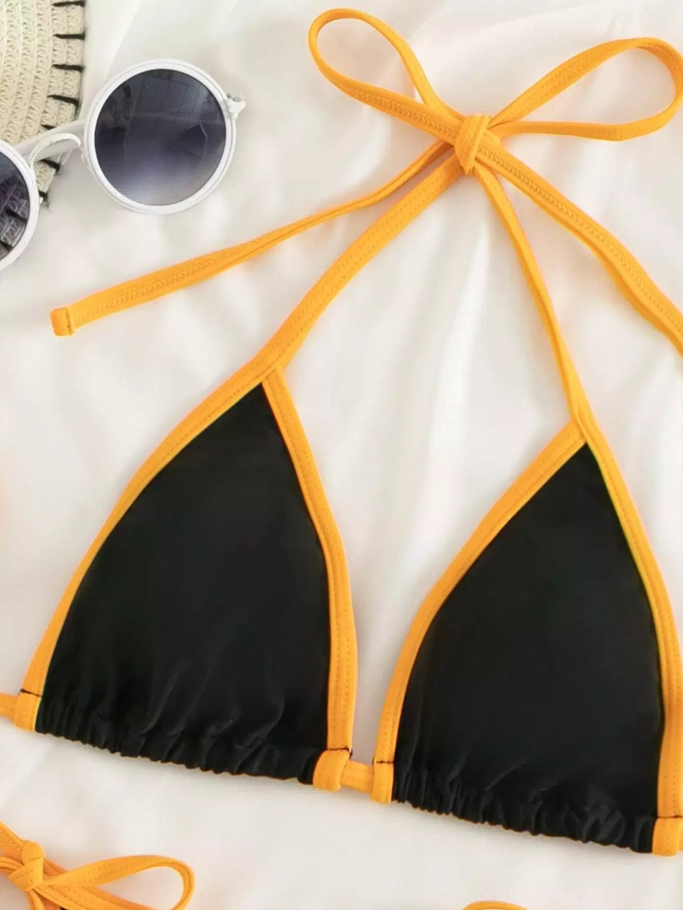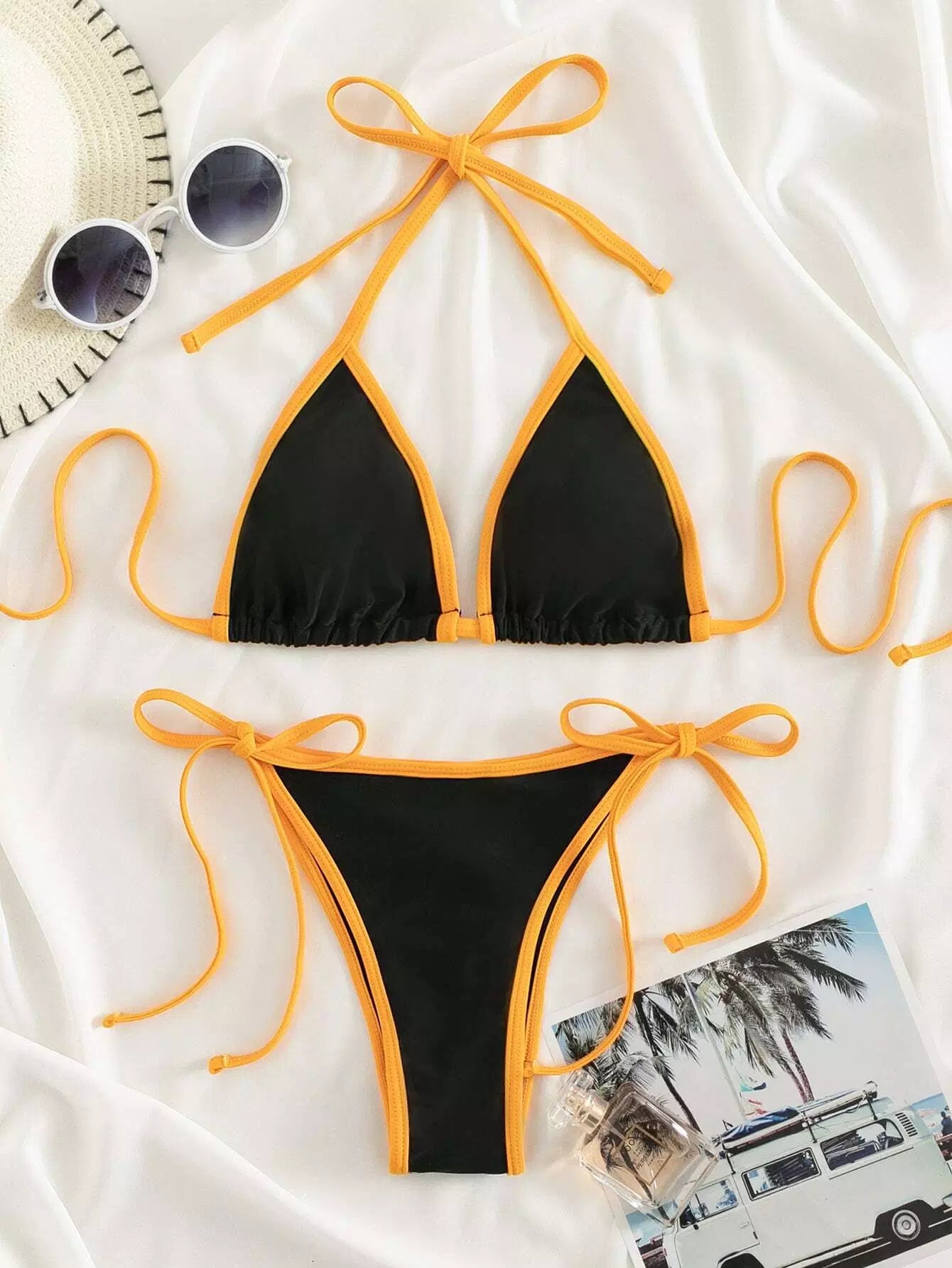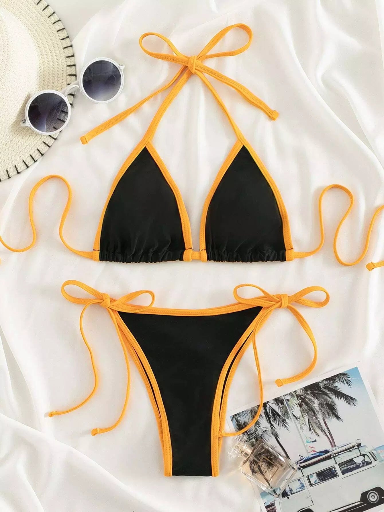 Contrast Binding Triangle Thong Bikini Swimsuit