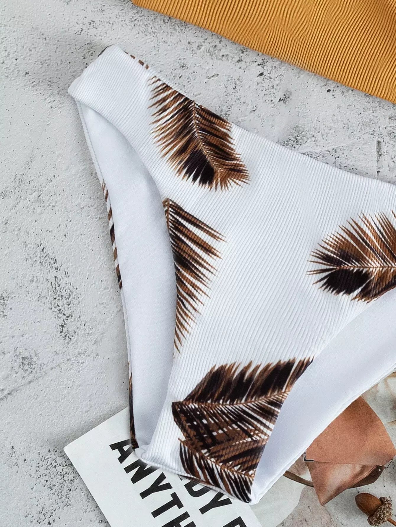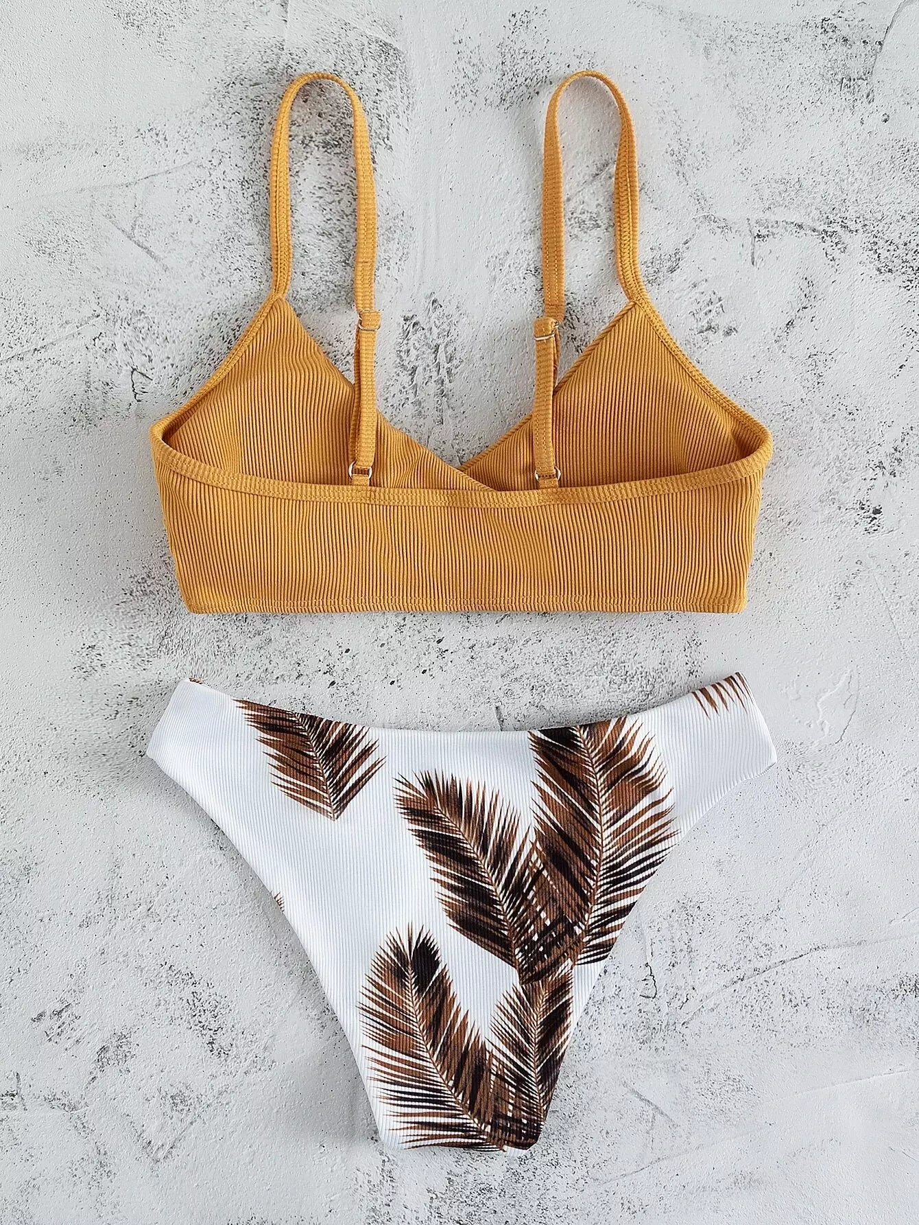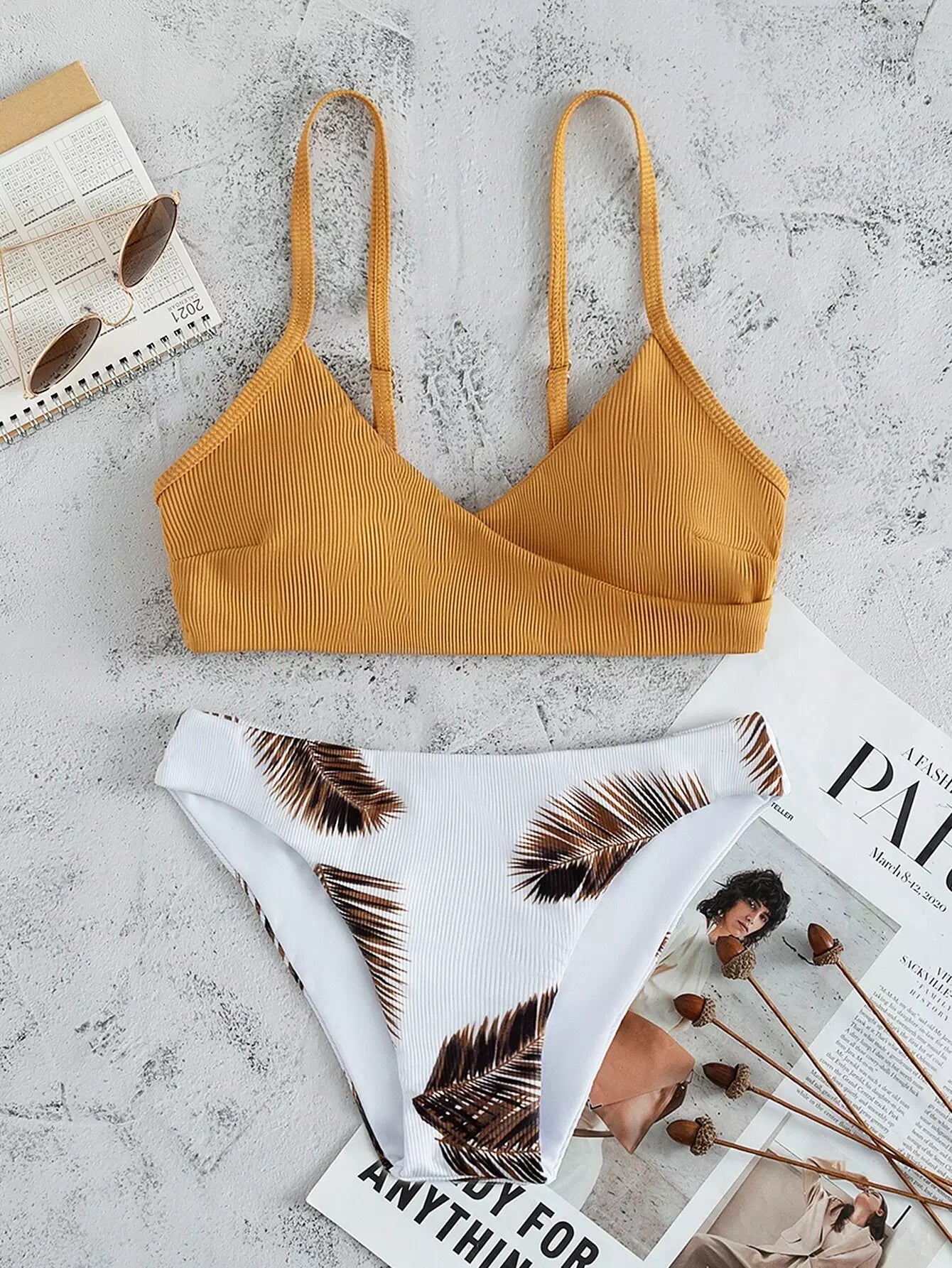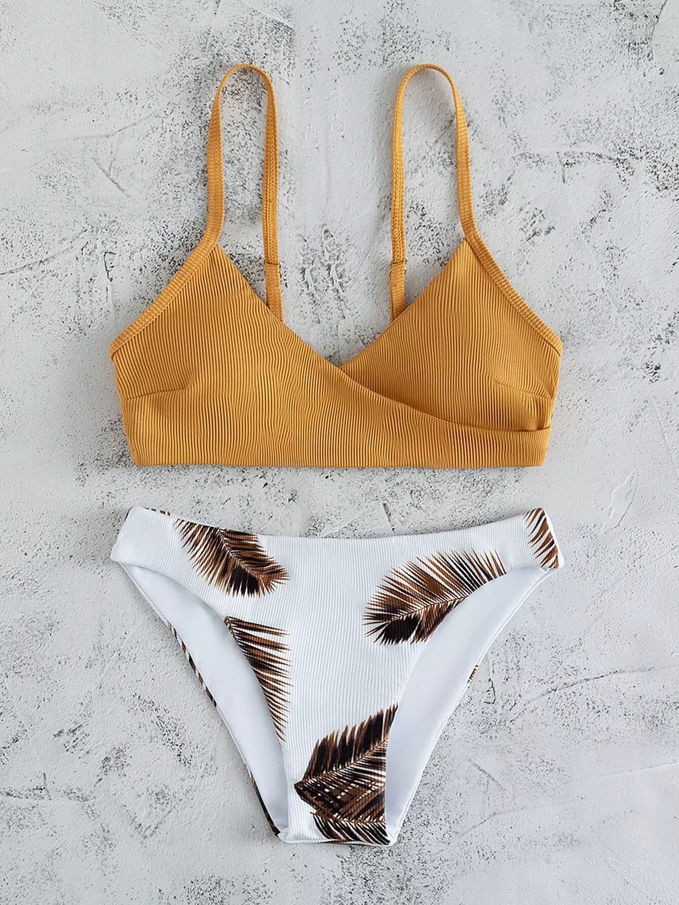 Palm Leaf Print Surplice Neck Bikini Swimsuit