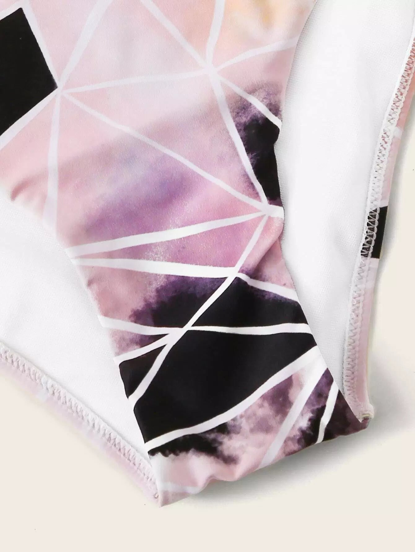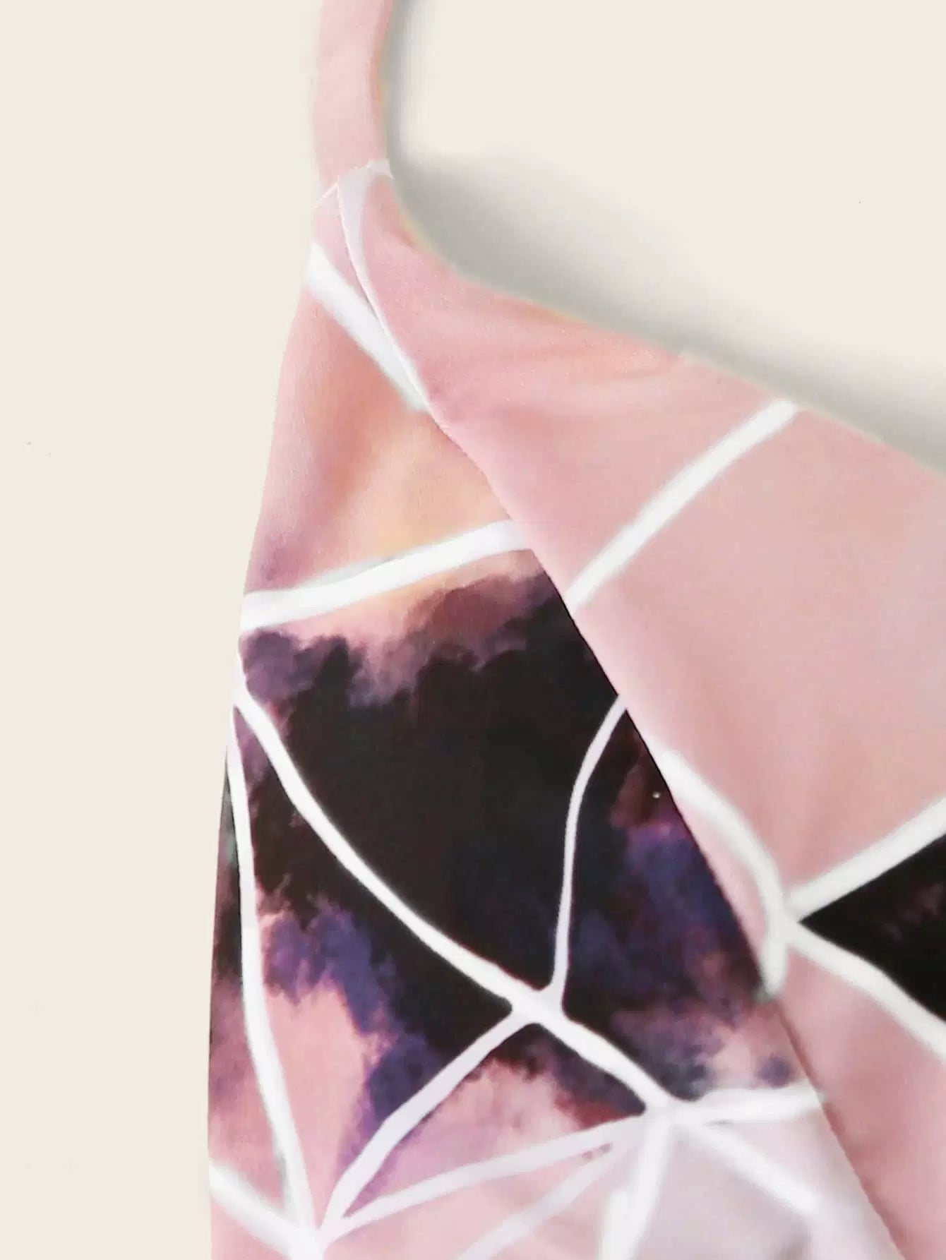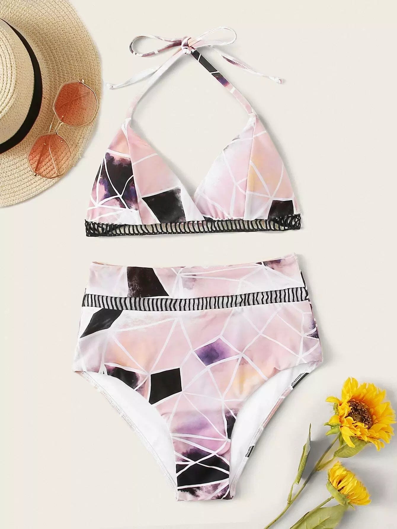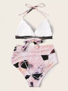 Geo Random Print Ladder Lace Insert Halter Bikini Swimsuit