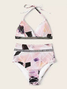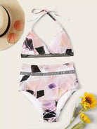 Women - Geo Random Print Ladder Lace Insert Halter Bikini Swimsuit