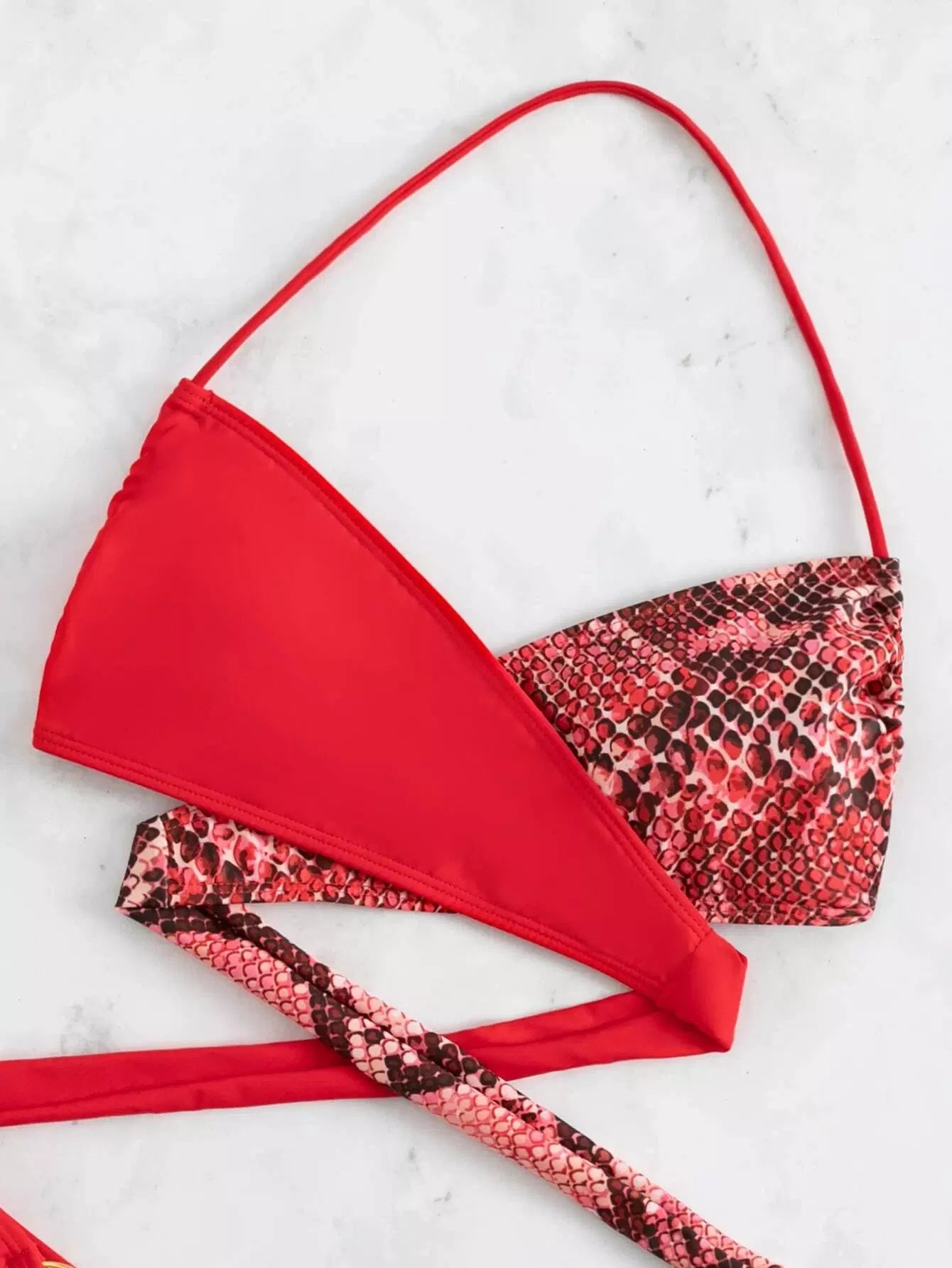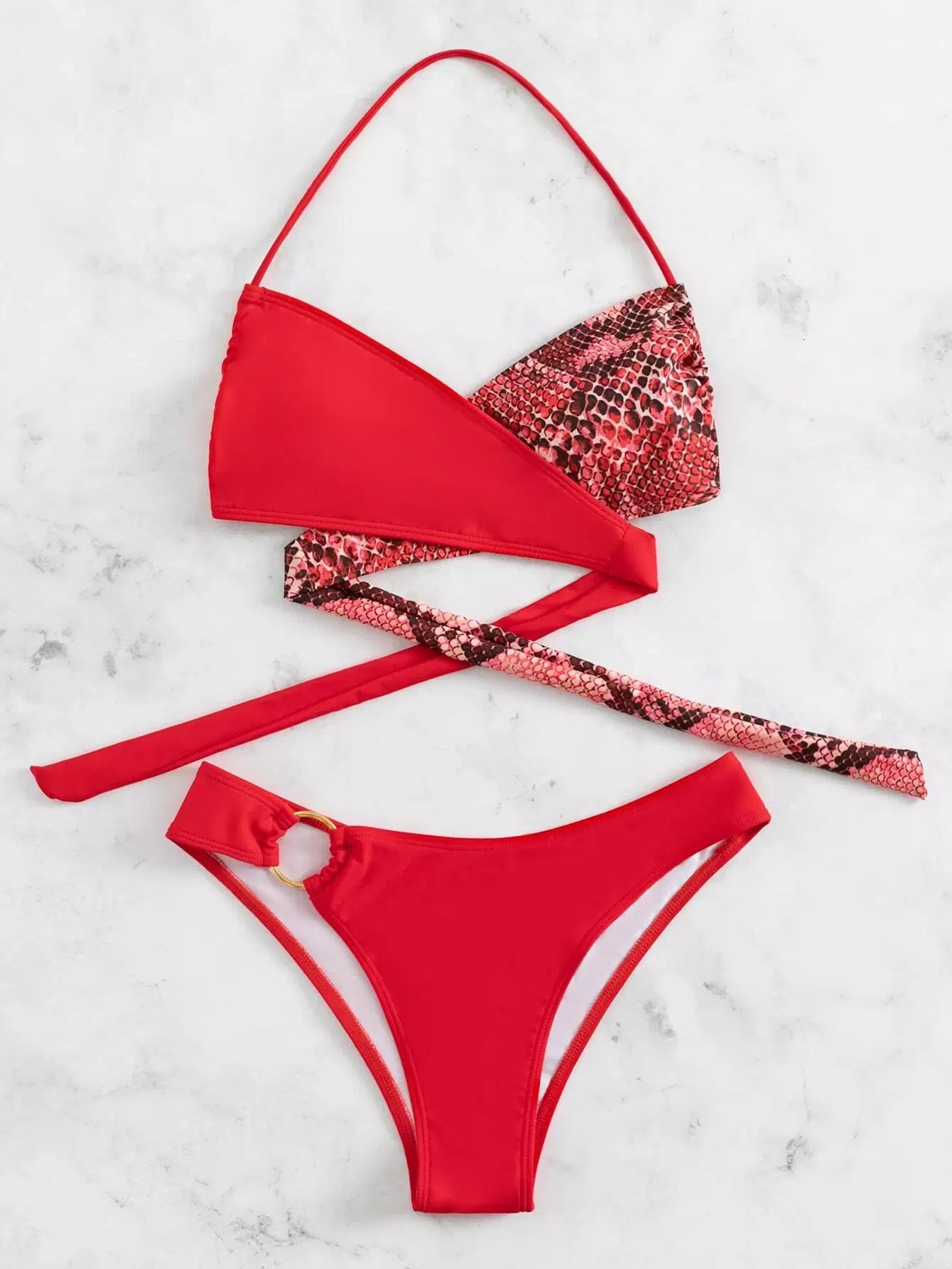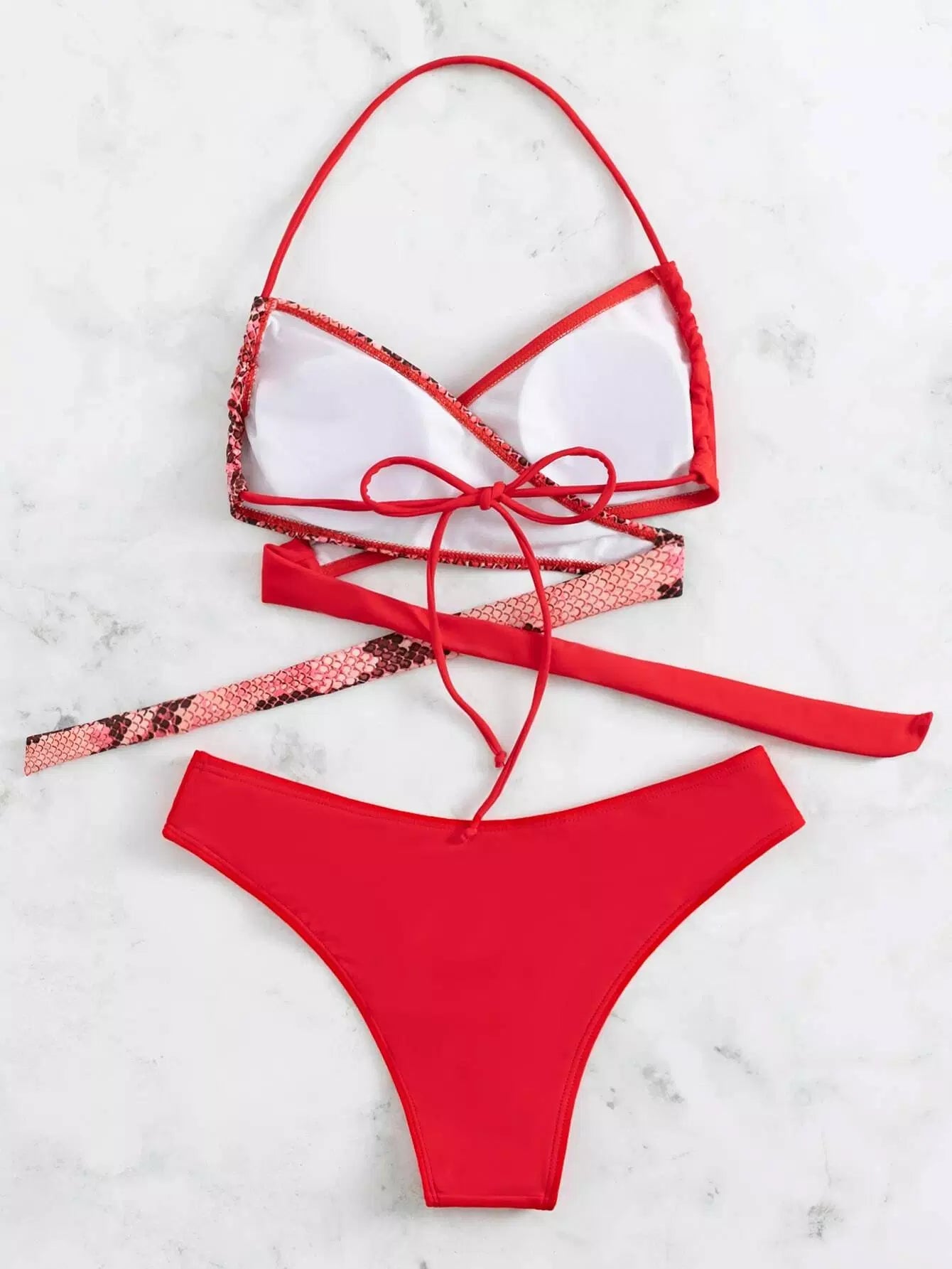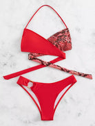 Snakeskin Print Wrap Halter Bikini Swimsuit