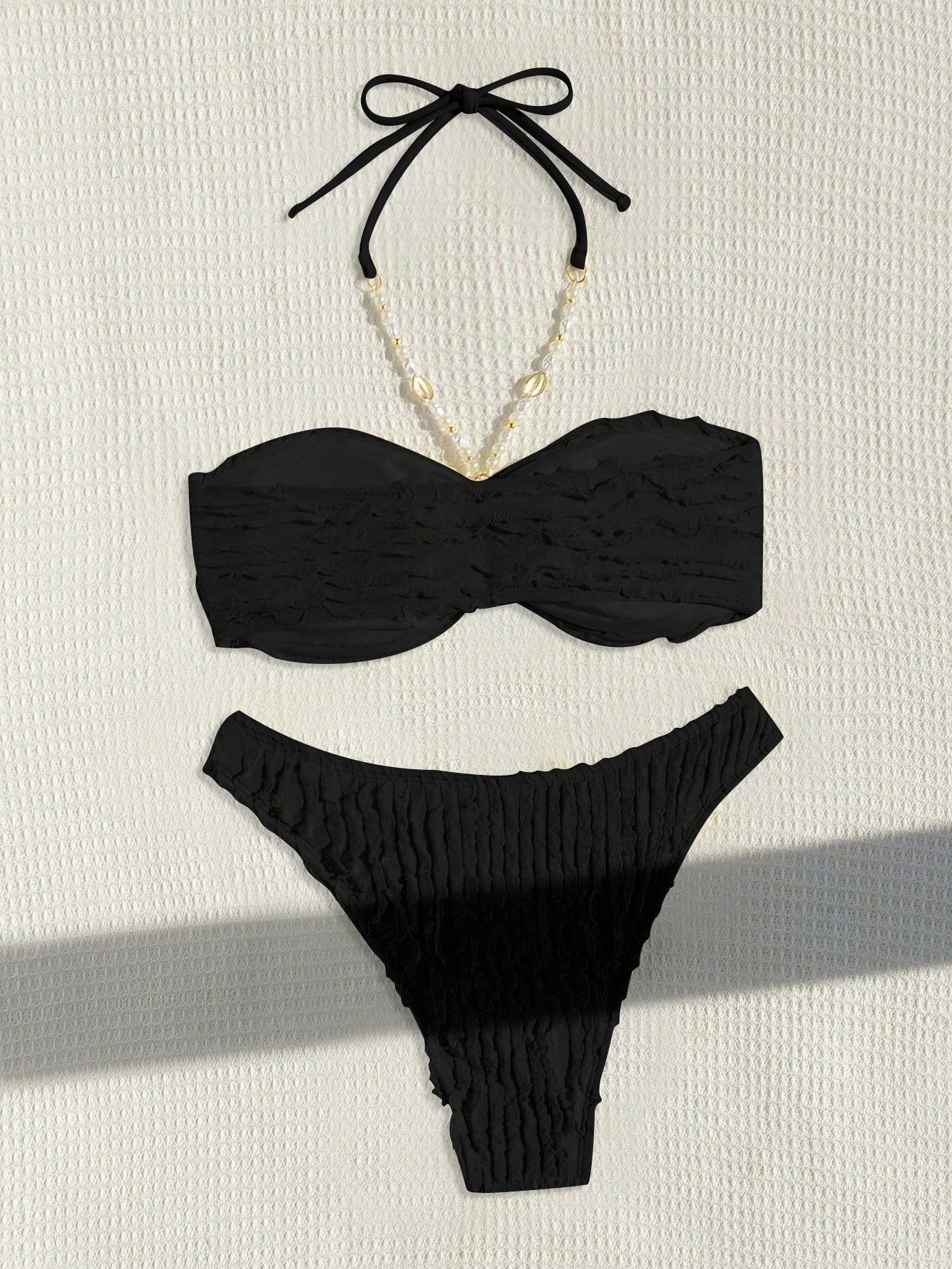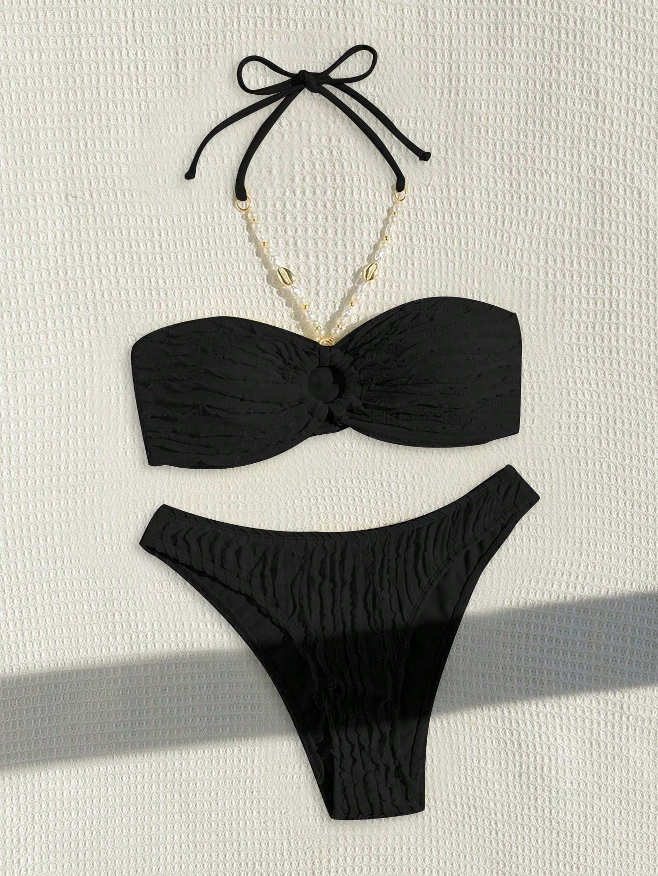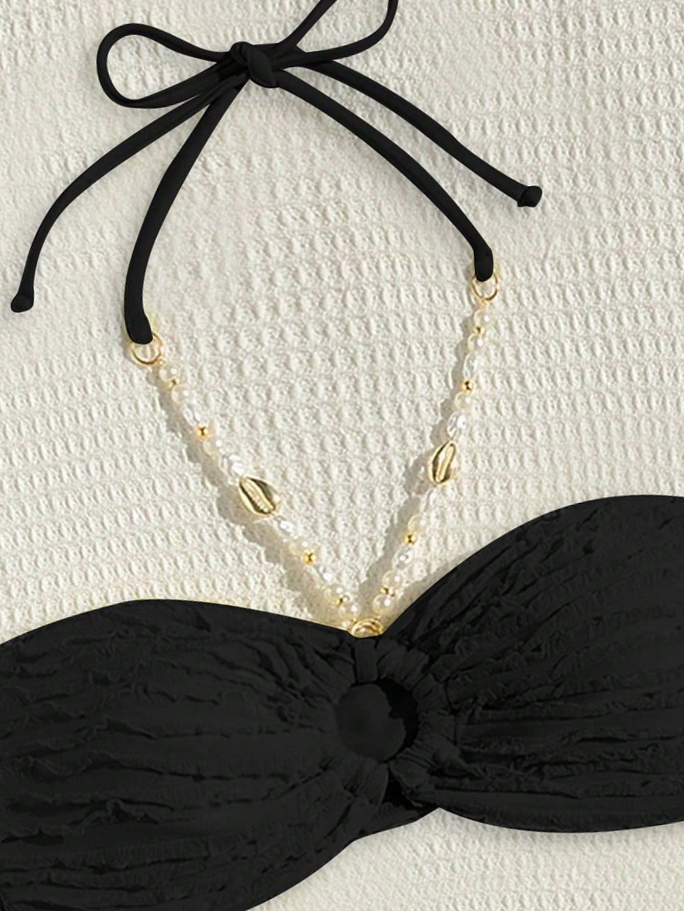 Swim Women Summer Vacation Beach Faux Pearl Halter Bikini Set