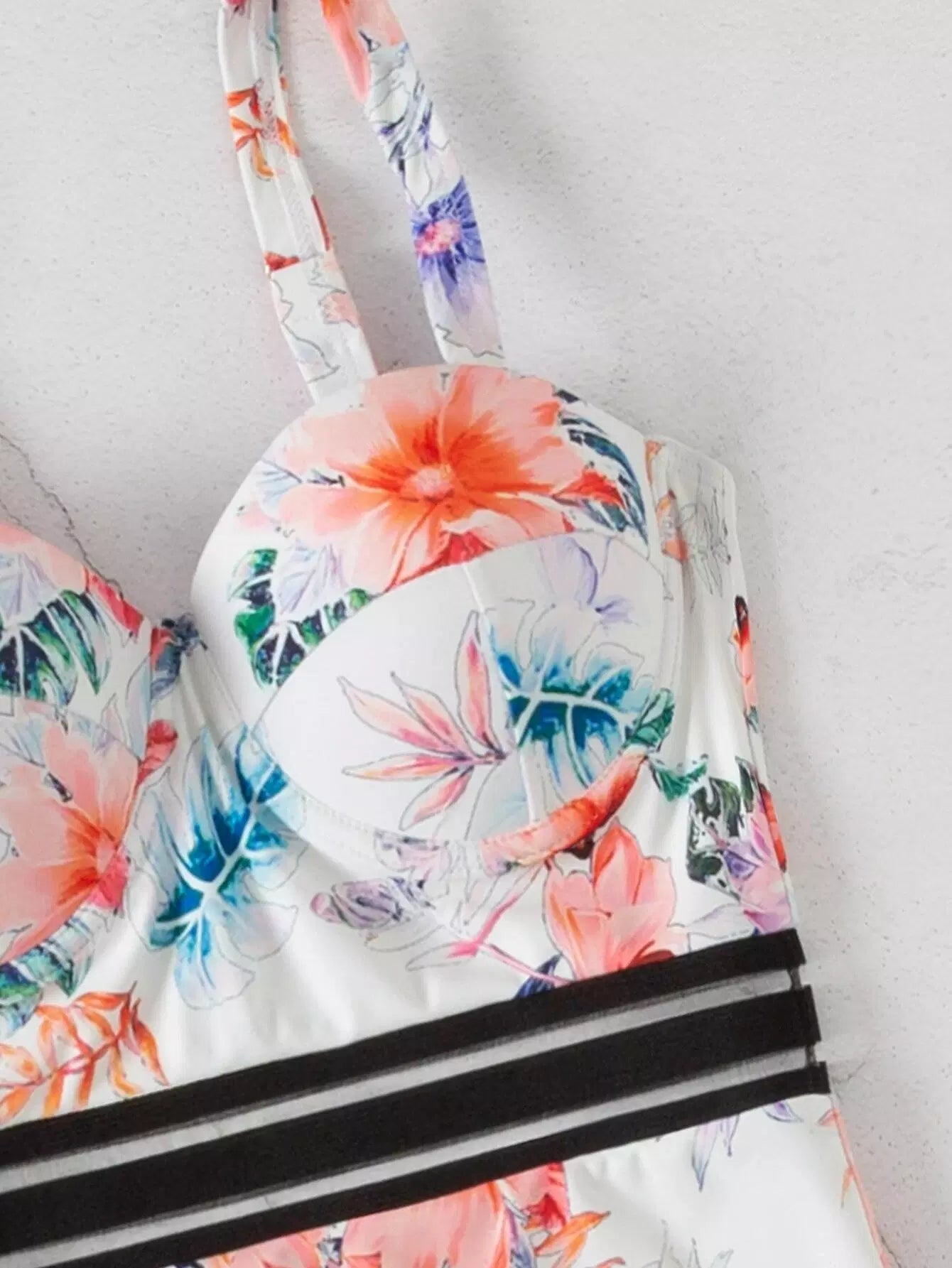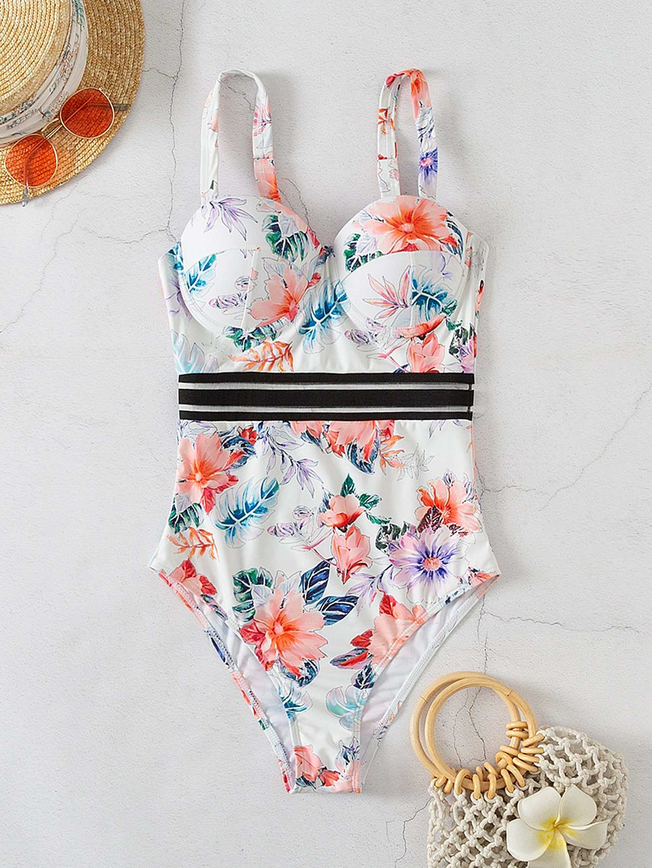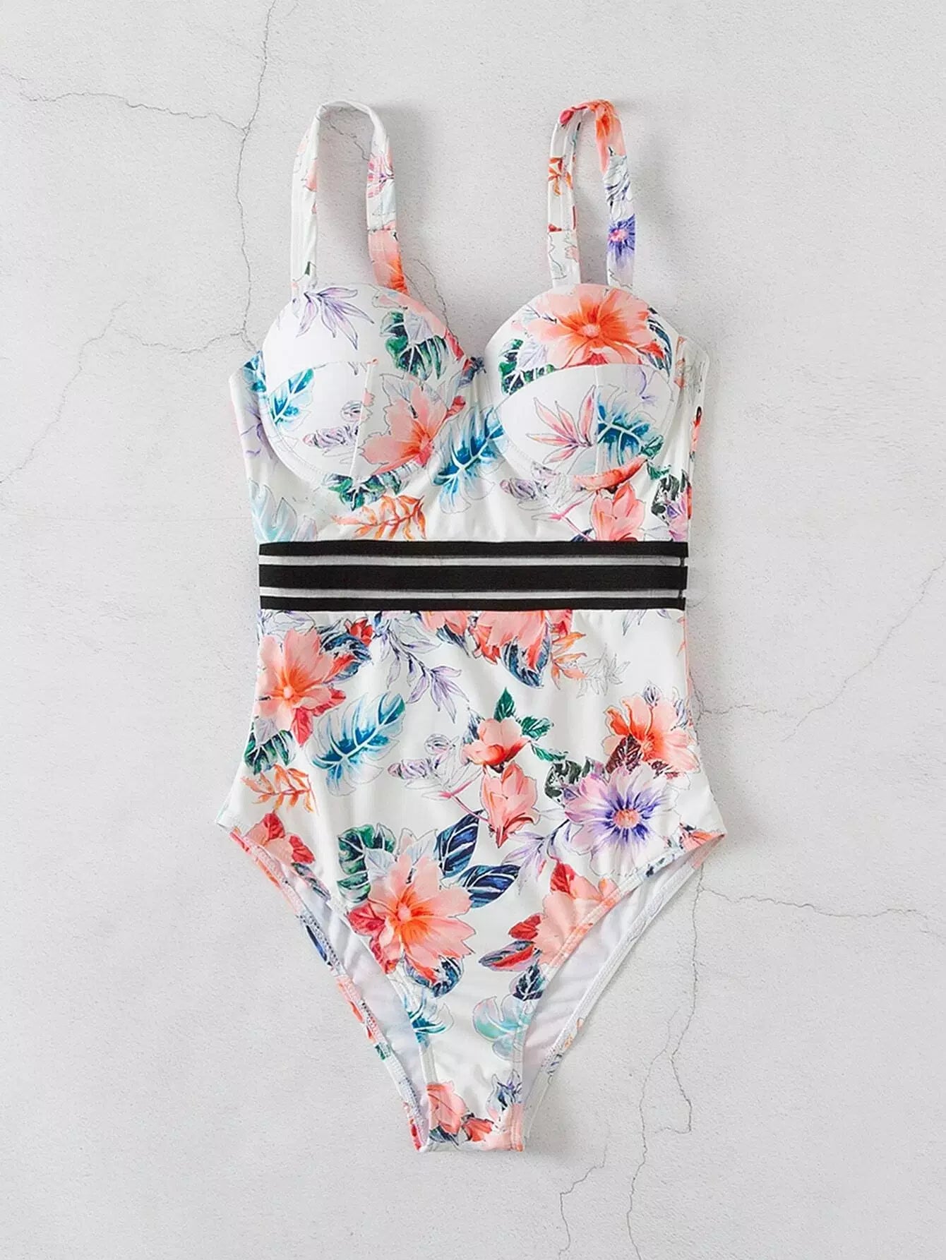 Floral Print Contrast Mesh Push Up One Piece Swimsuit