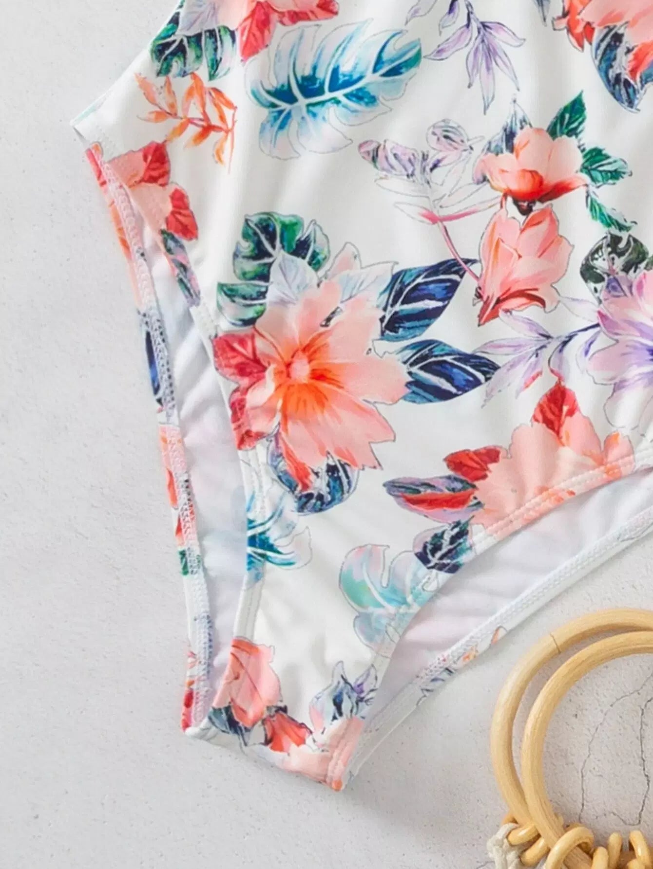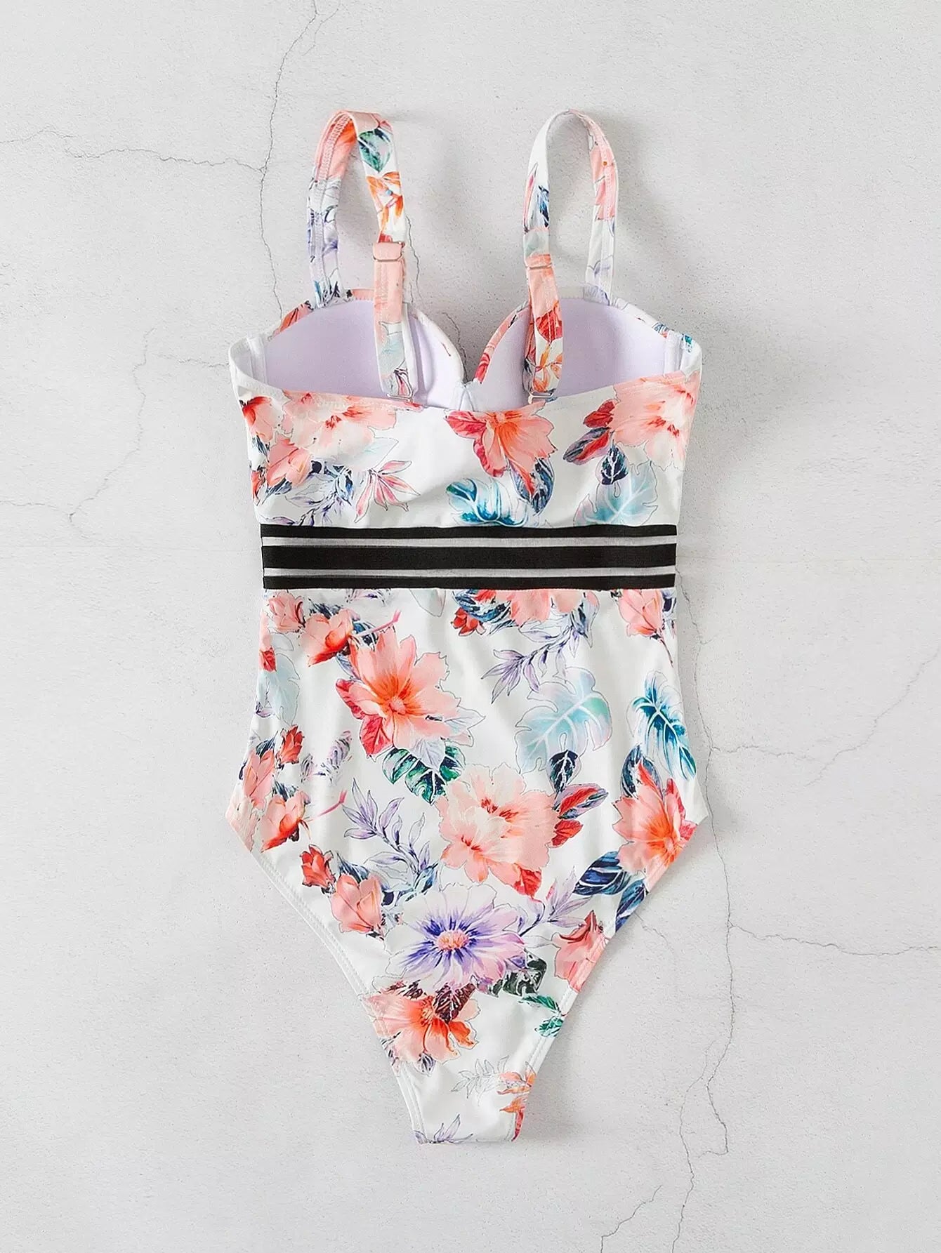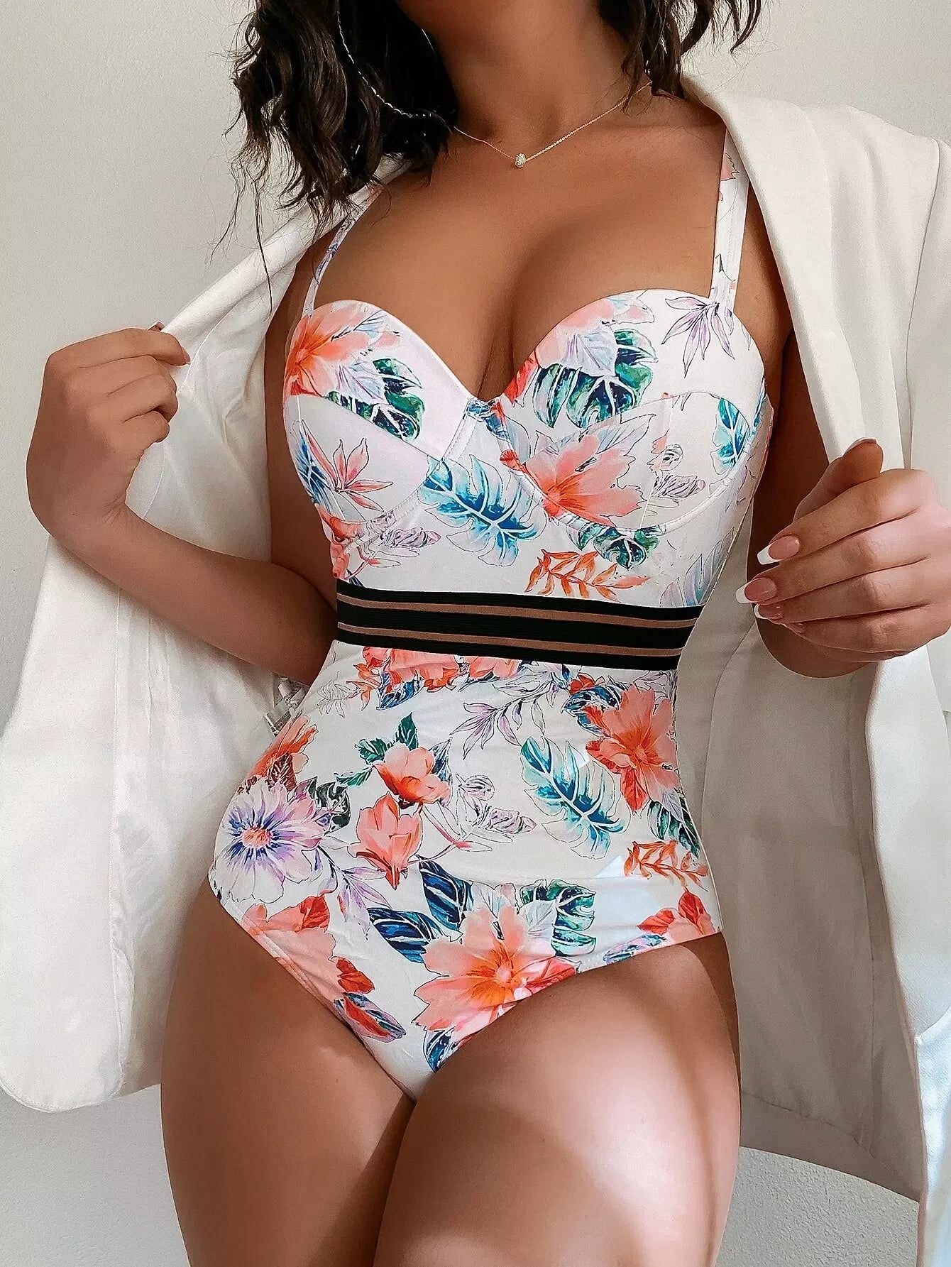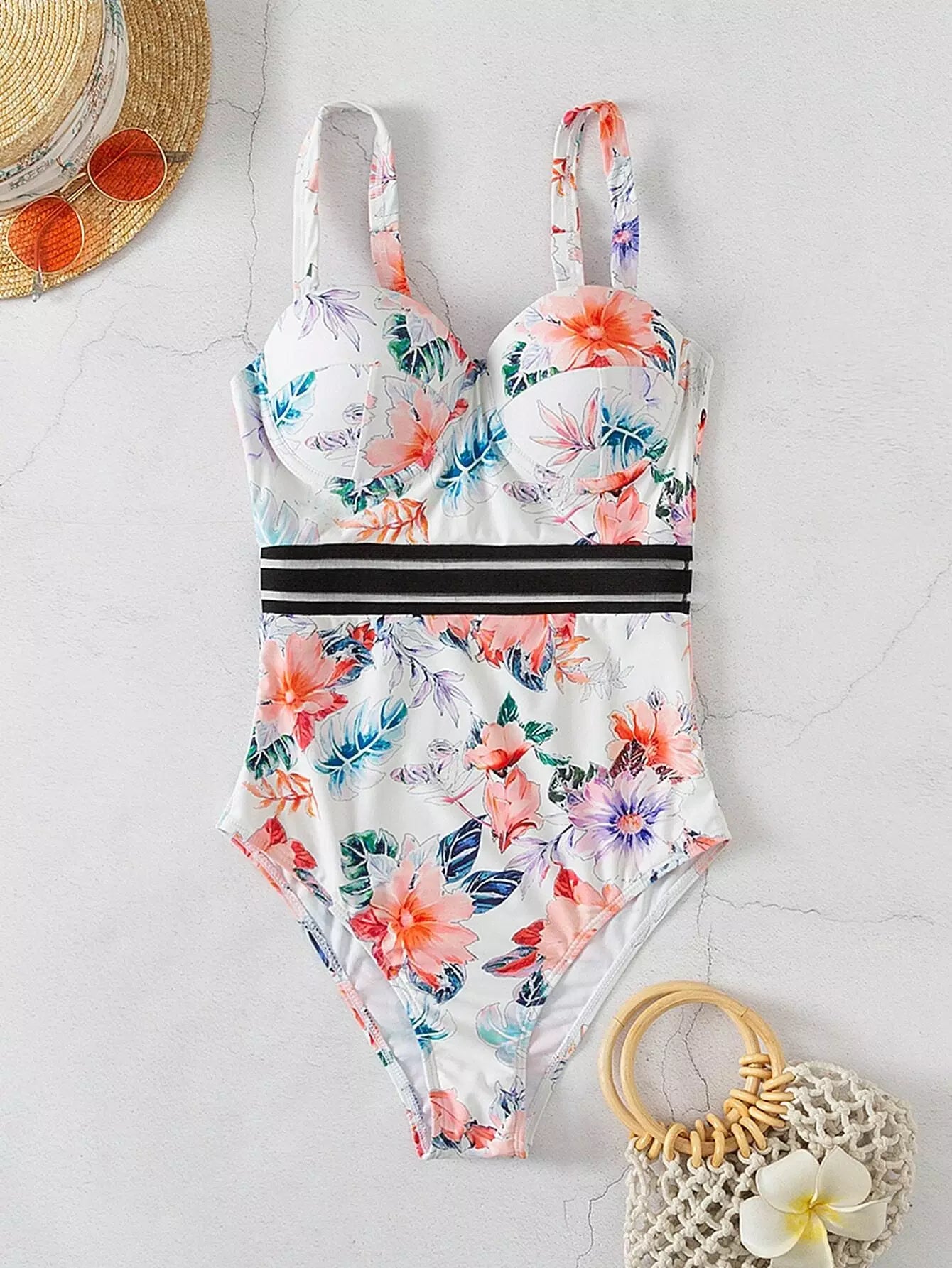 Floral Print Contrast Mesh Push Up One Piece Swimsuit