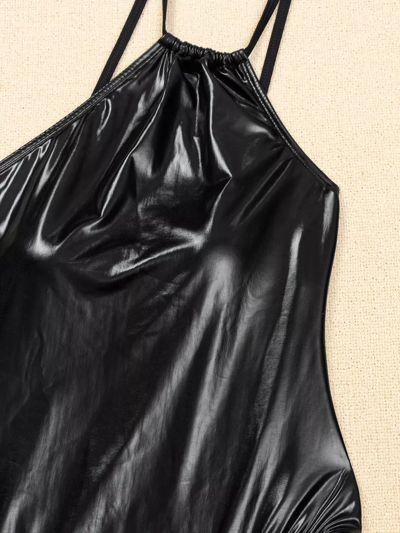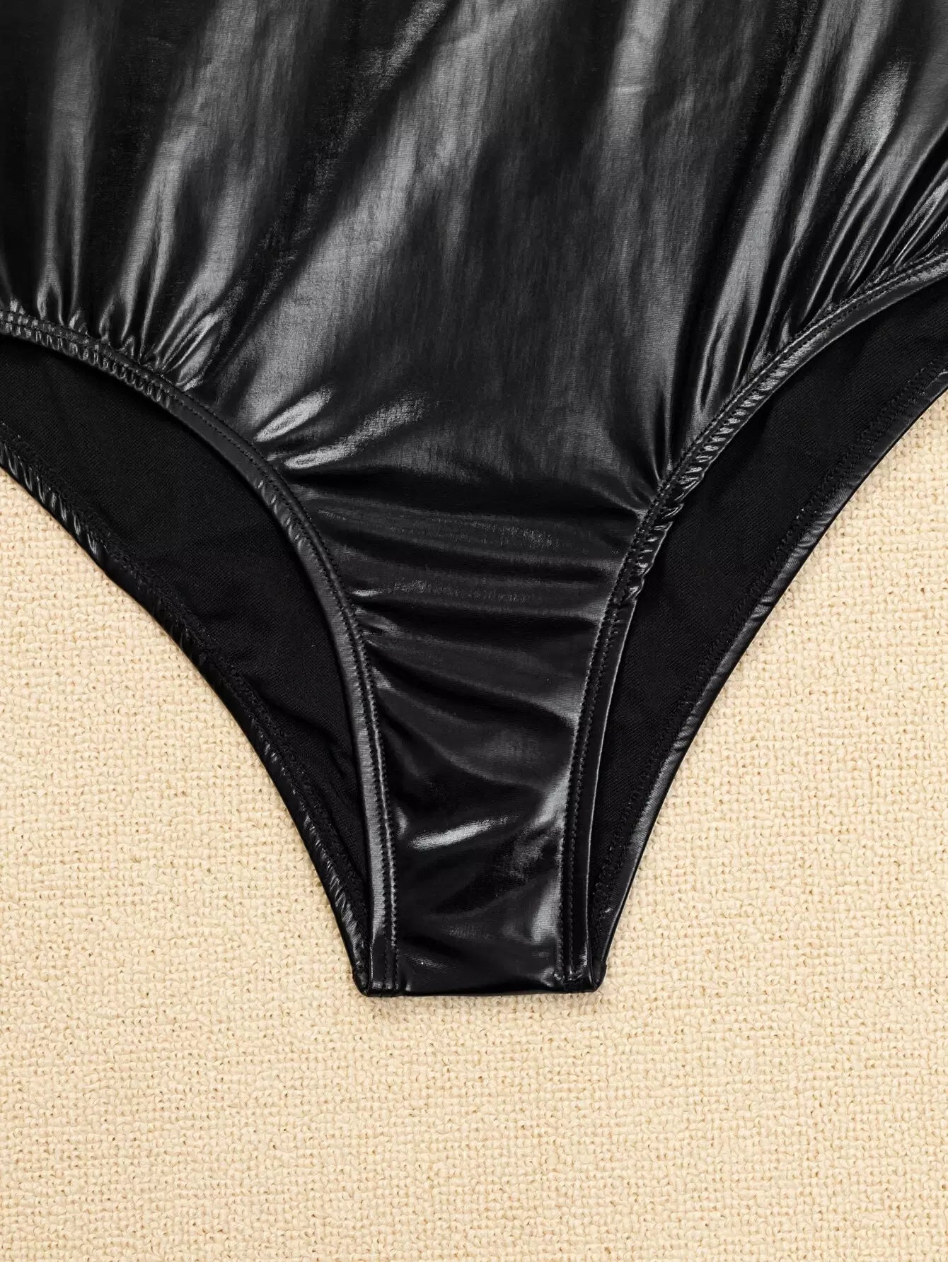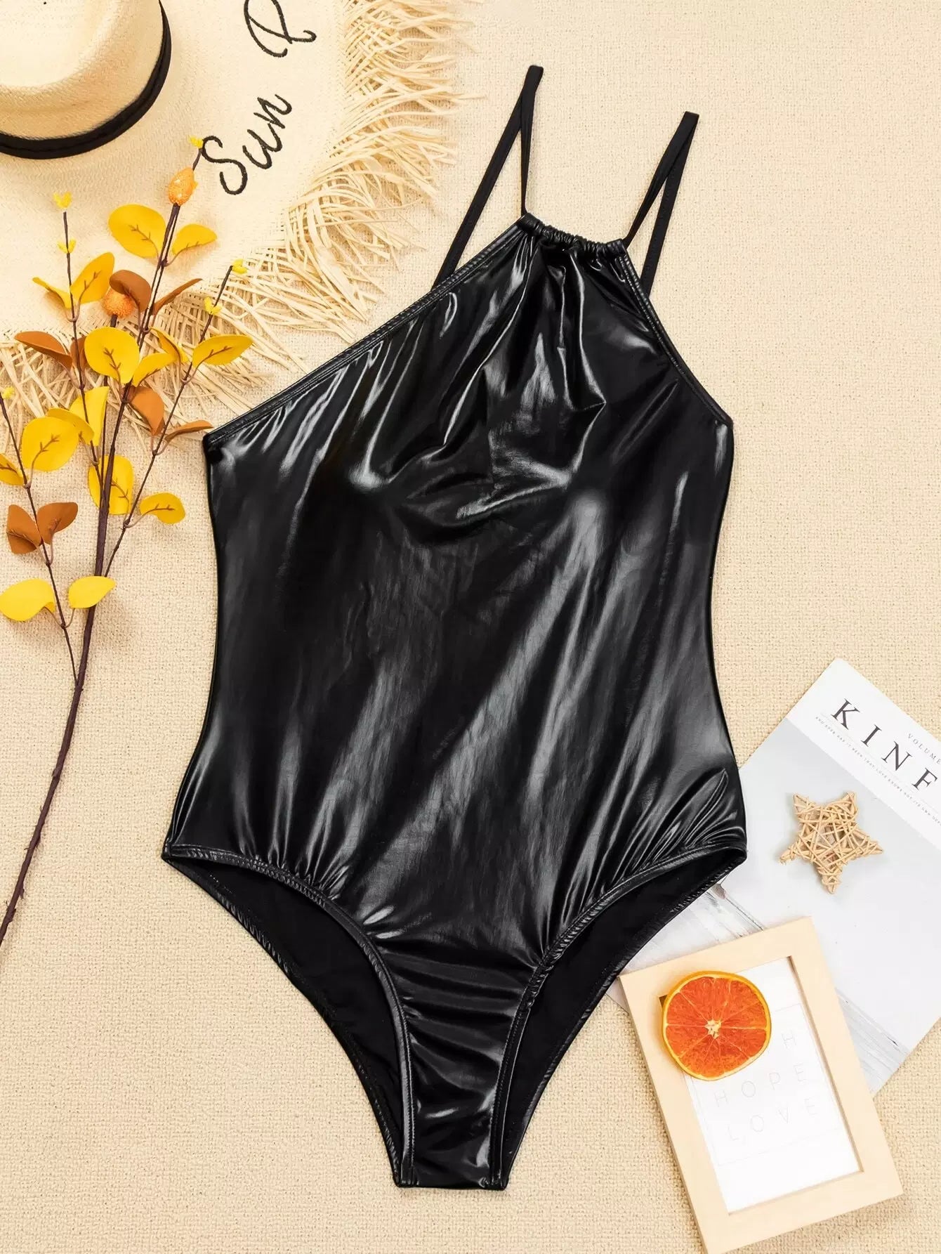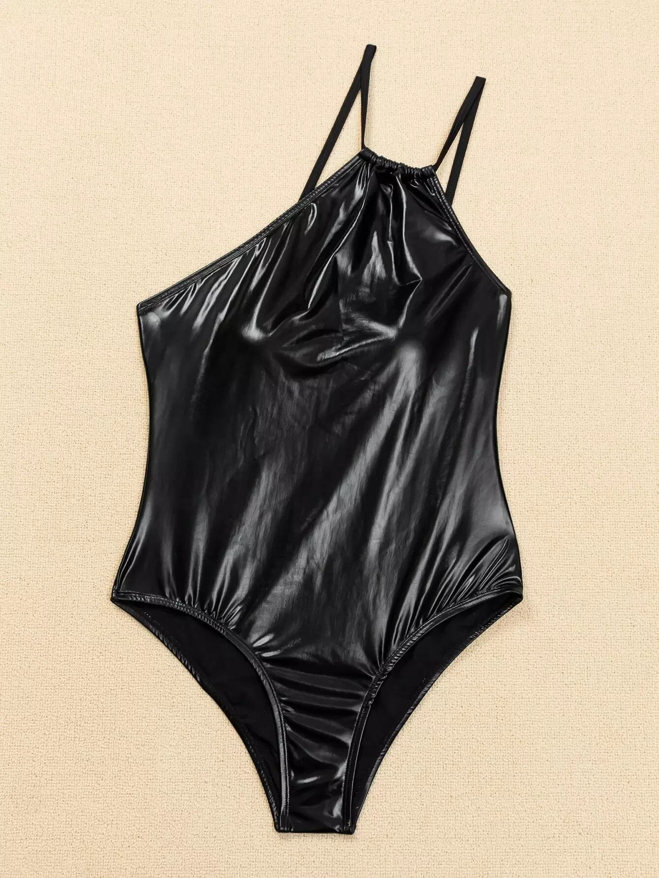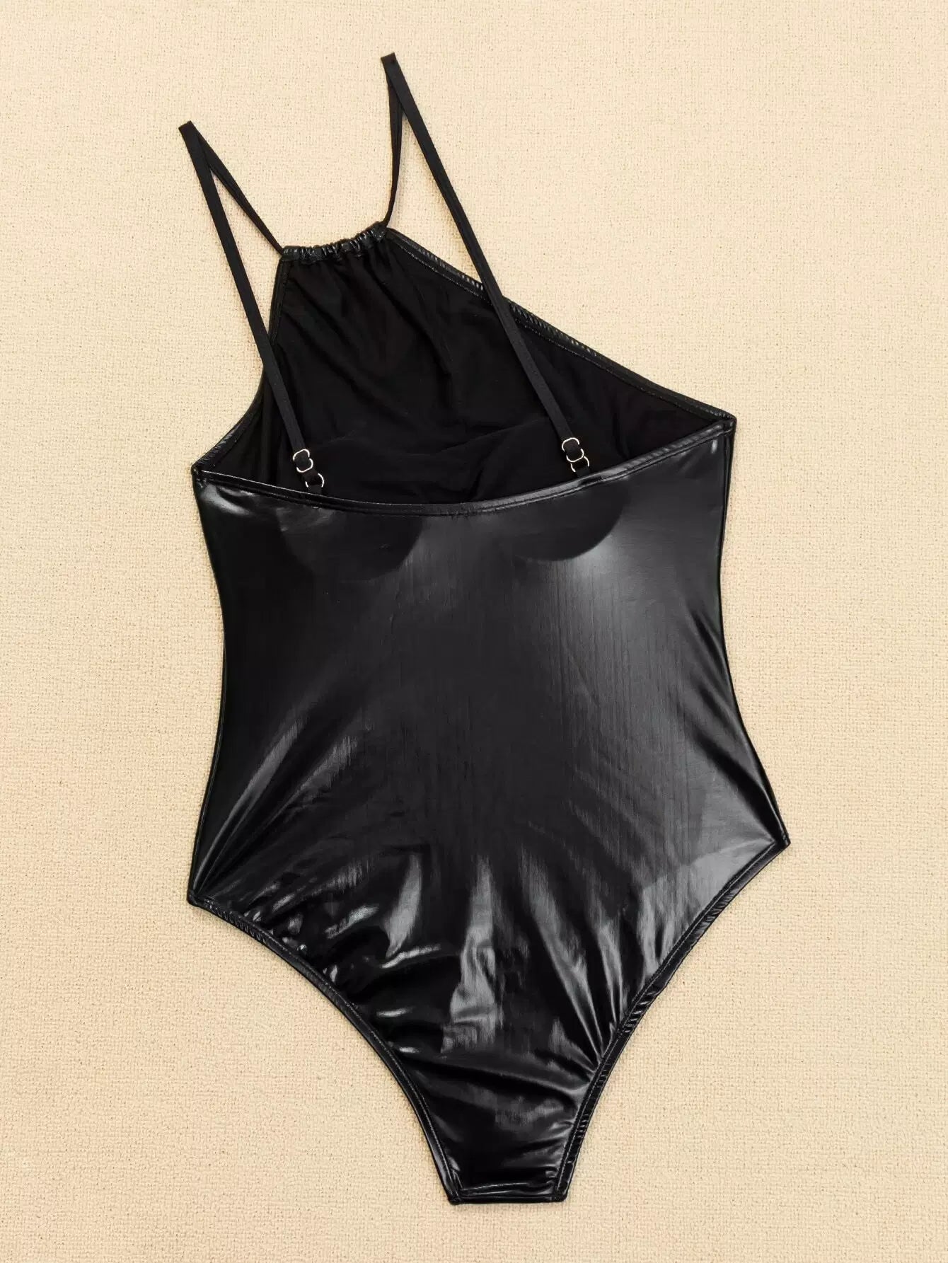 Women - Solid PU One Shoulder One Piece Swimsuit