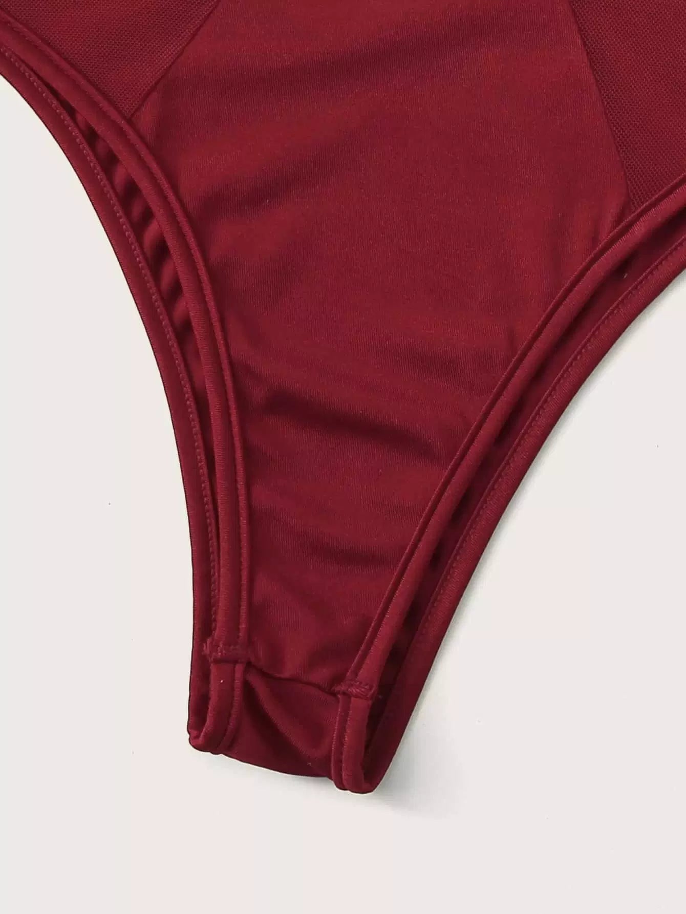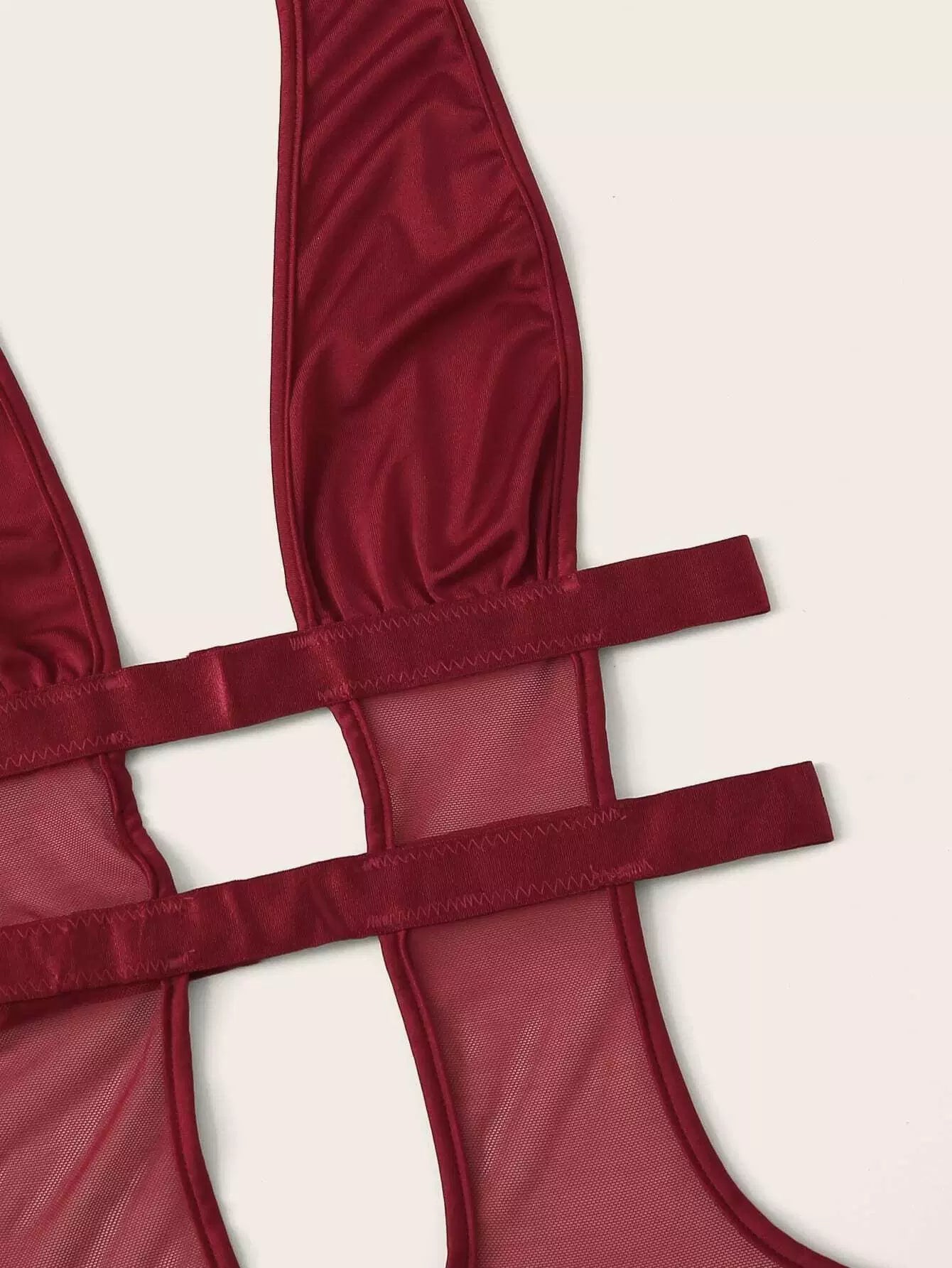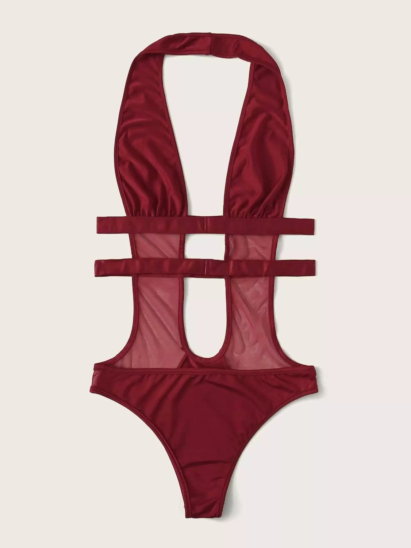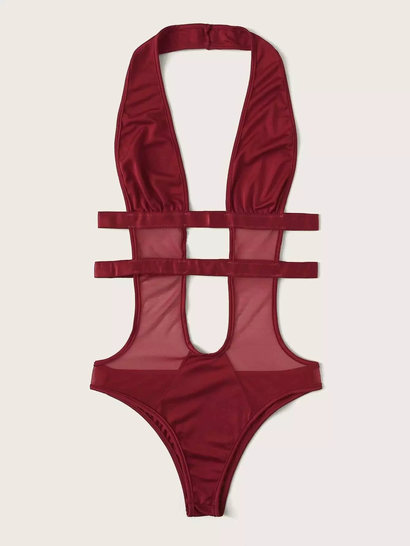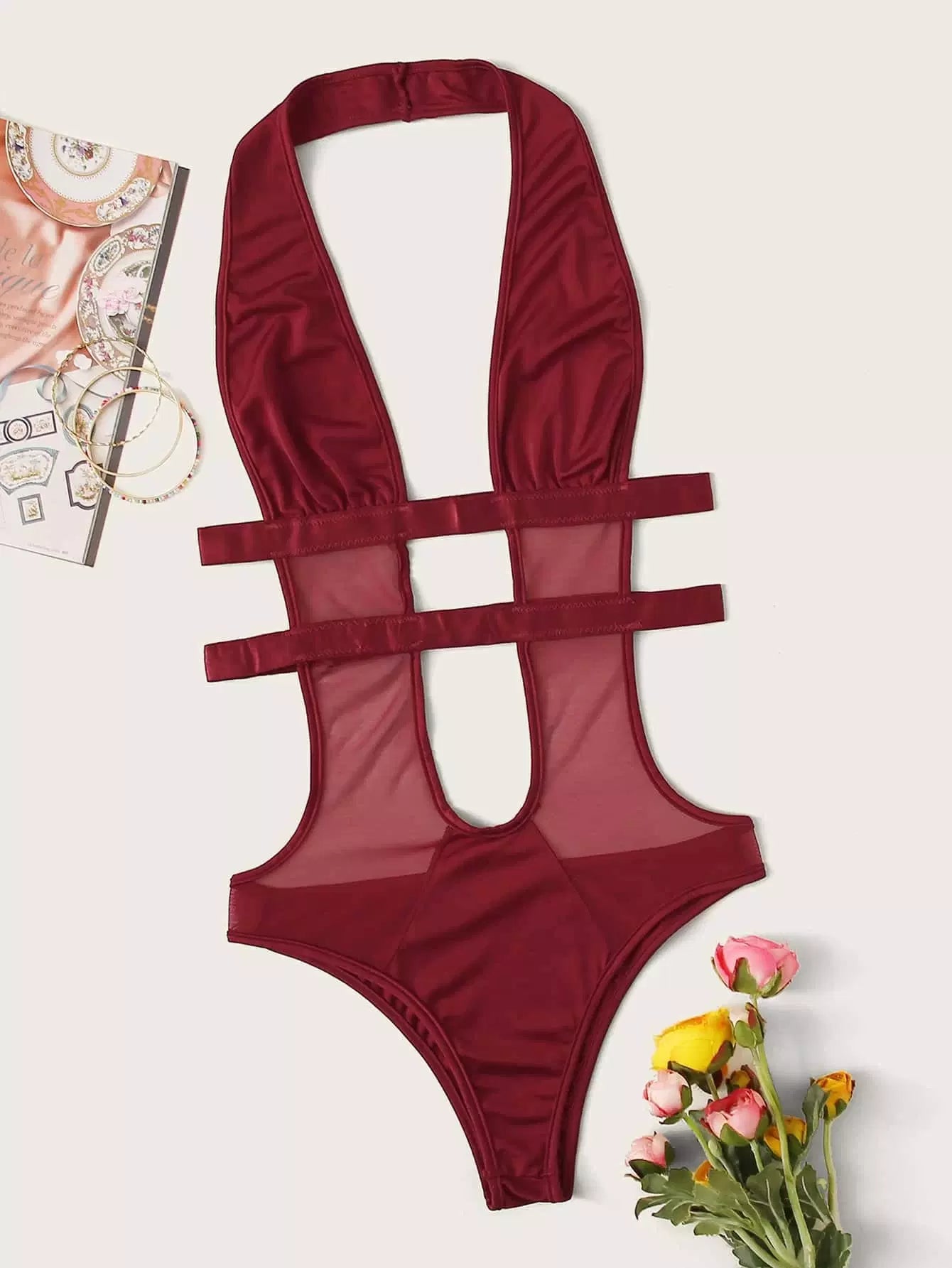 Contrast Mesh Cut-out Halter Teddy Bodysuit