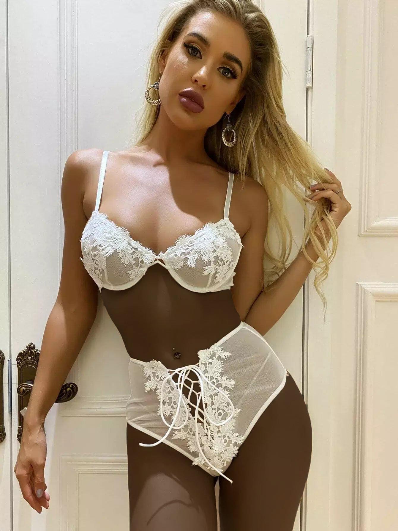Appliques Mesh Lace-up Front Underwire Lingerie Set