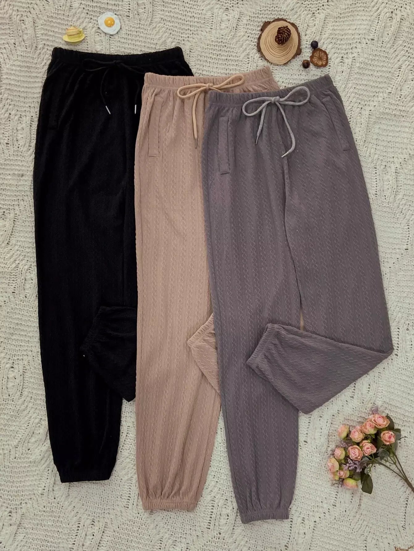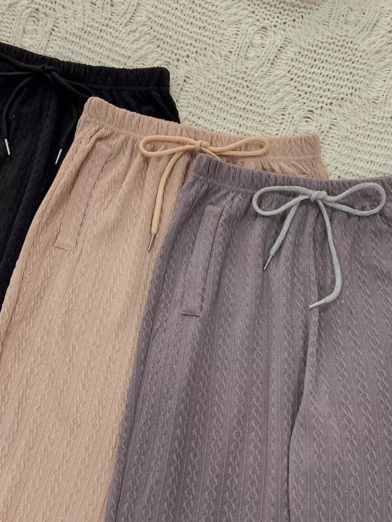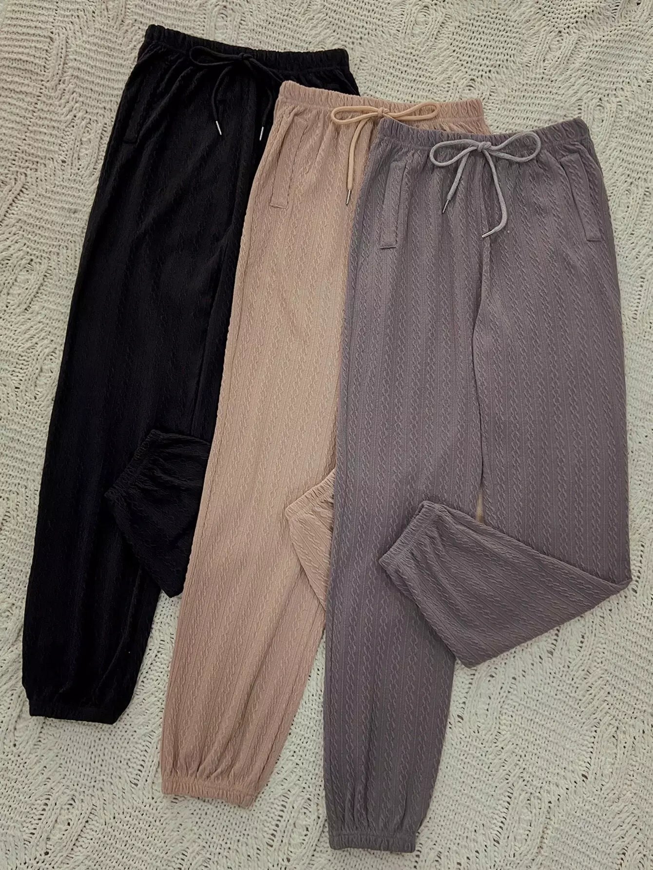 Women - 3pcs Slant Pockets Drawstring Waist Textured Lounge Pants