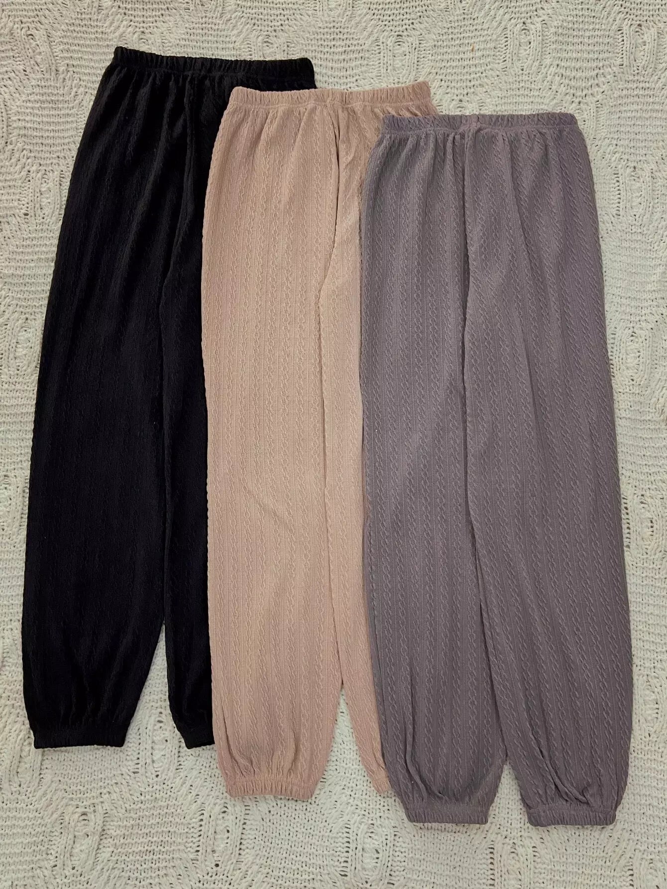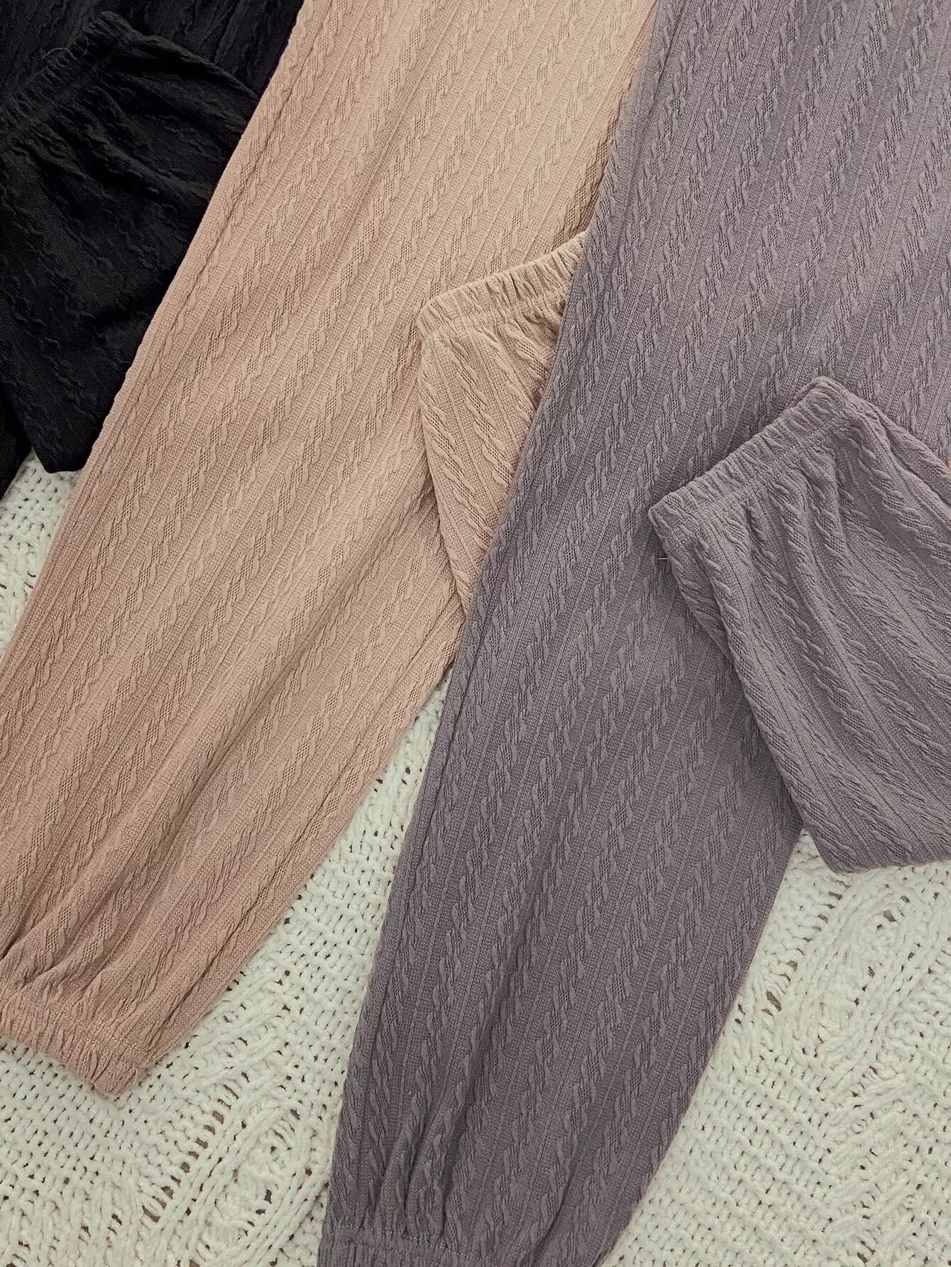 3pcs Slant Pockets Drawstring Waist Textured Lounge Pants