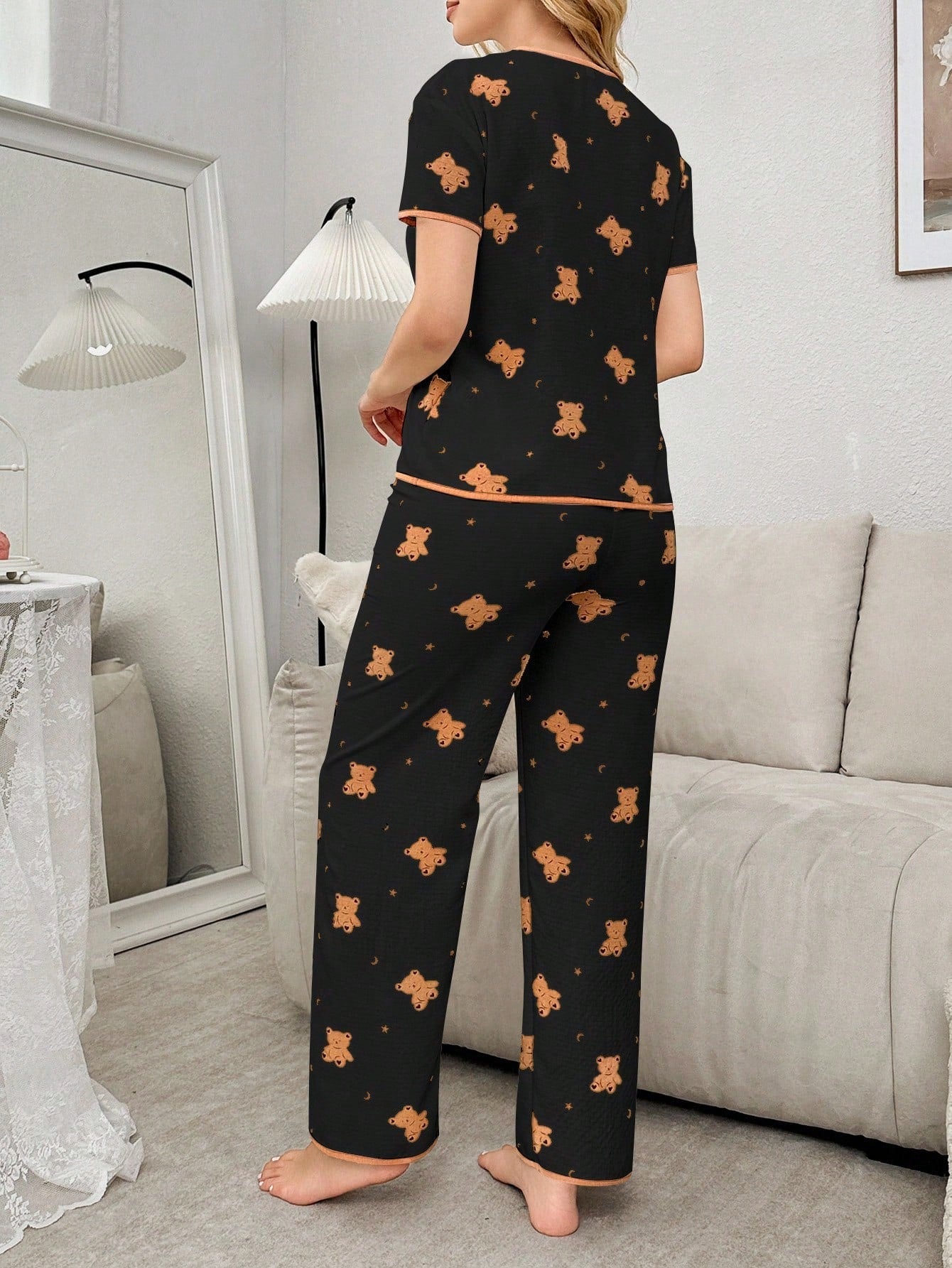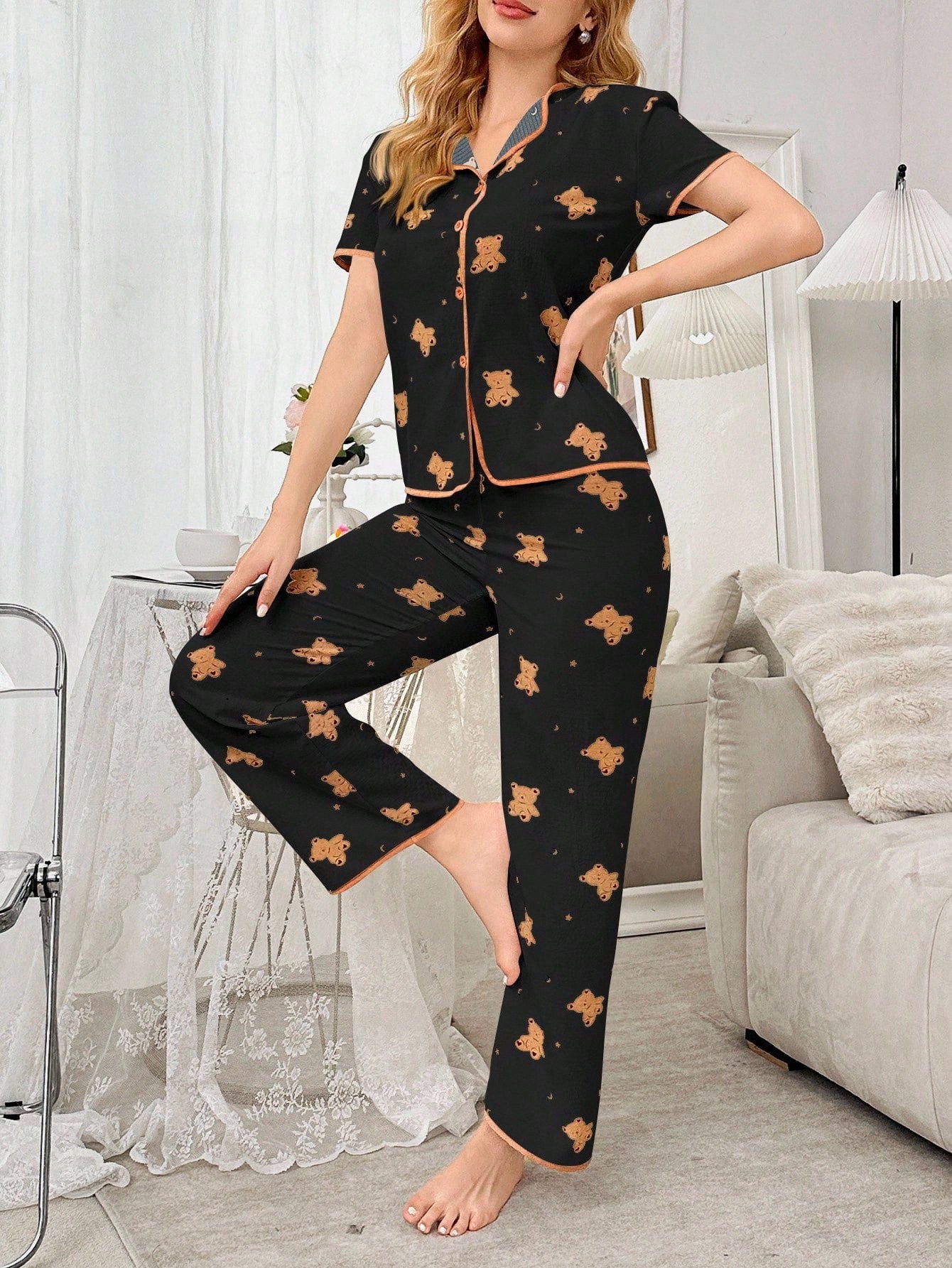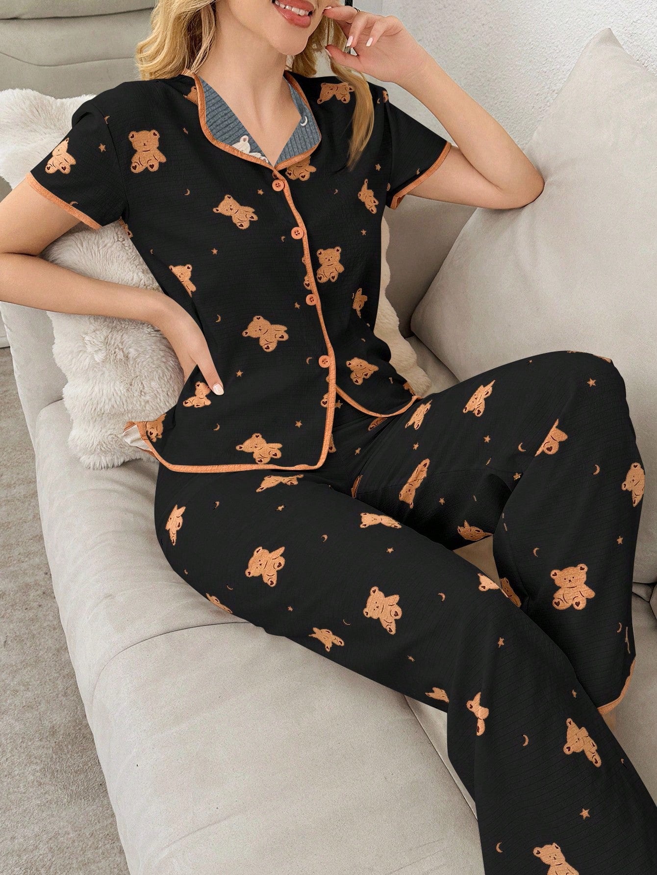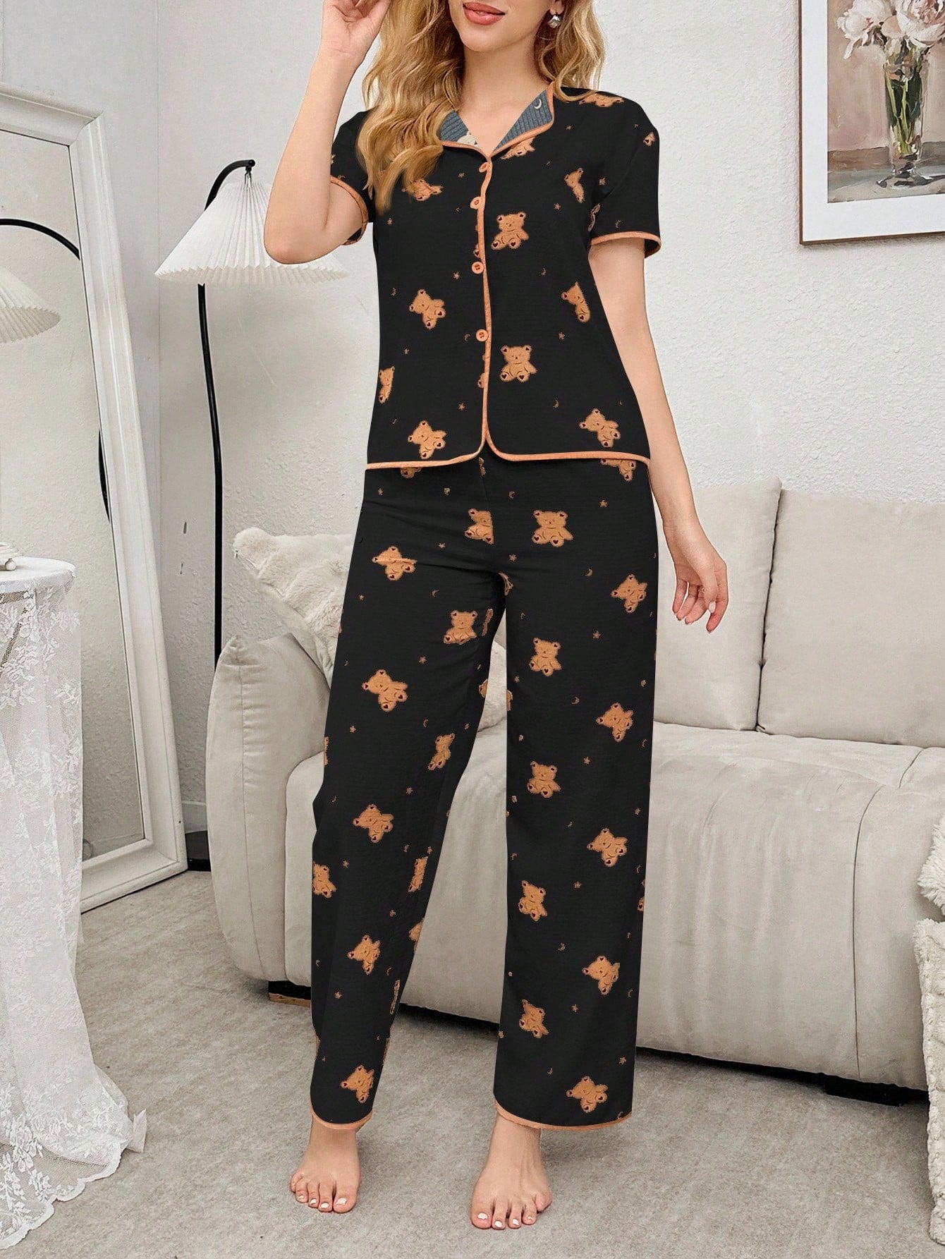 Adorable Bear & Celestial Print Collar Short Sleeve Top And Pants Women Pajama Set