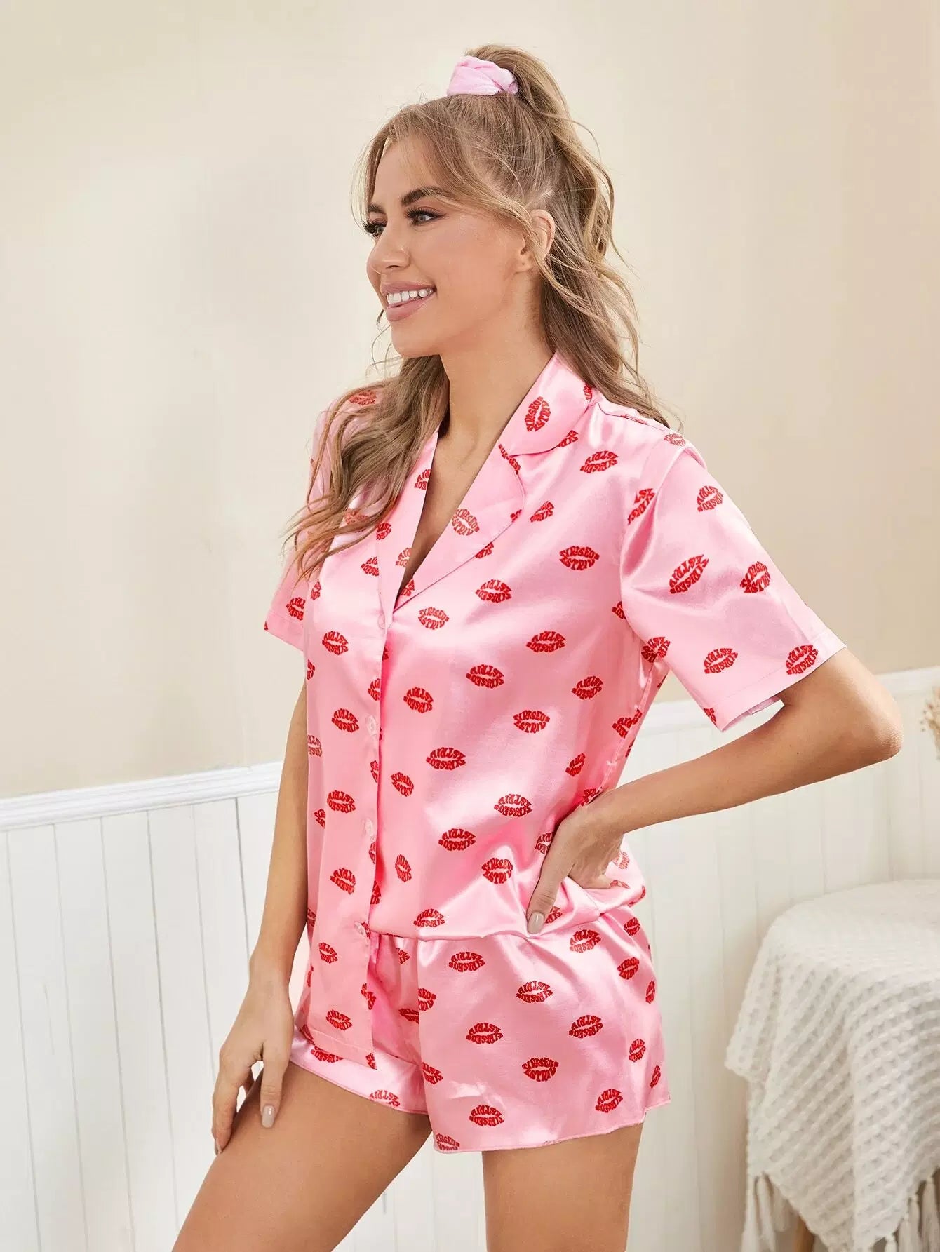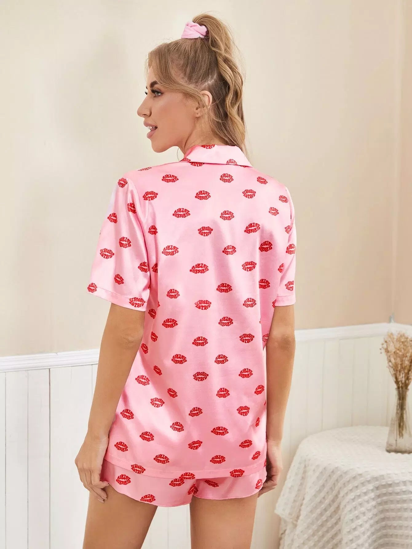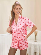 Allover Lip Print Satin Night Set