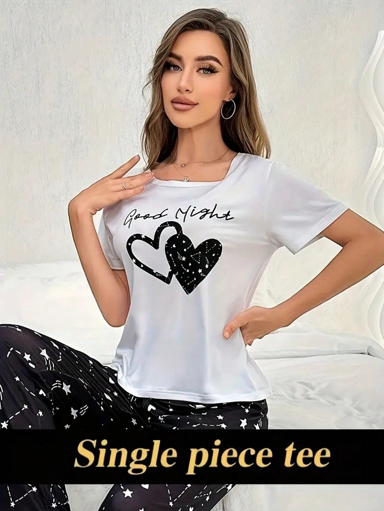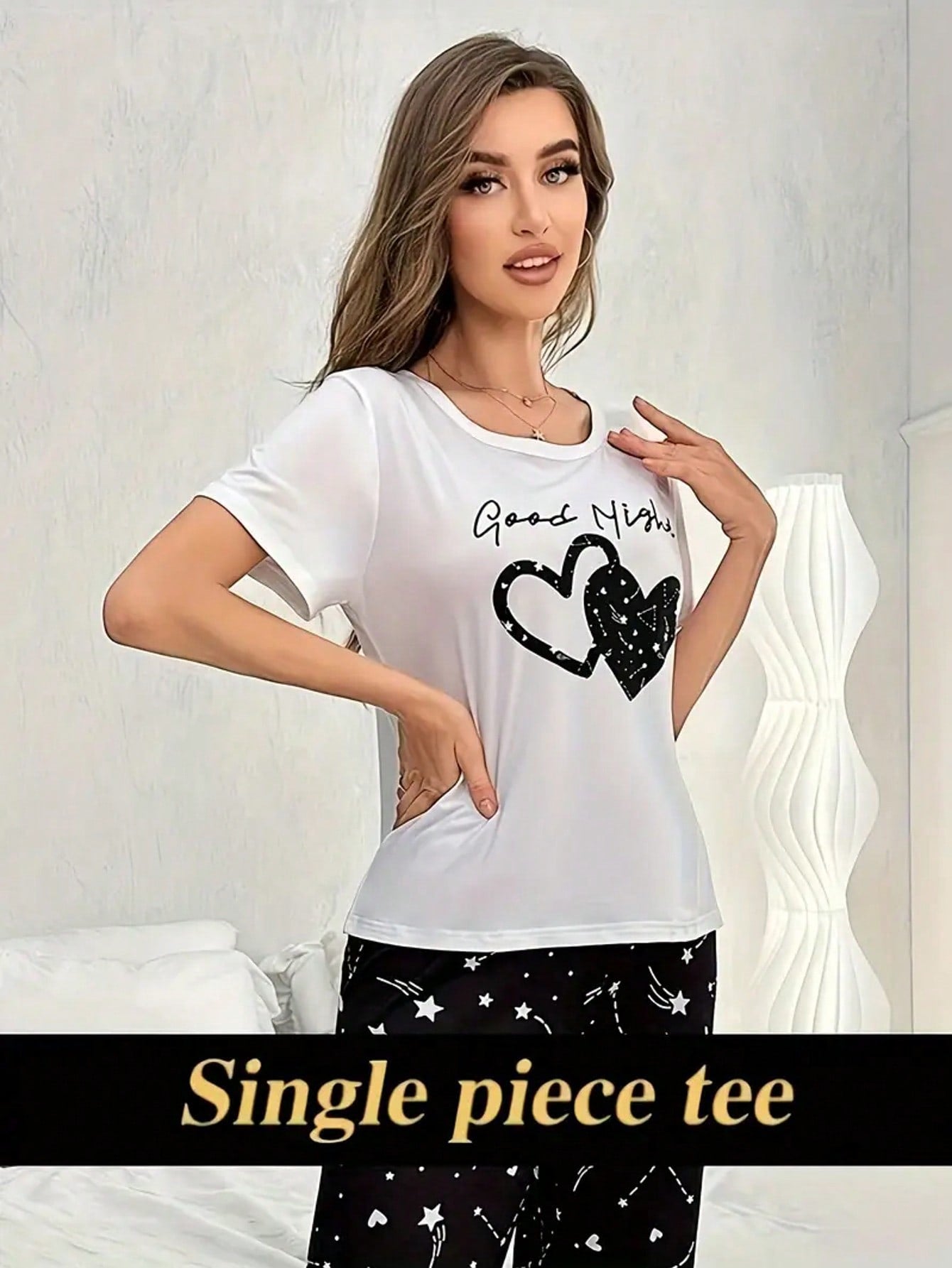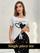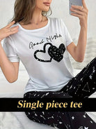 Casual Heart & Slogan Print Night Top, Short Sleeve Round Neck Stretchy Top, Women's Sleepwear