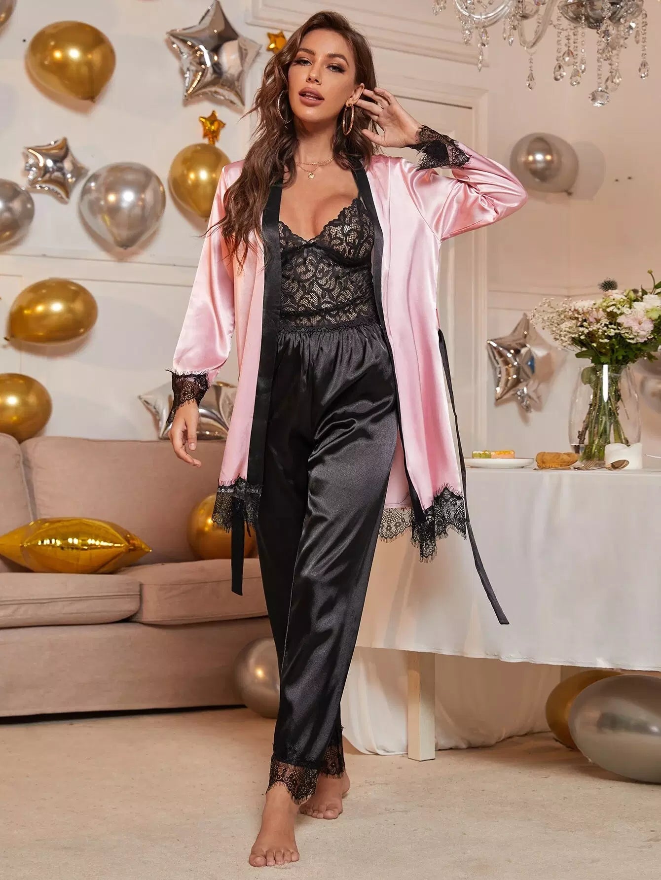Contrast Eyelash Lace Trim Satin Robe & Cami Top & Pants PJ Set Without Belt