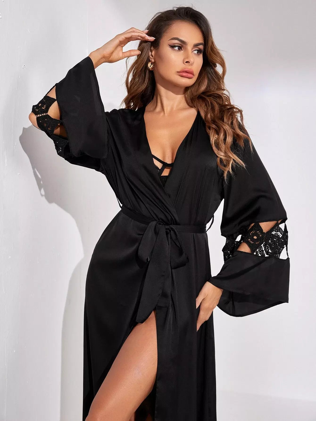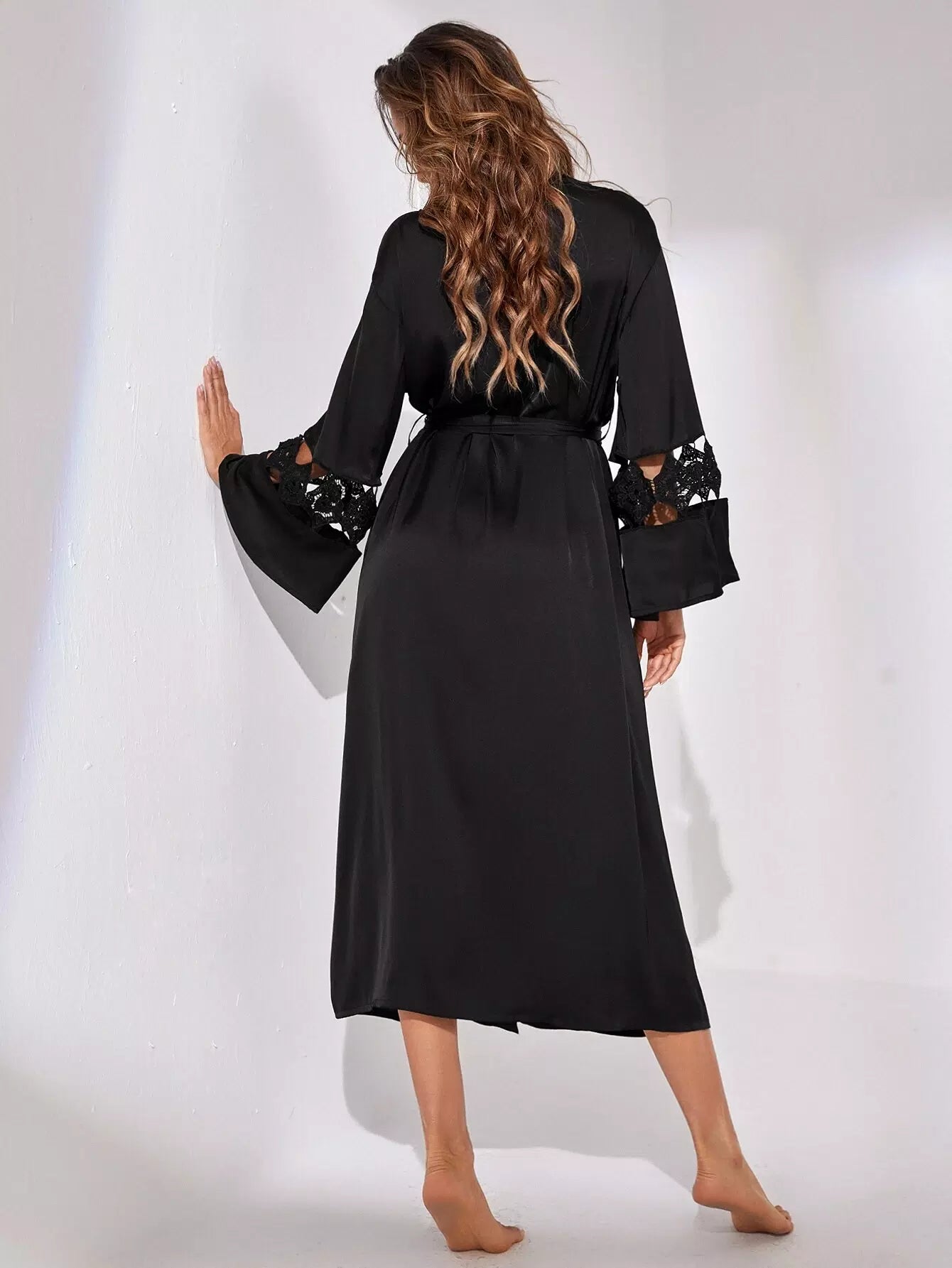Contrast Guipure Lace Flounce Sleeve Night Robe Without Belt