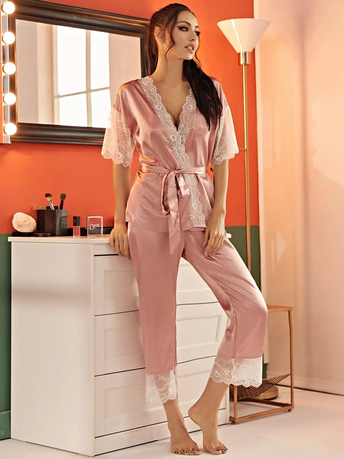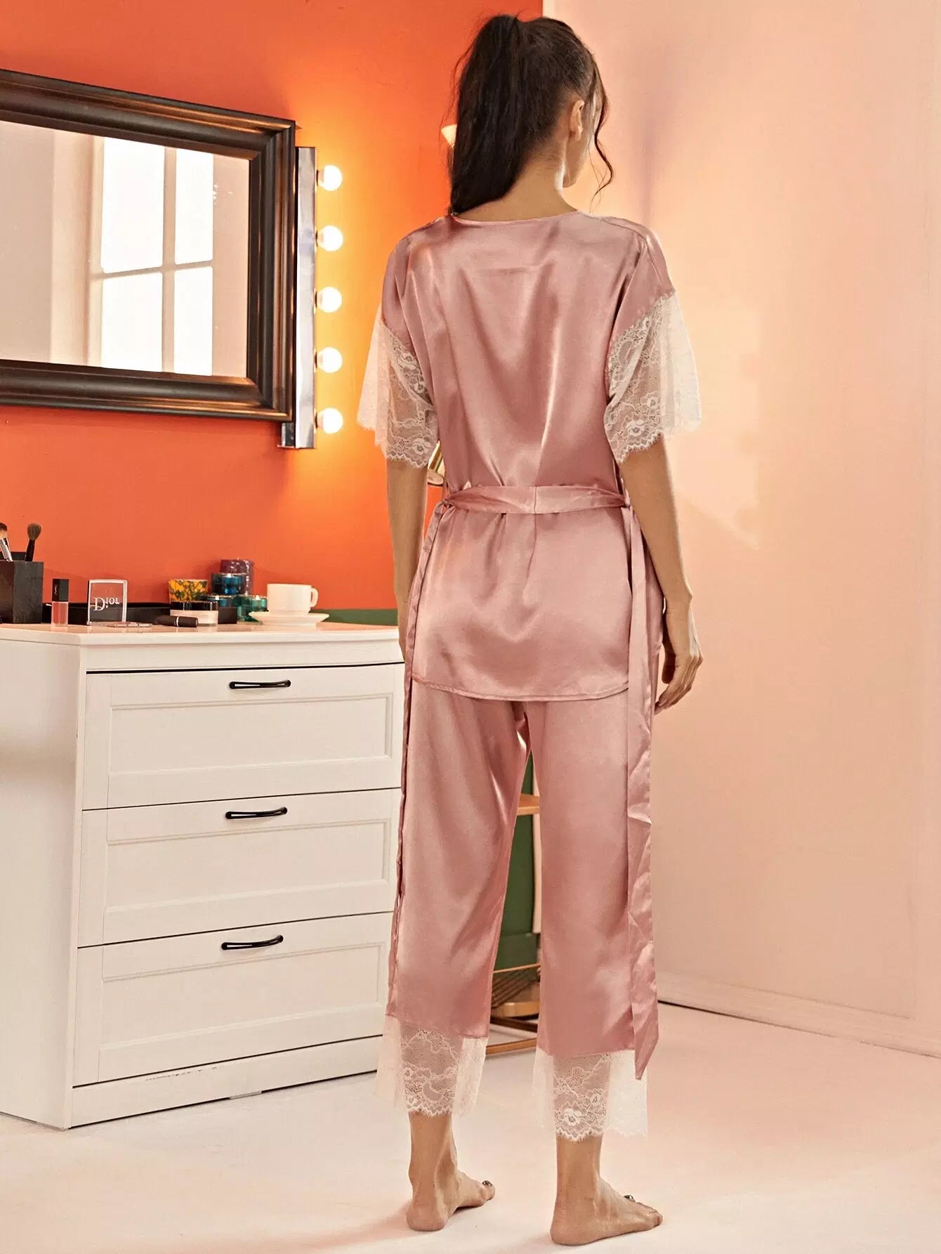 Women - Contrast Lace Scallop Trim Belted Satin Top & Pants PJ Set