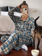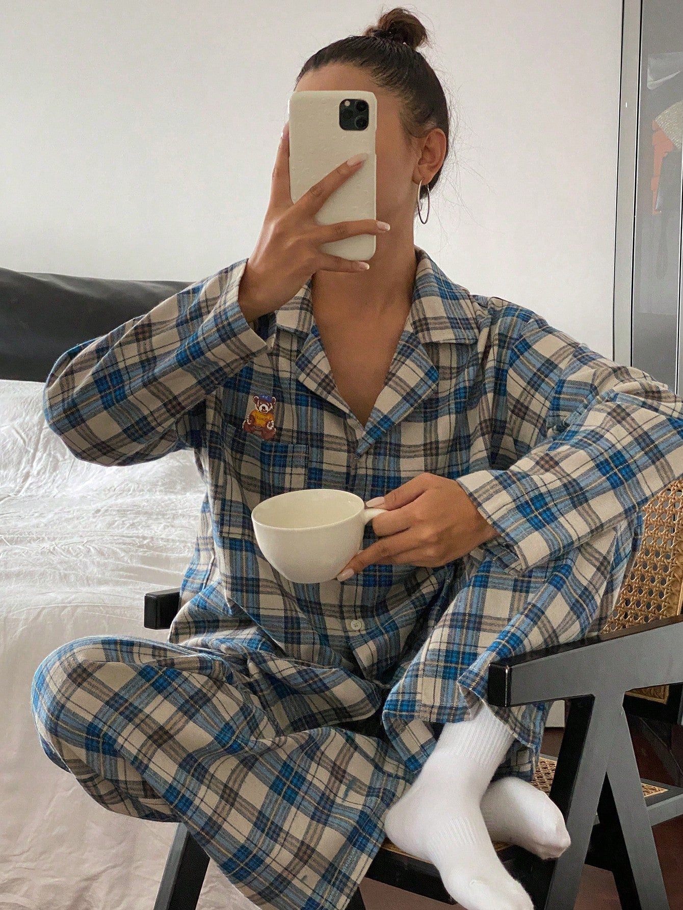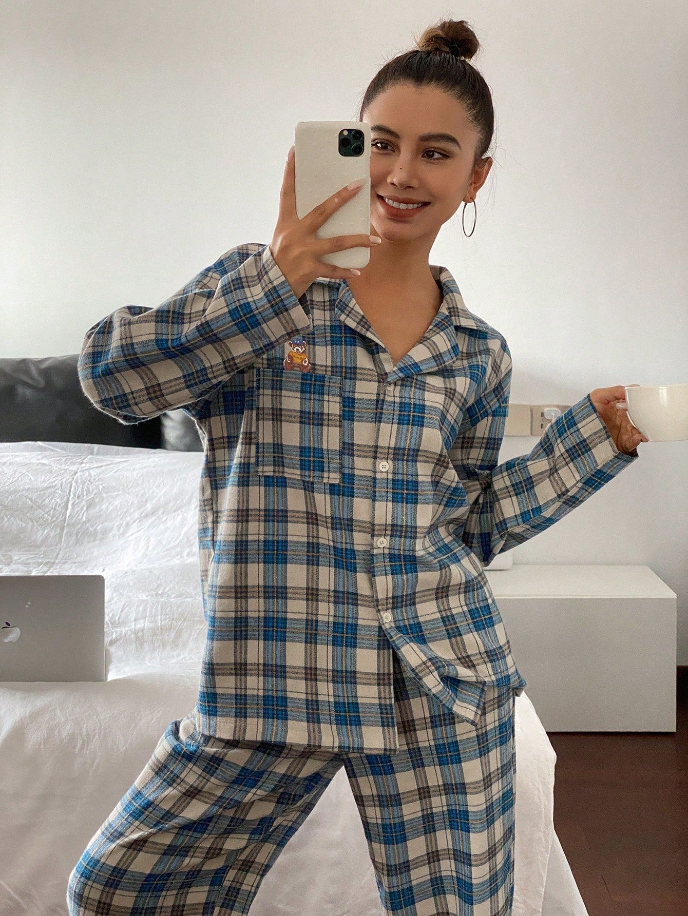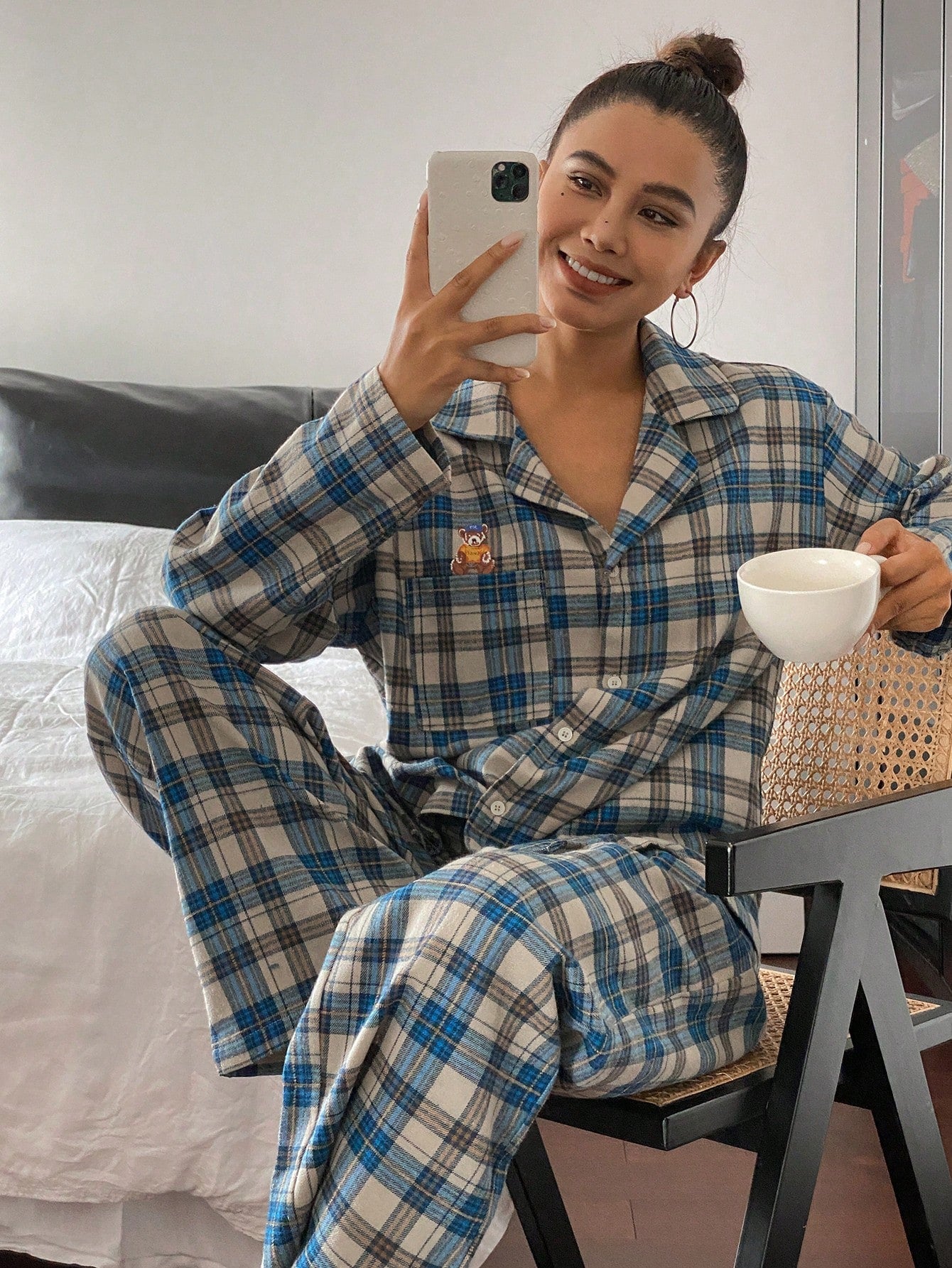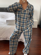 DAZY Cute Bear Pattern Plaid Fabric Loose Pajama Set
