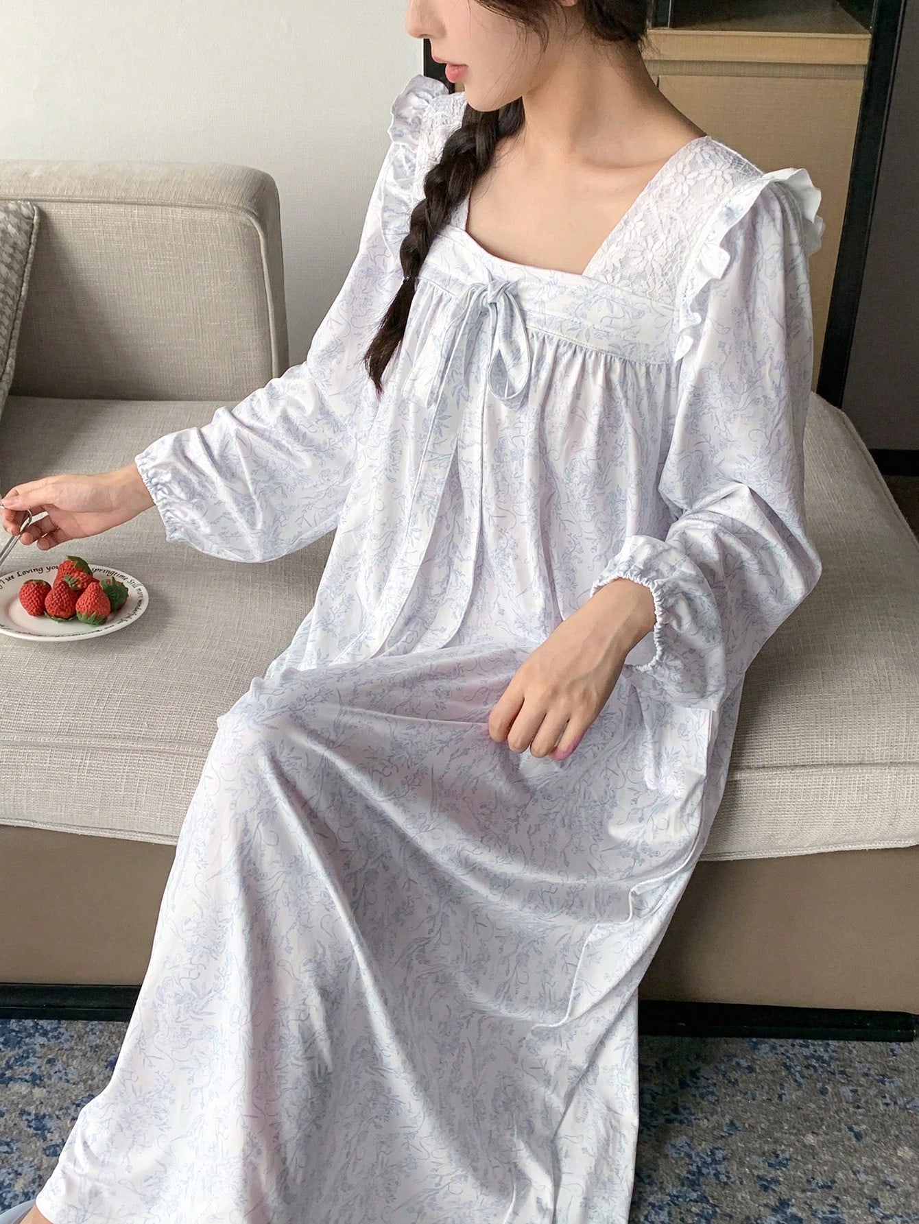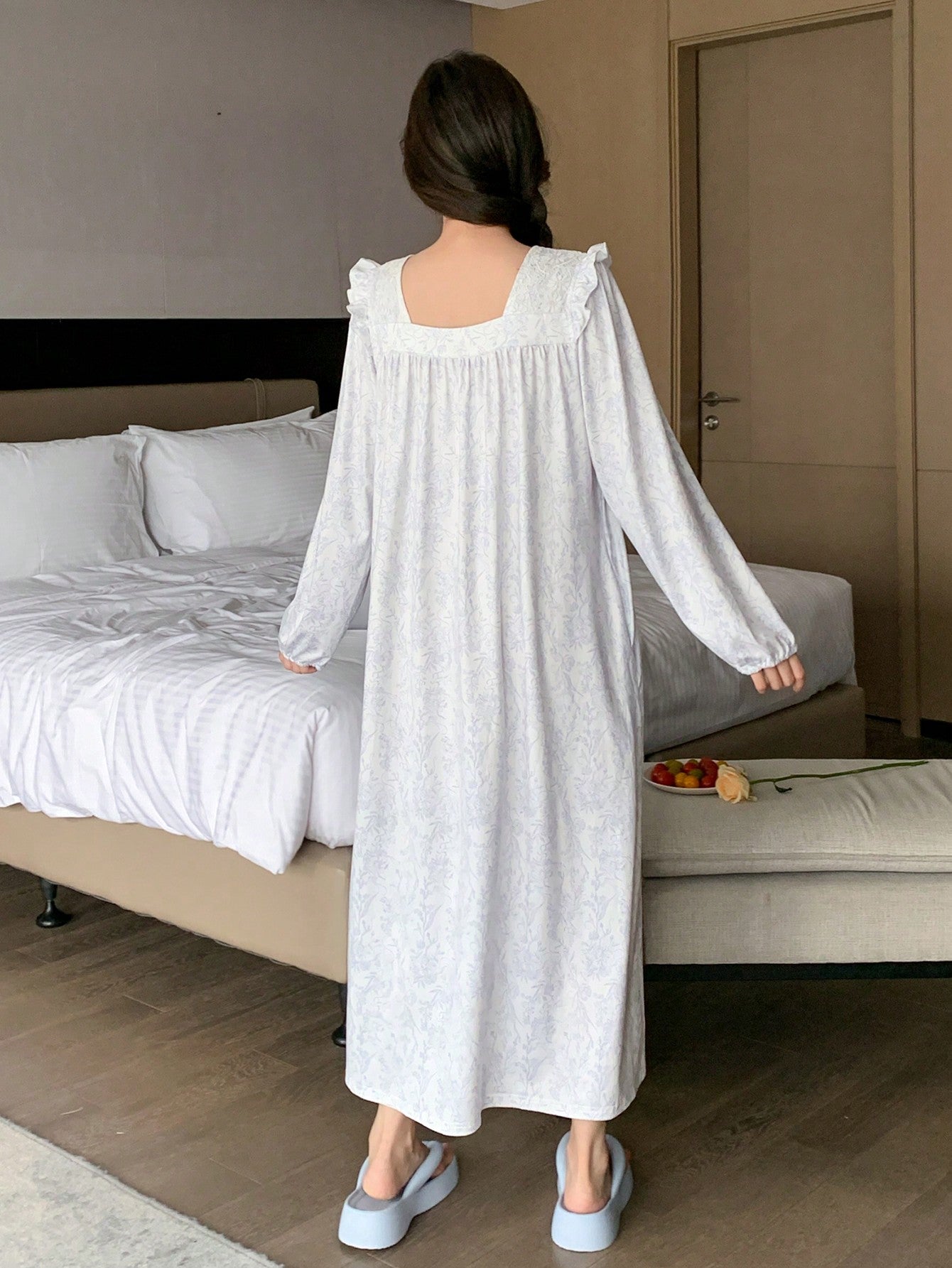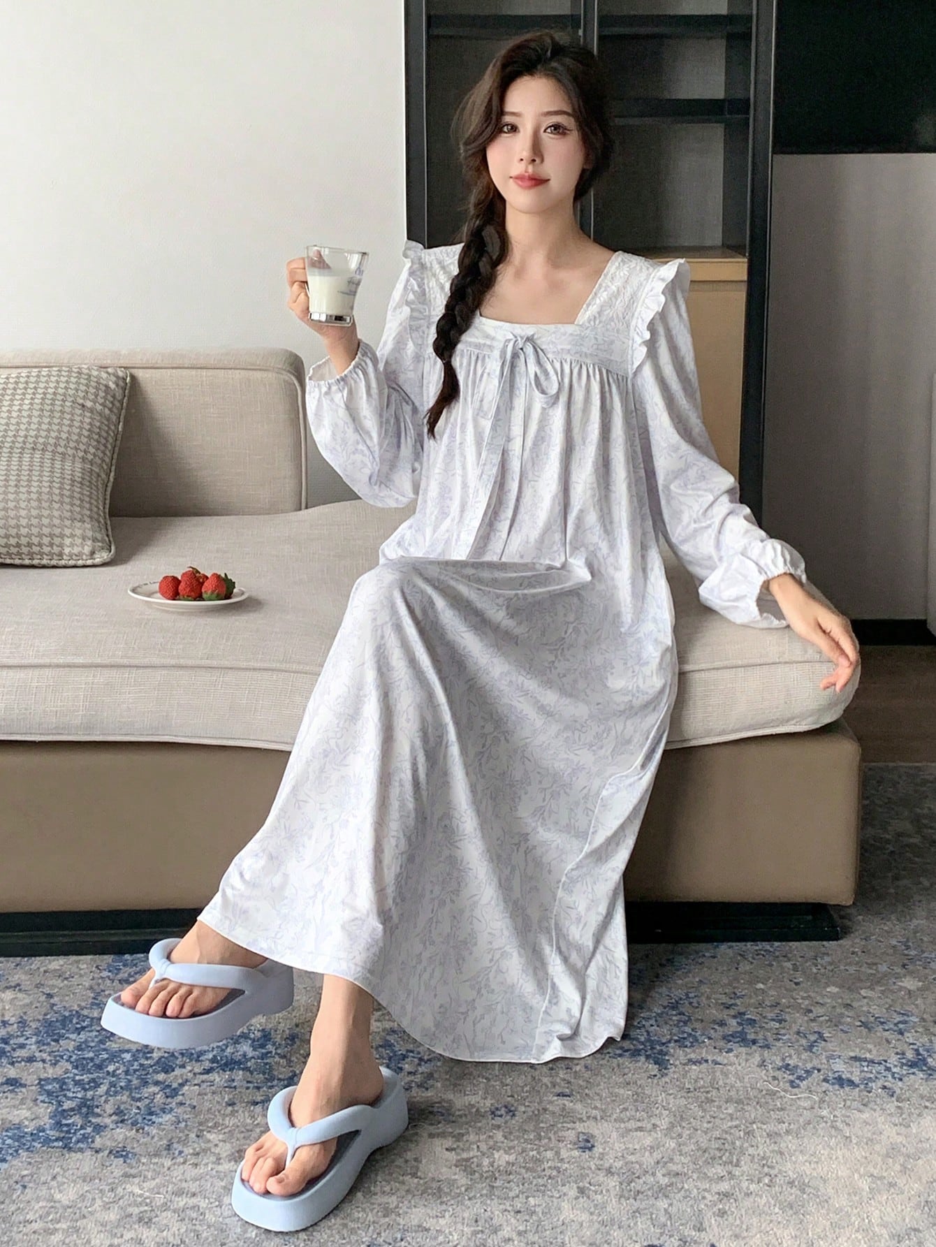 DAZY Floral Line Drawing Printed Ruffle Square Neck Sleep Dress