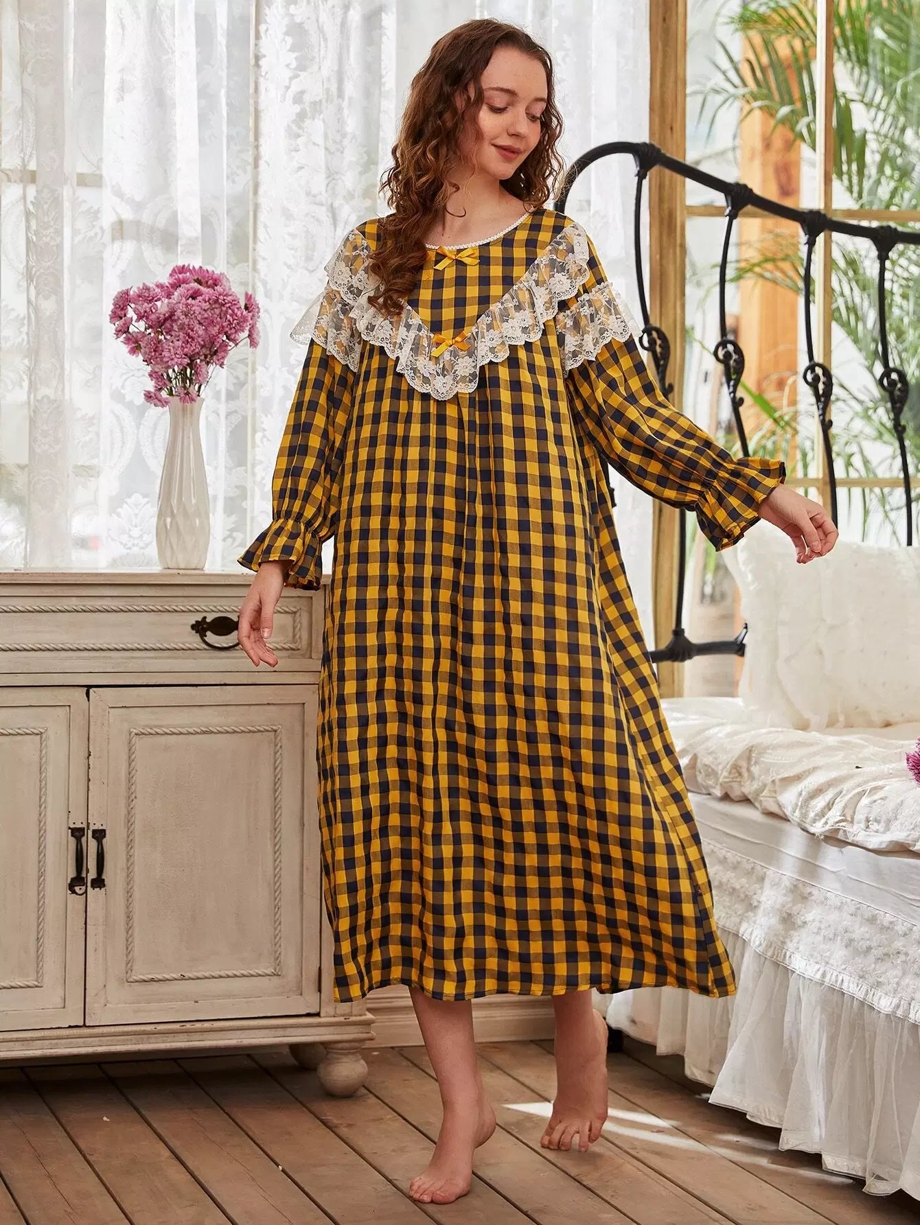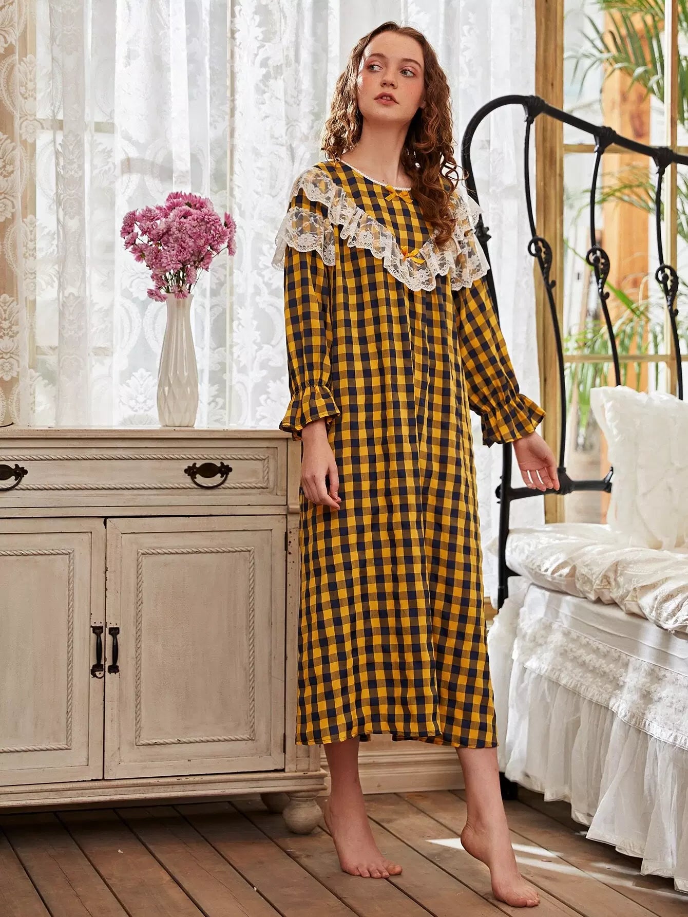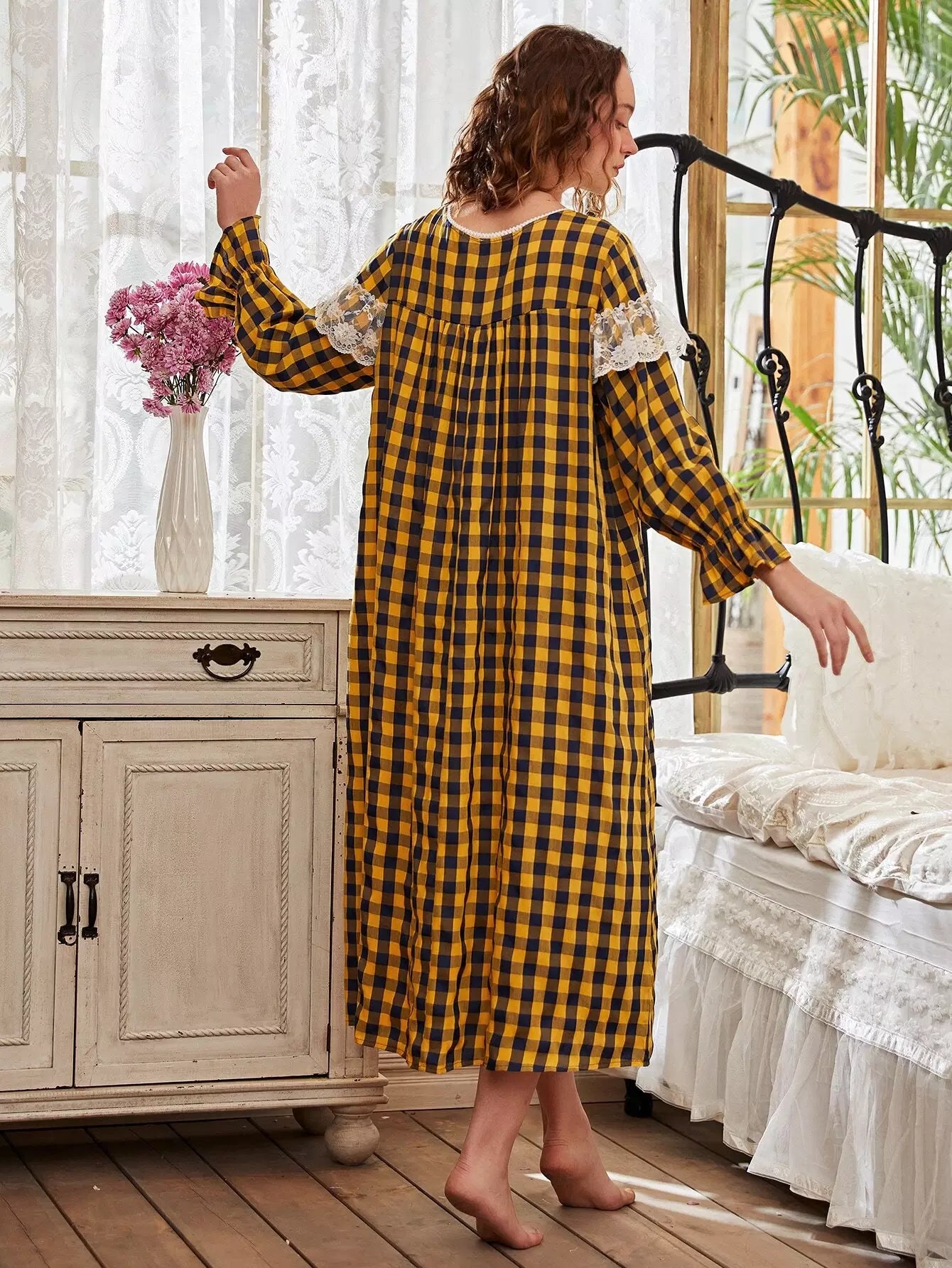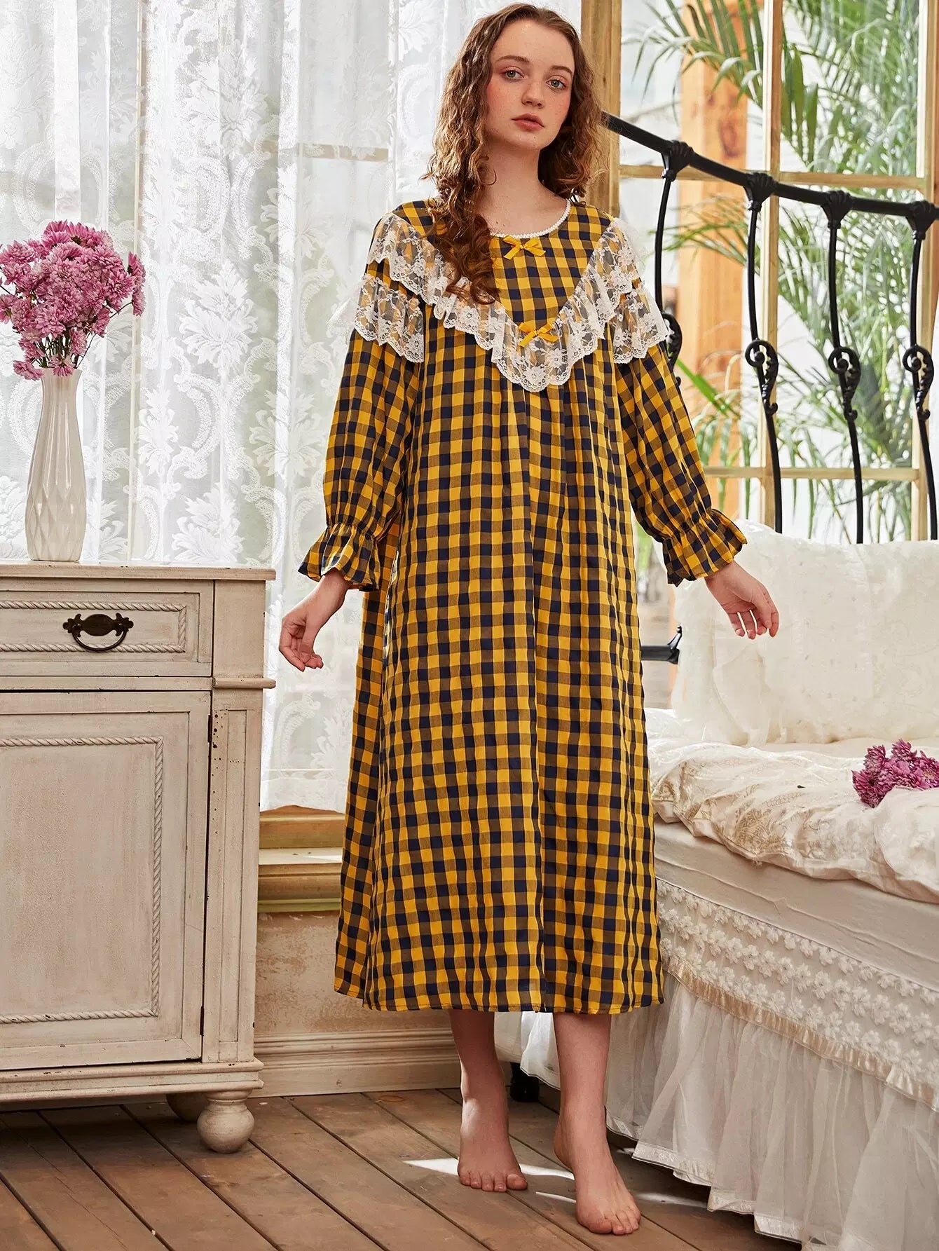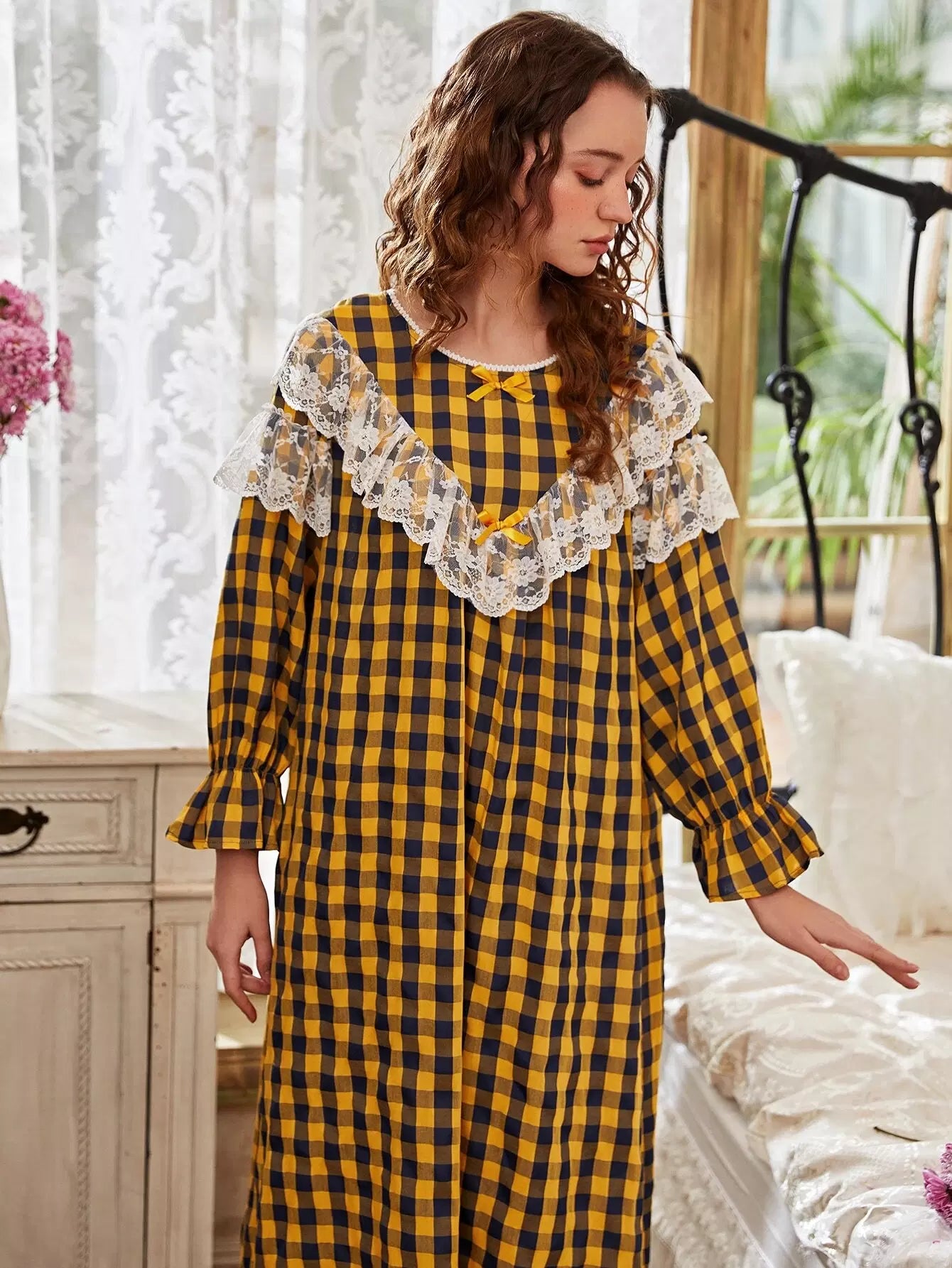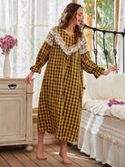 Lace Panel Gingham Flounce Sleeve Night Dress