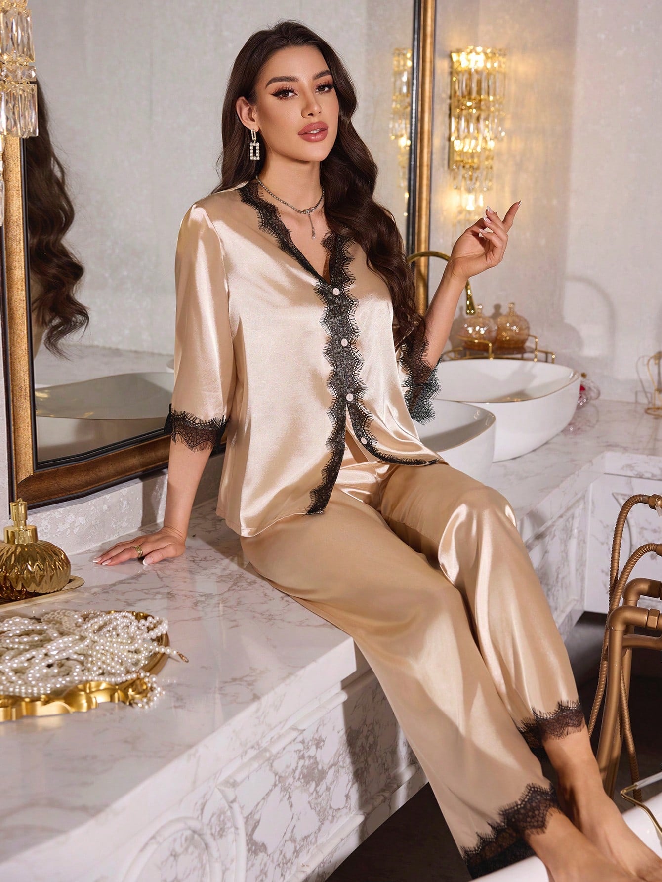 LuxeNights Women's Elegant Faux Silk Sleepwear Set With Lace Patchwork And V Neck Front Button