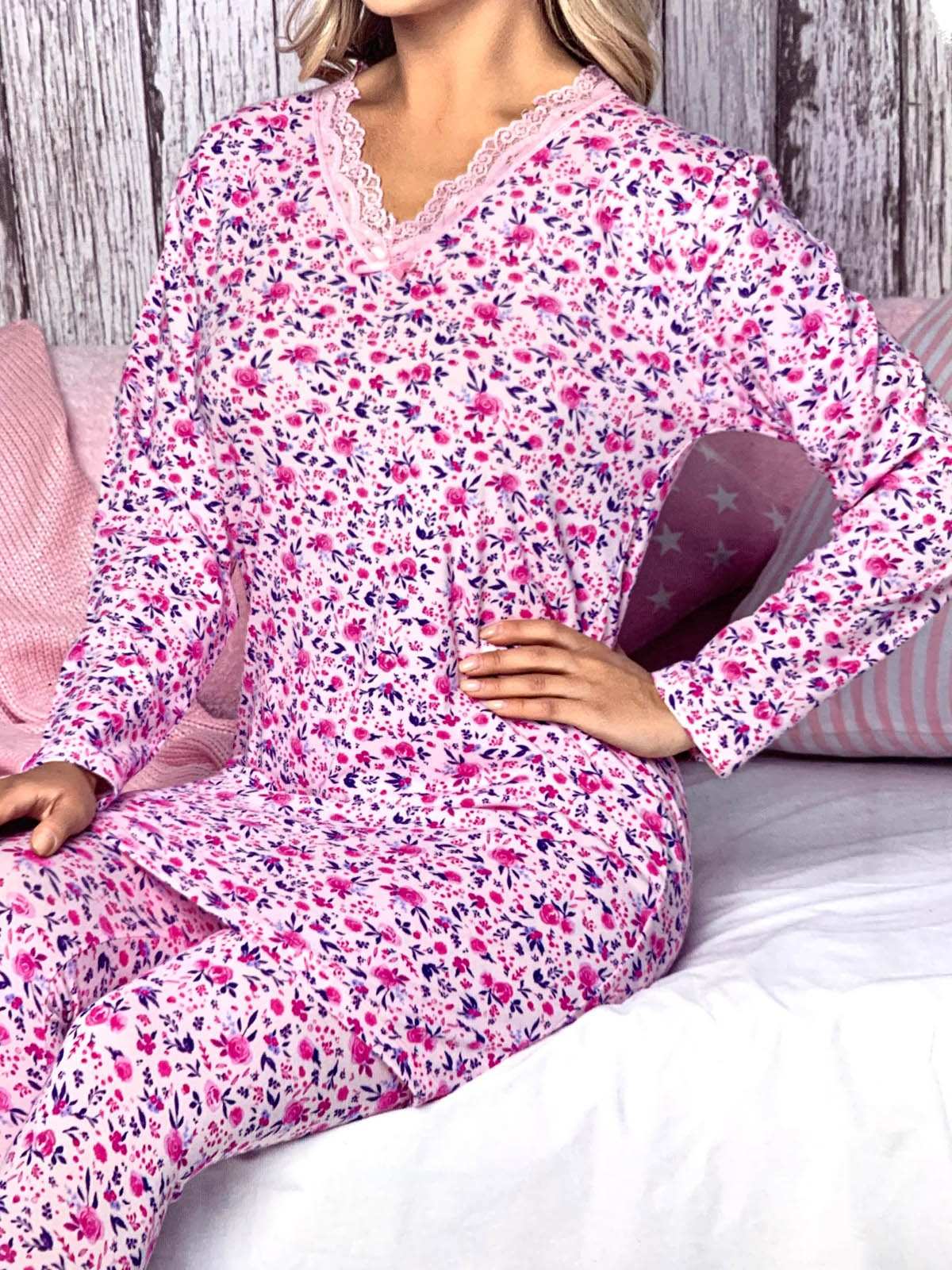 Pink pajama with blue and red floral print