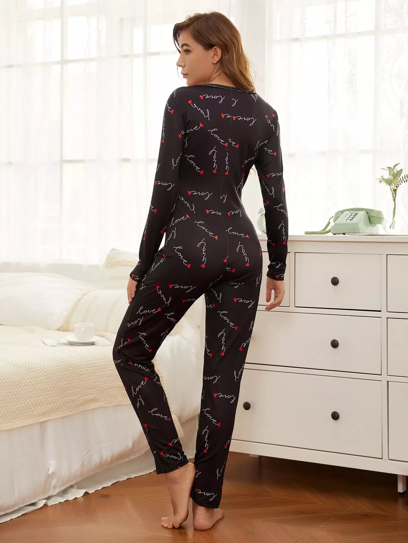 Plunging Neck Letter And Heart Print Pajama Jumpsuit