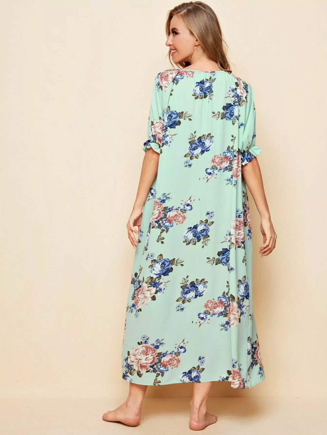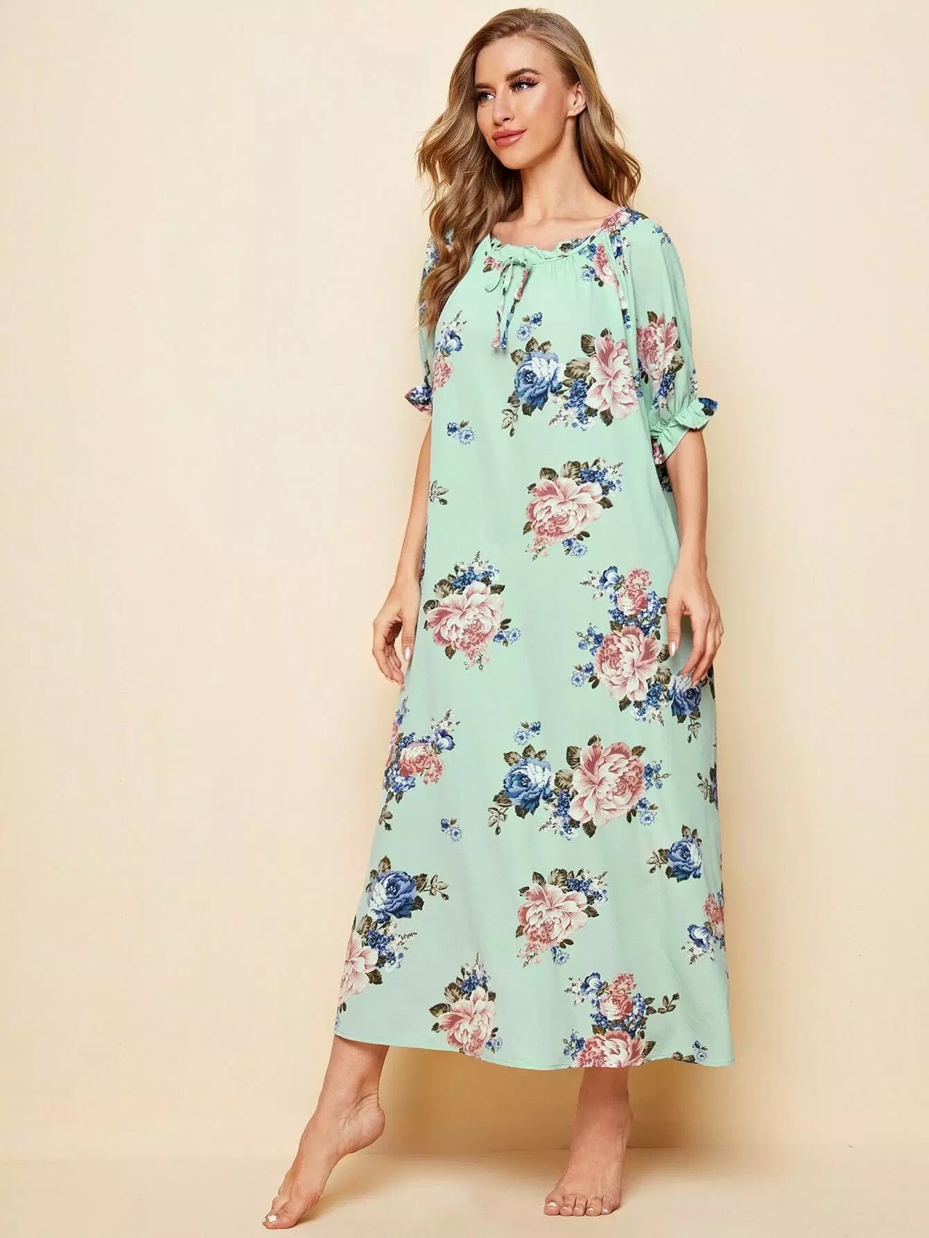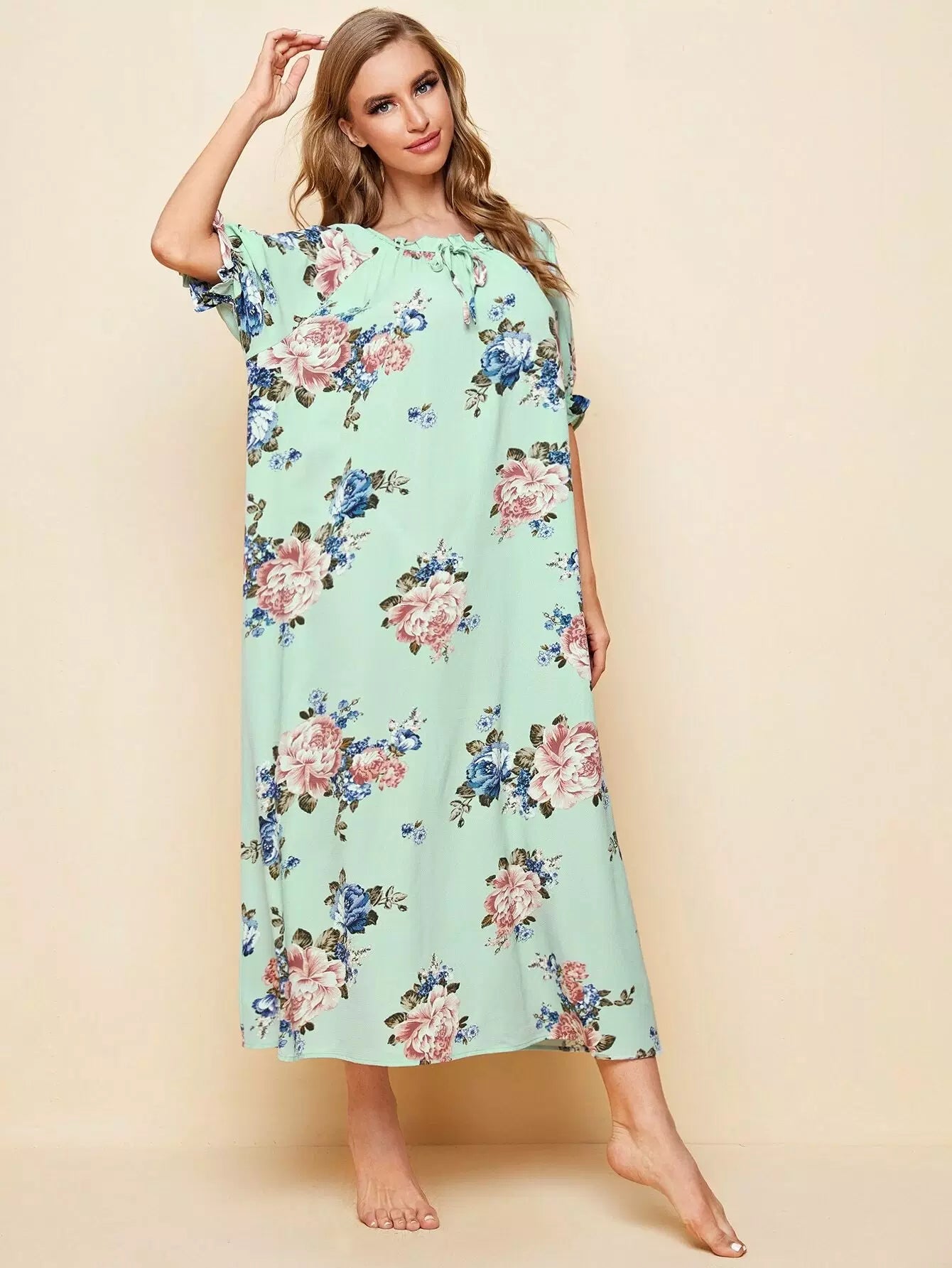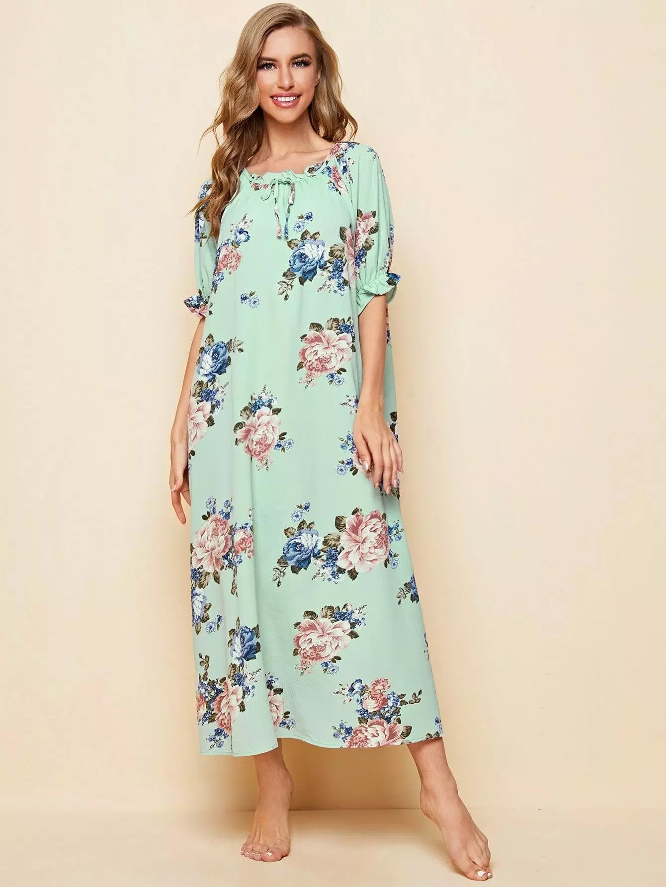 Raglan Sleeve Ruffle Trim Knot Front Floral Nightdress