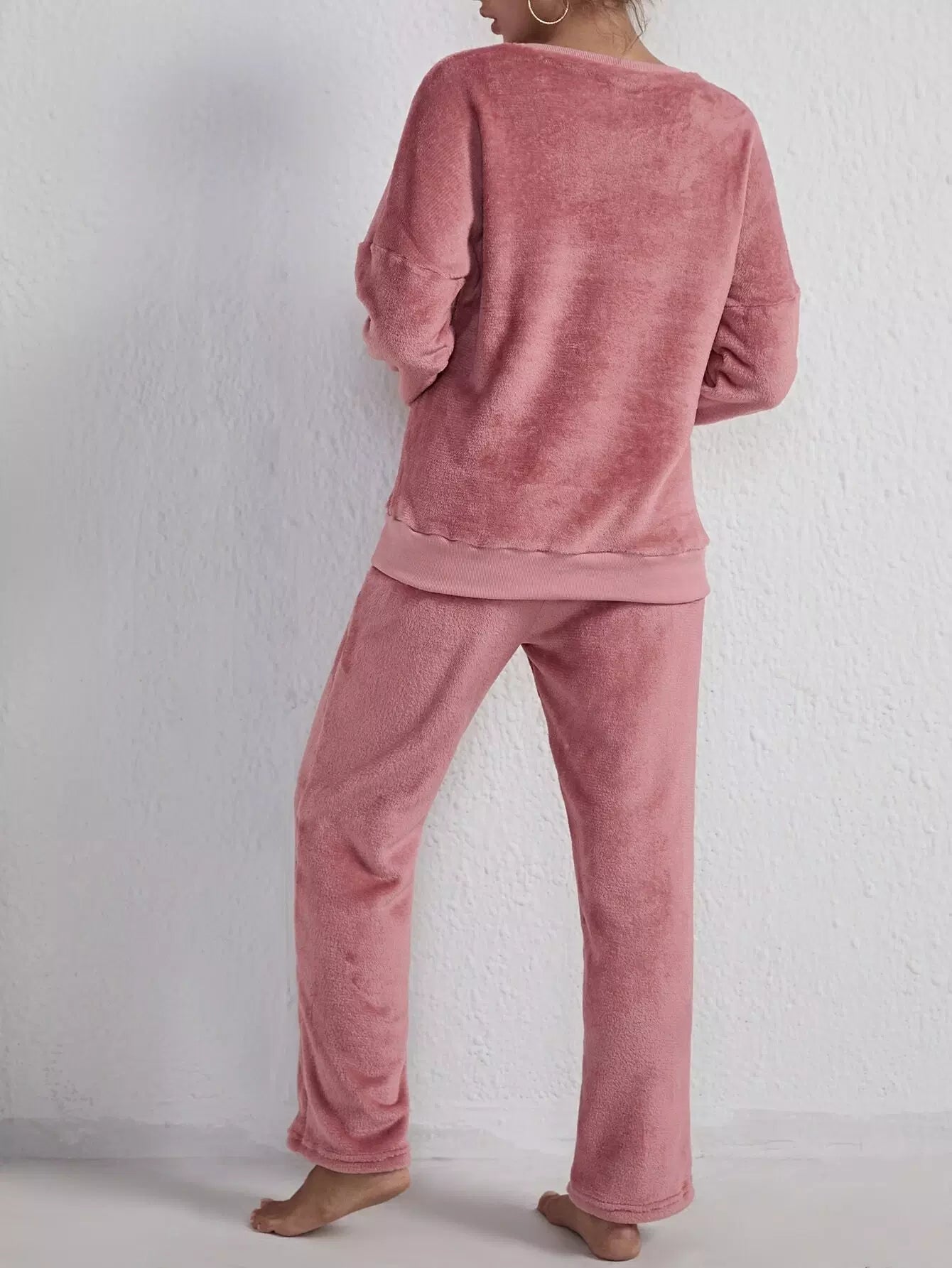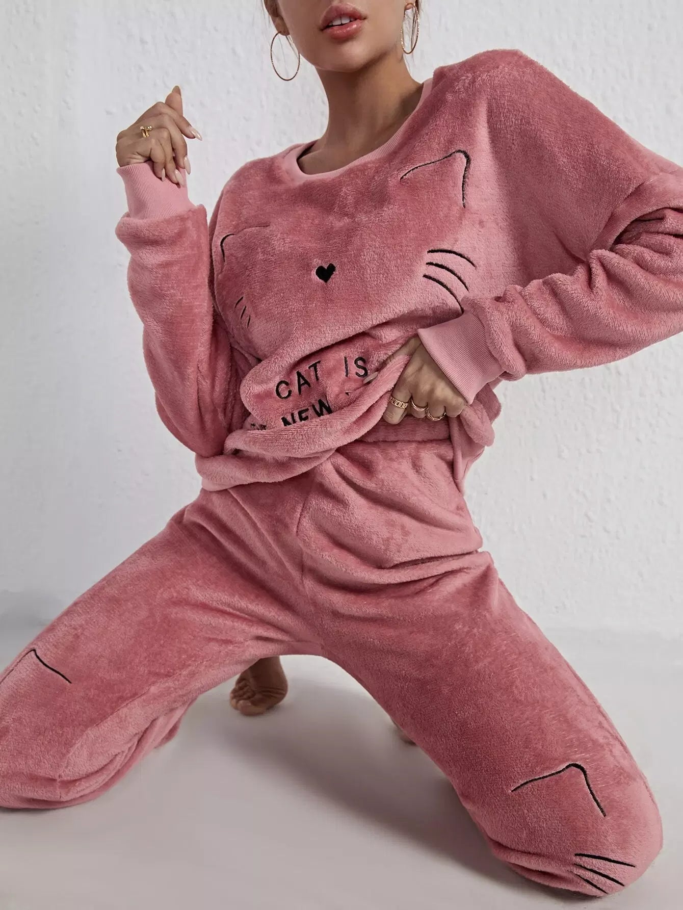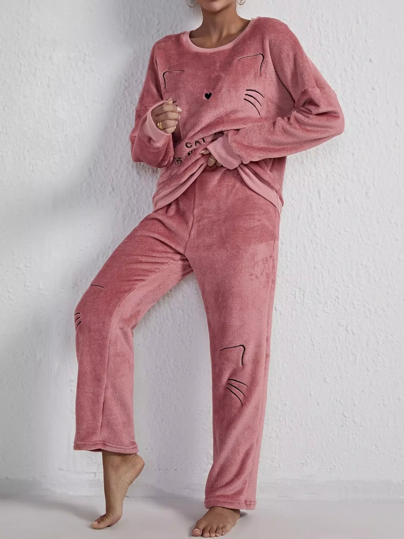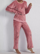 Slogan & Cartoon Embroidery Drop Shoulder Flannel PJ Set