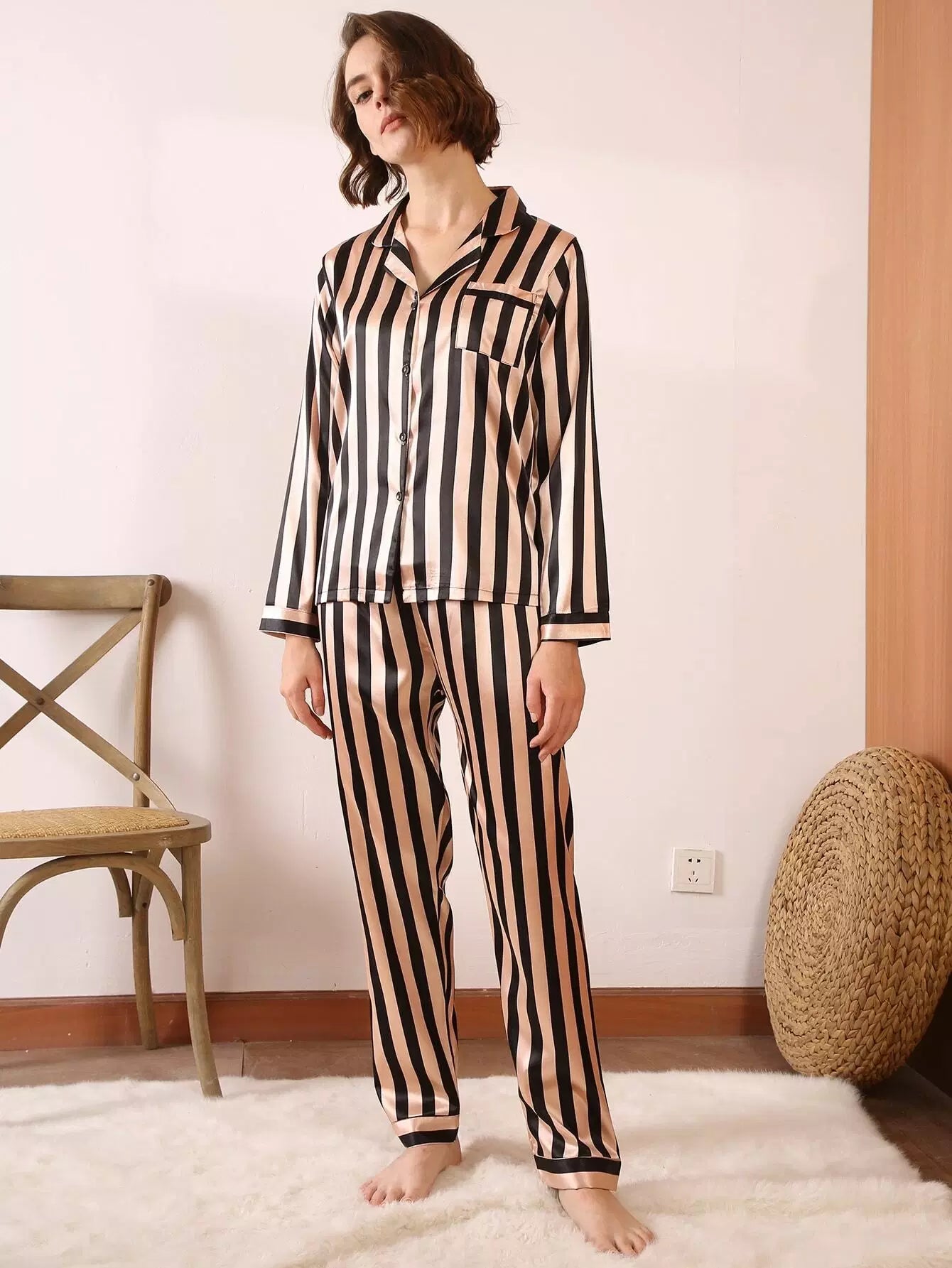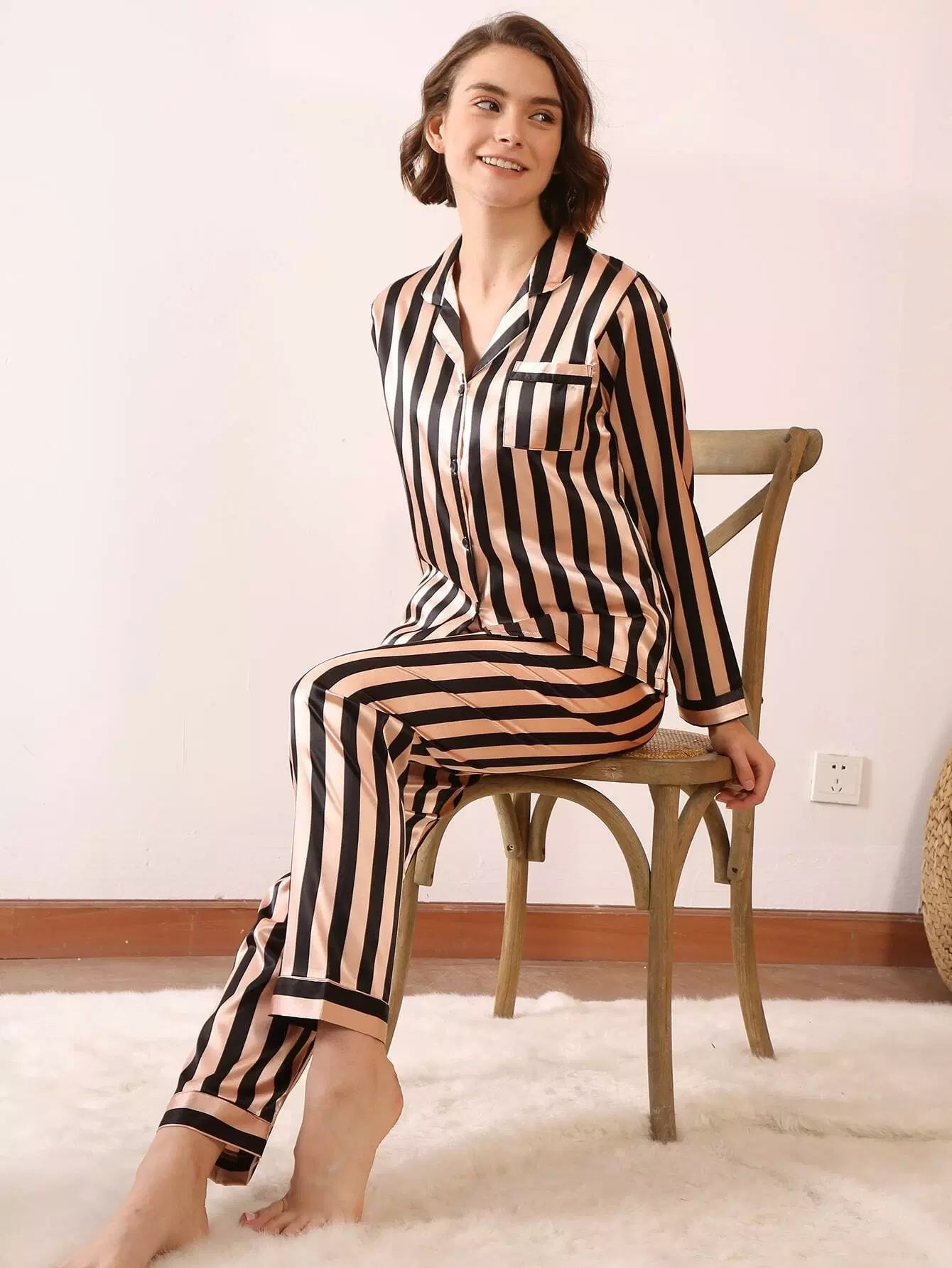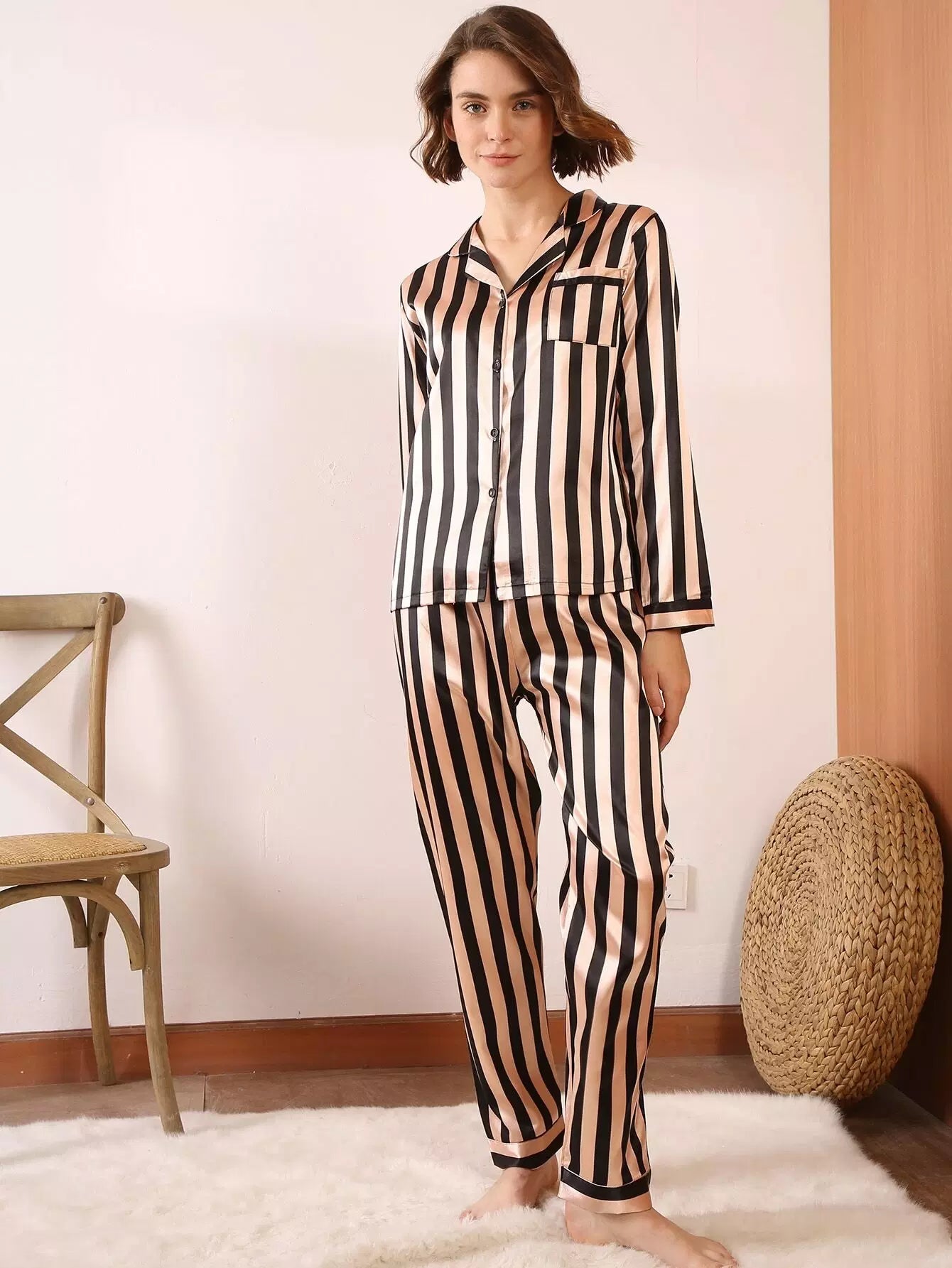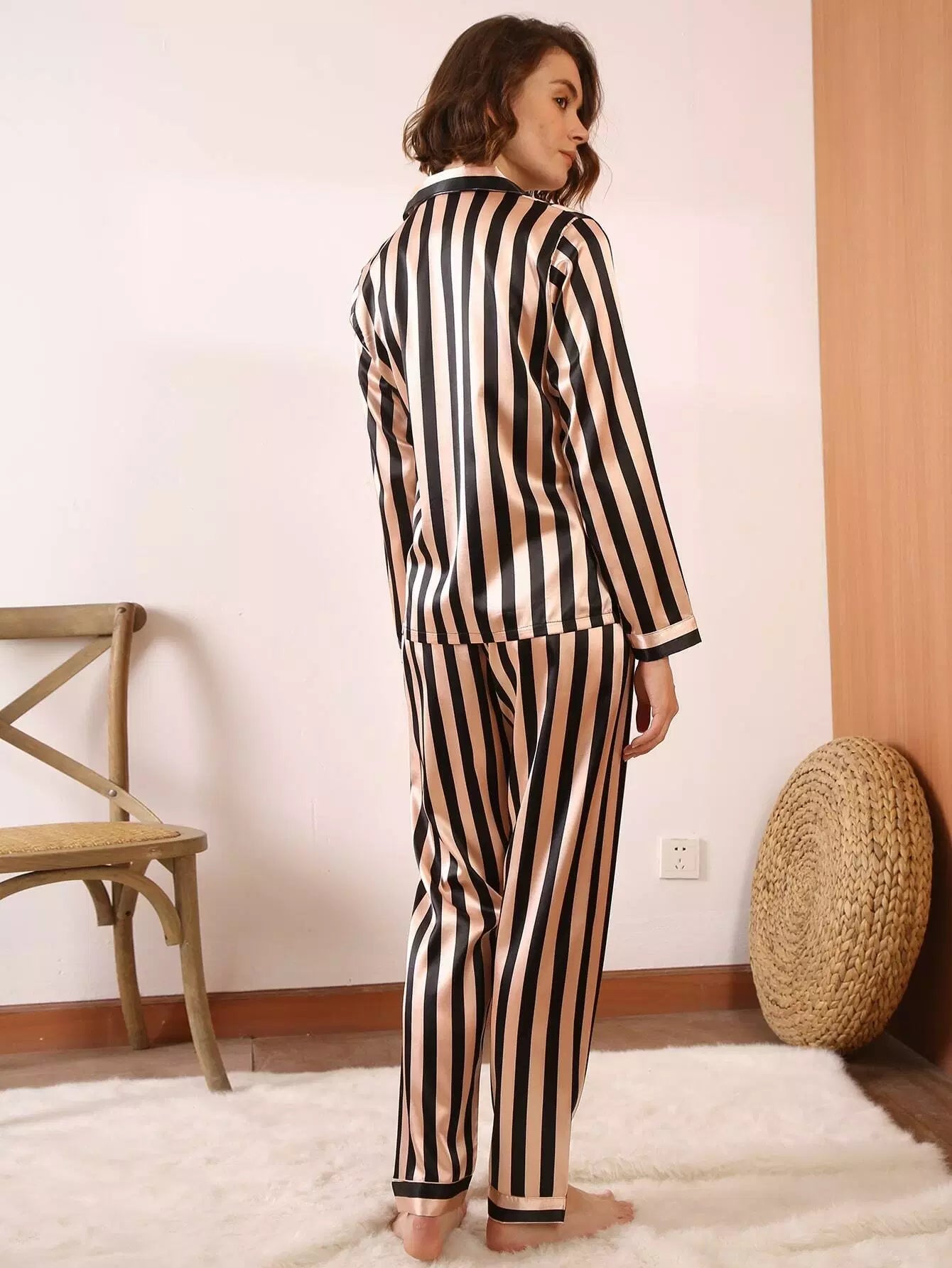 Striped Button-up Satin Pajama Set