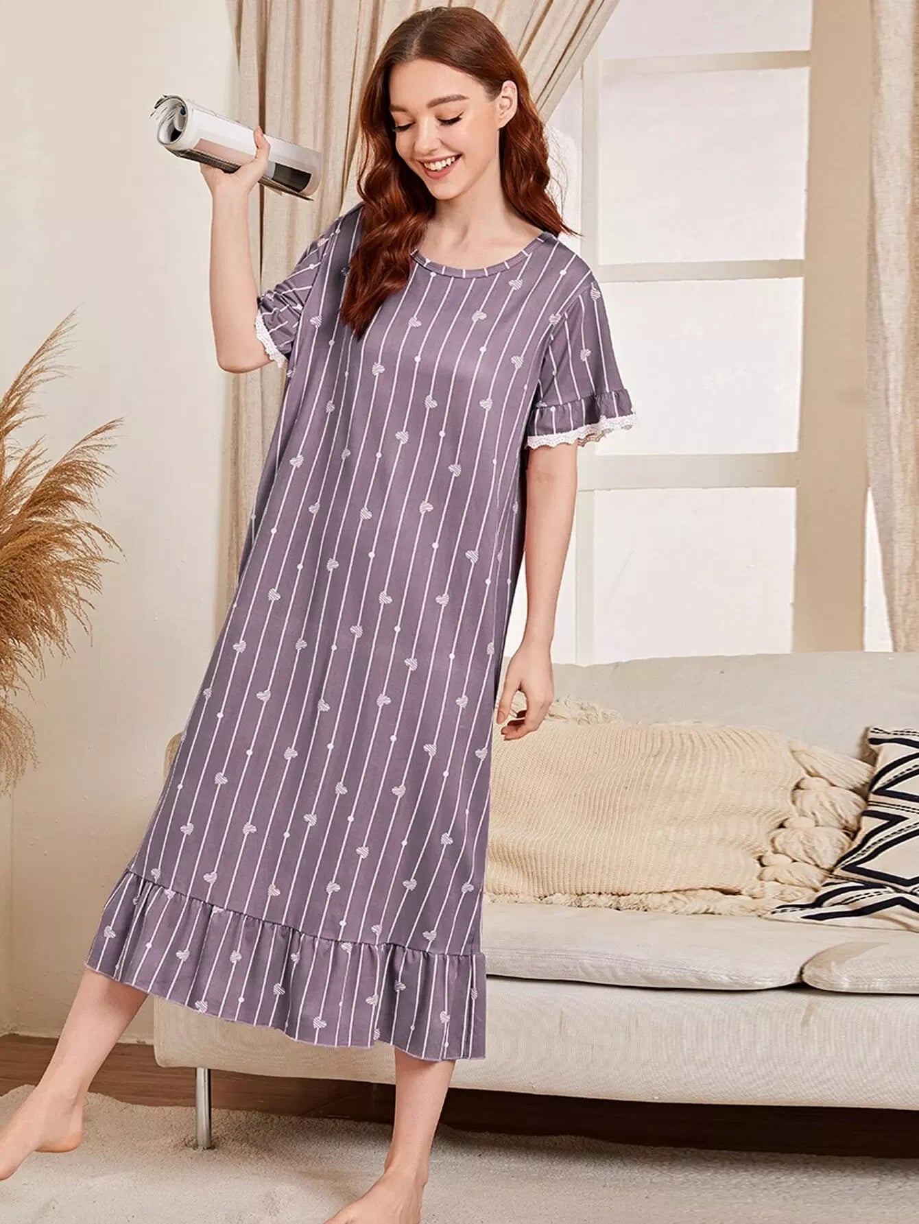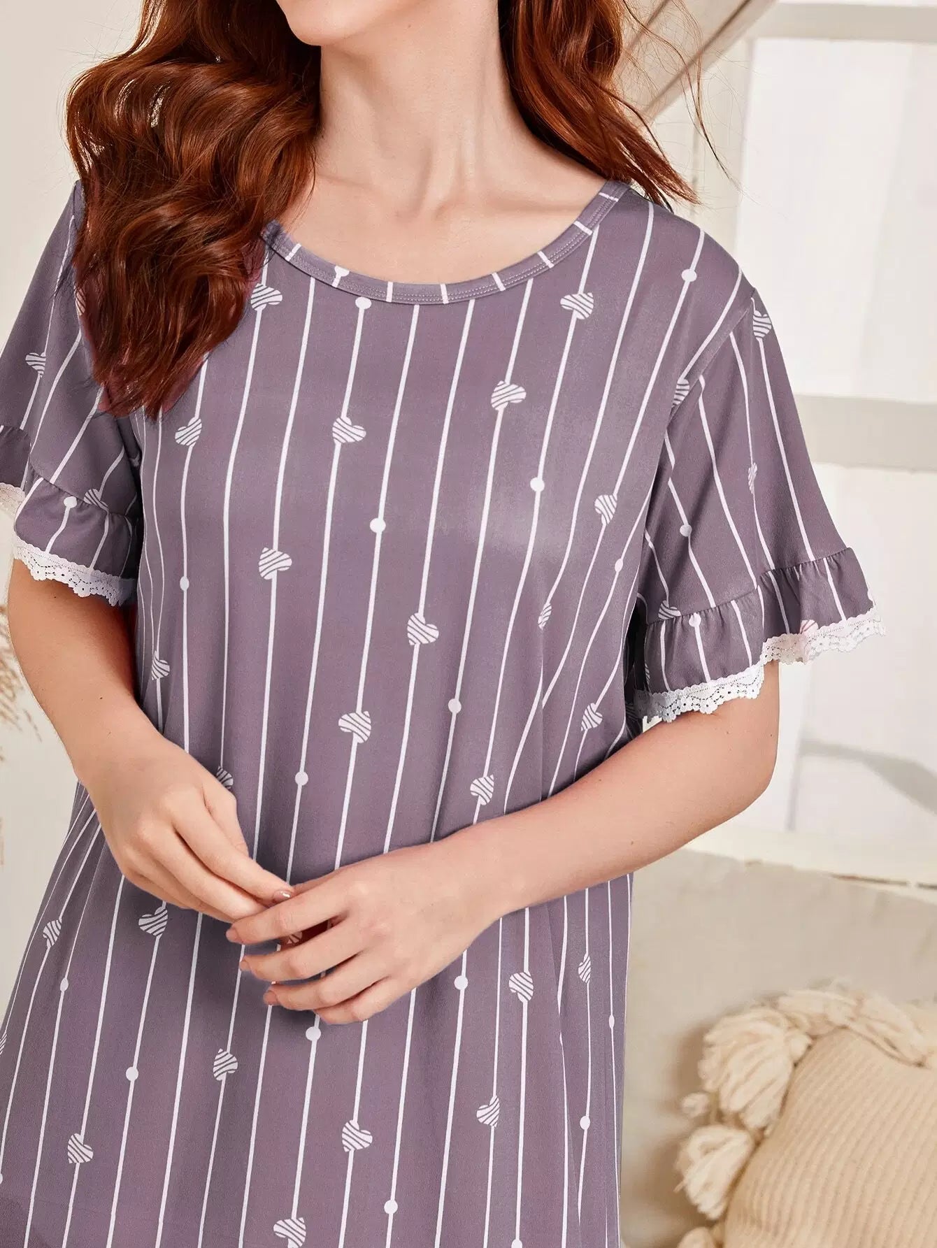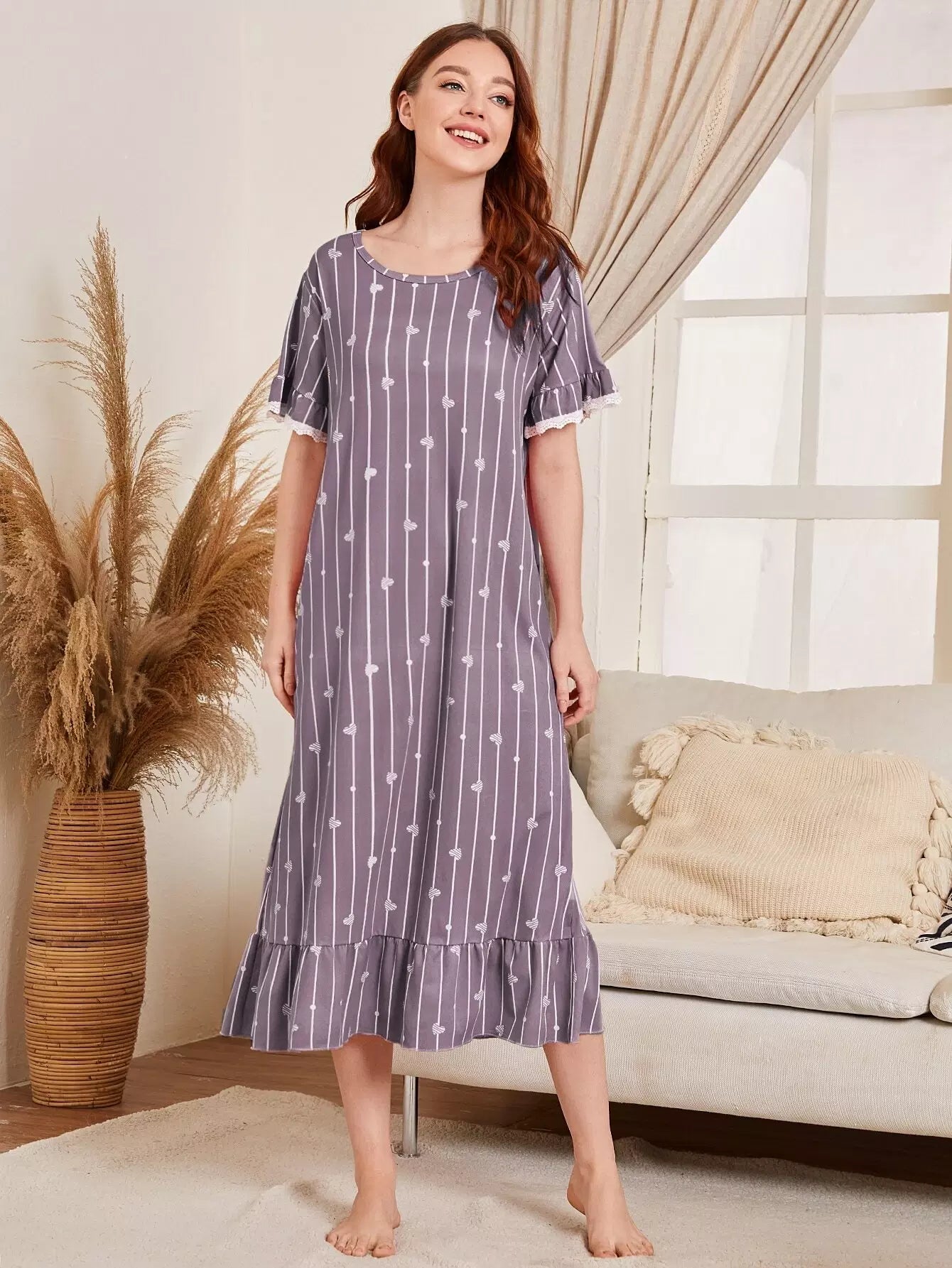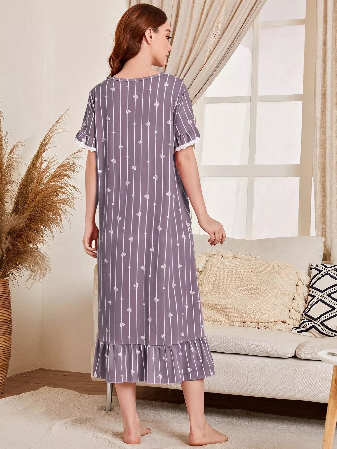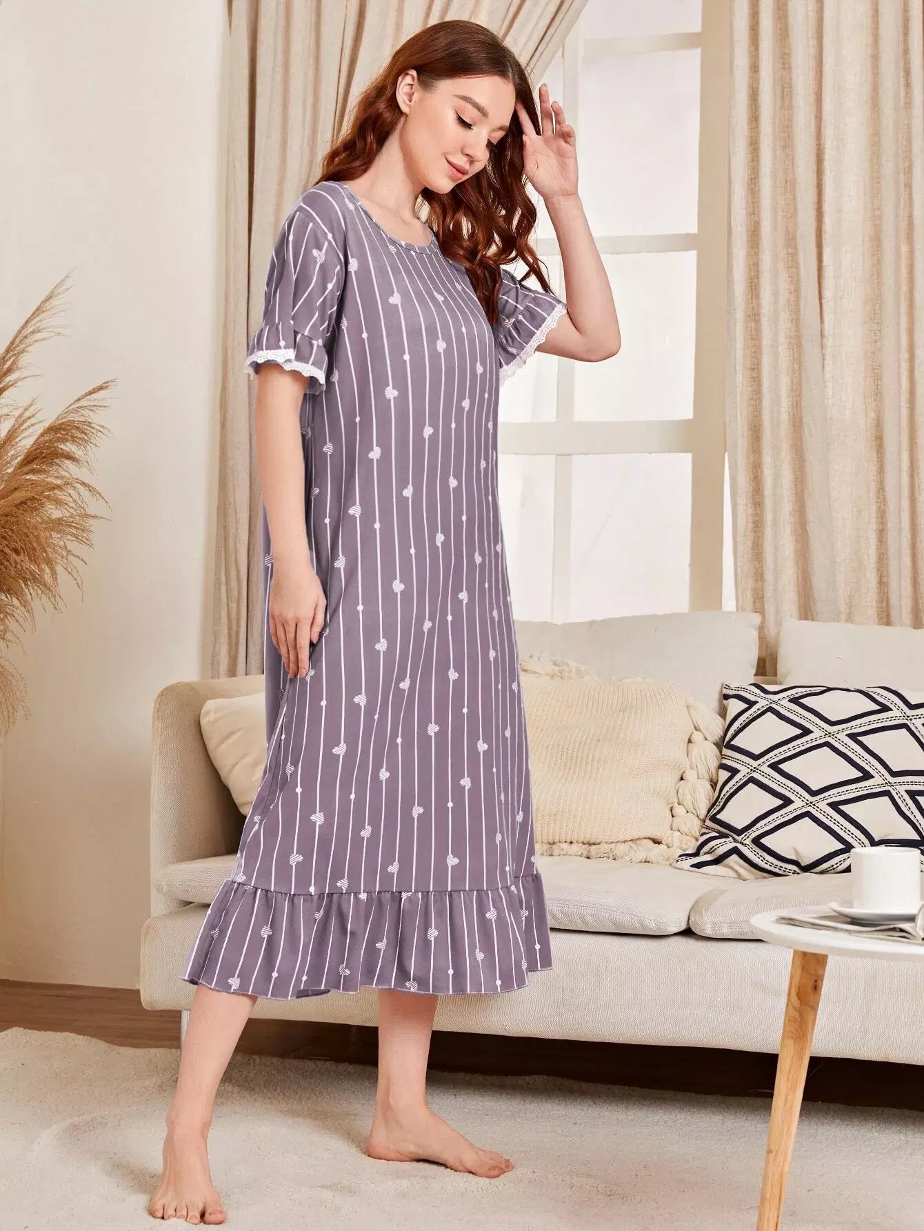 Striped & Heart Print Ruffle Hem Night Dress